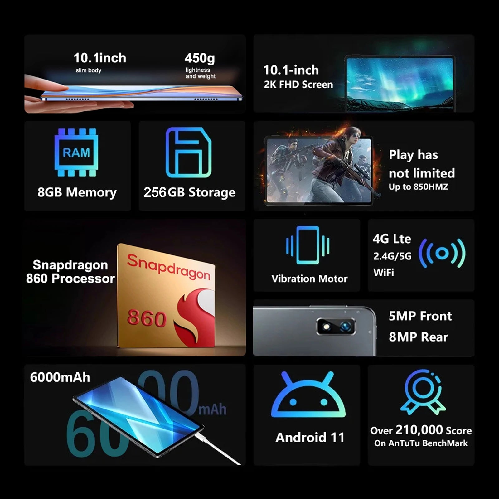 Original Tablet 10 Pro 10.1-inch HD Display 8GB+256GB Android 11 Face Unlocked 6000mAh Large-capacity Battery Snapdragon 860
