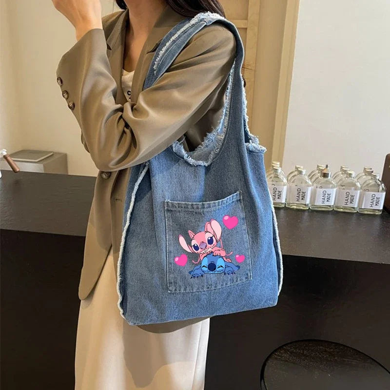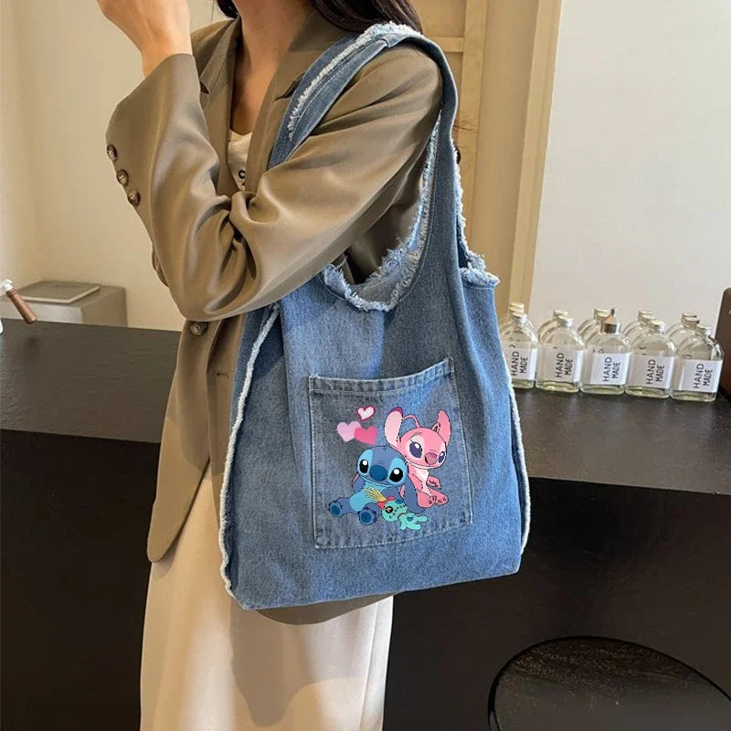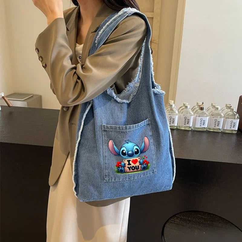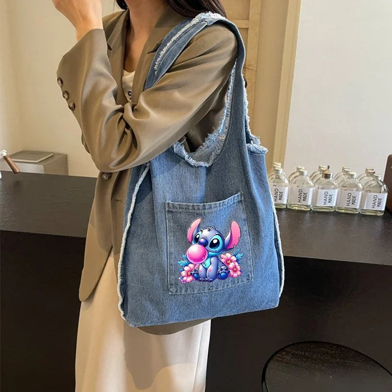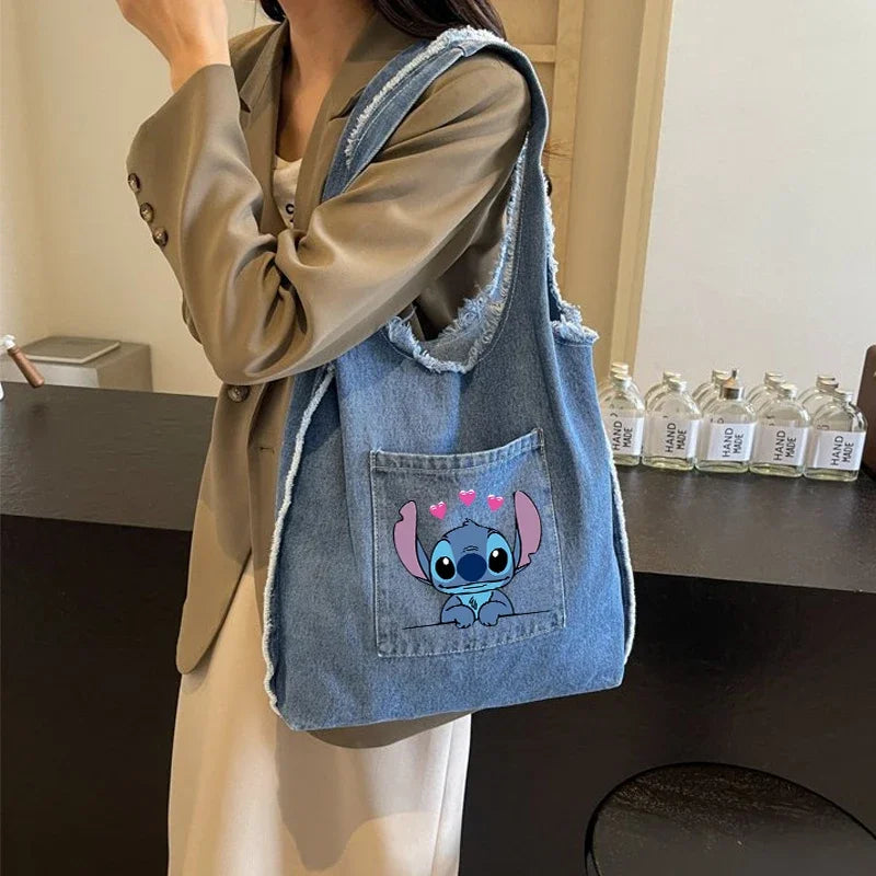 Disney Stitch Fashion Retro Denim Bag Women Anime High-capacity Shoulder Bag Female Students Commute Handbag Popular Tote-bag