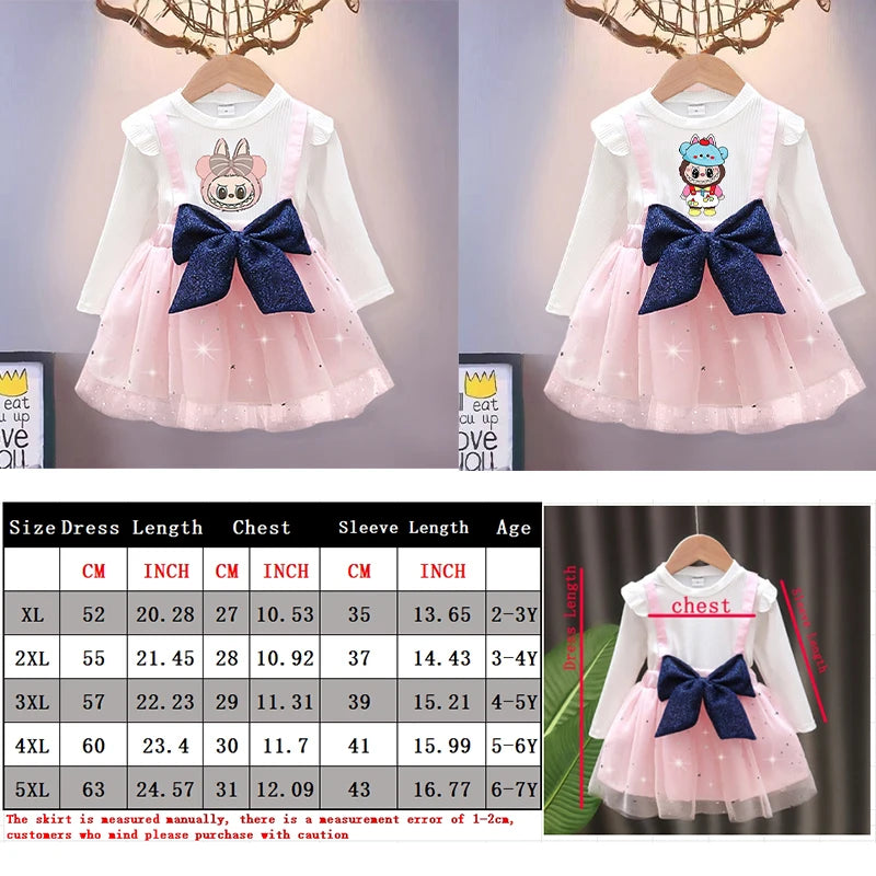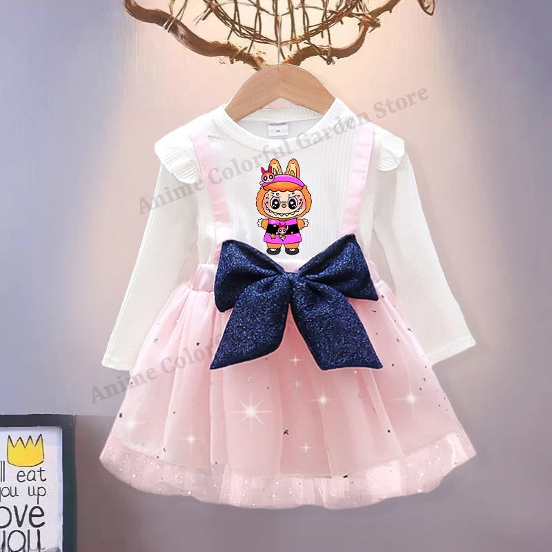 Labubu Sweet Mesh Dress with Bow for Girls Anime Cartoon Cute Suspender Skirt Children Spring Fashion Fake Two Dresses Gifts
