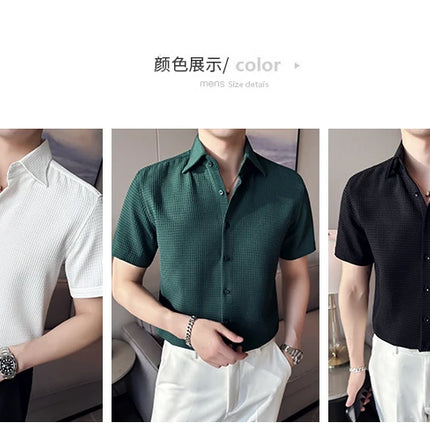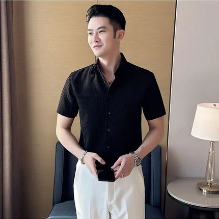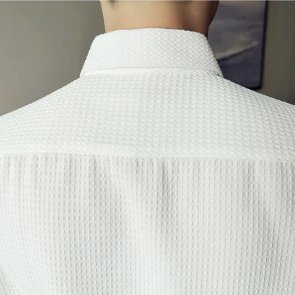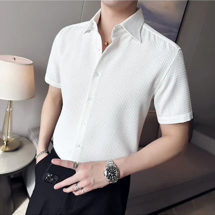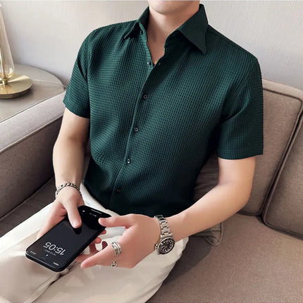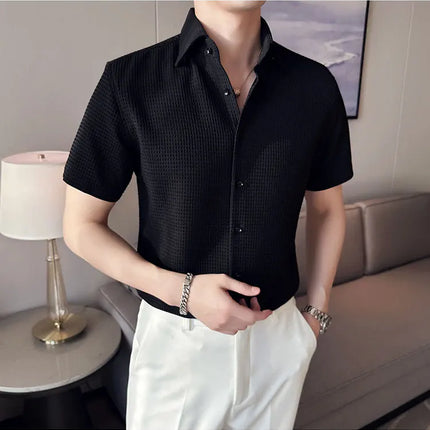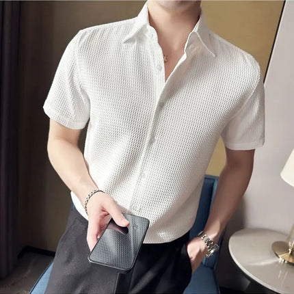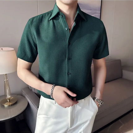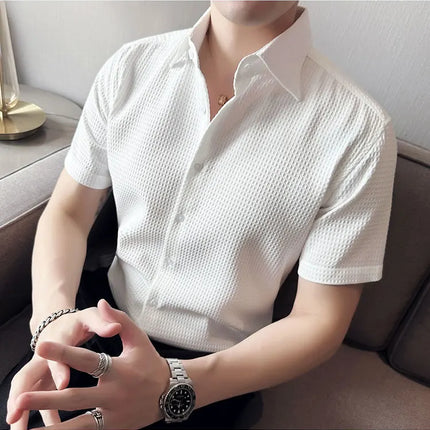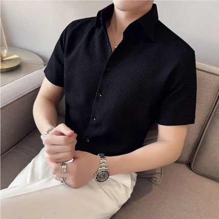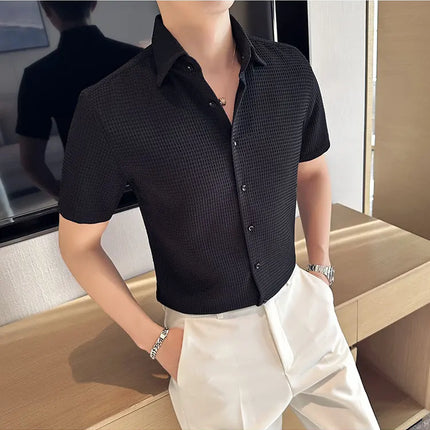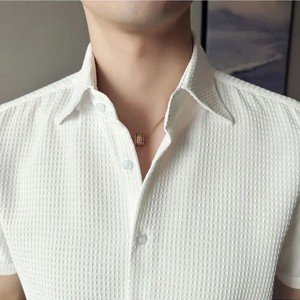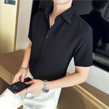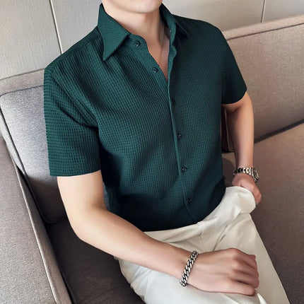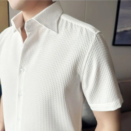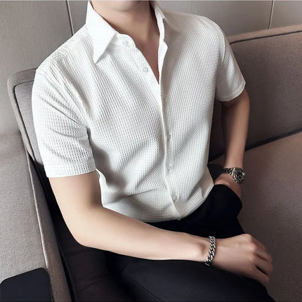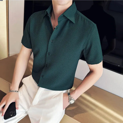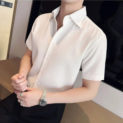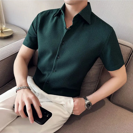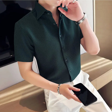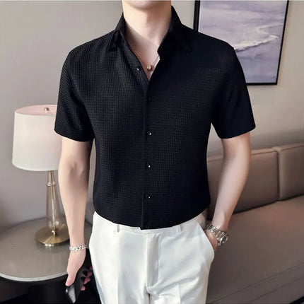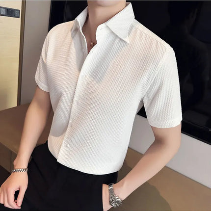 2023 Summer Waffle Short Sleeved Shirt Men Fashion Casual Solid Color Lapel Loose Shirt Male Korean Social Business Dress Blouse