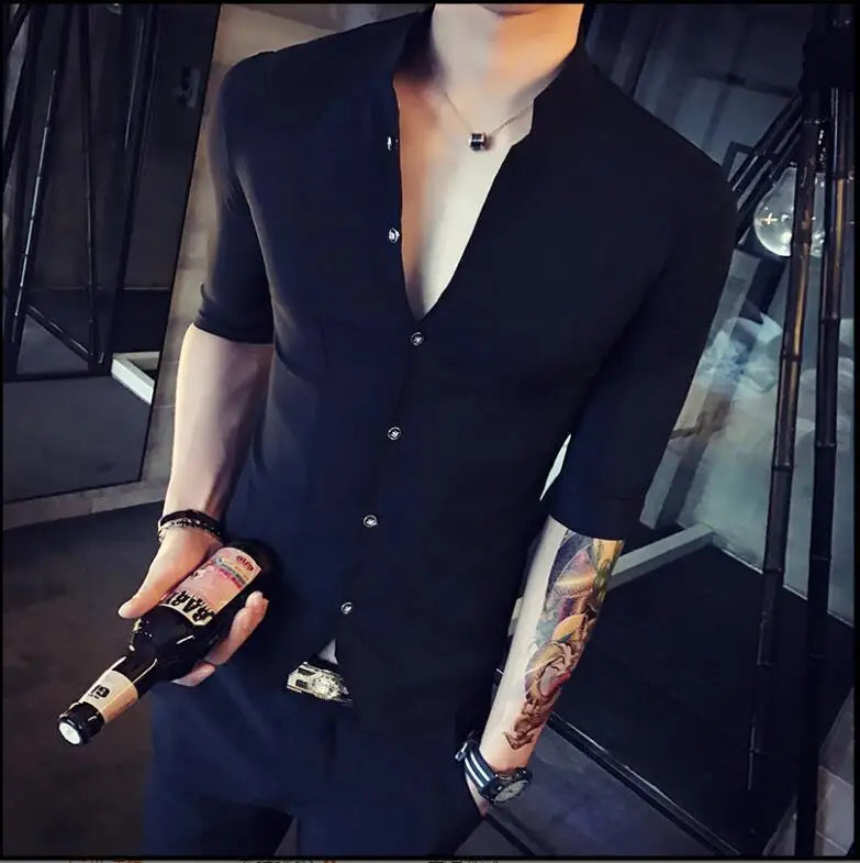 2024 Summer Fashion Stand Collar Chinese Style Shirt Men Solid Color Slim Fit Half Sleeve Dress Shirts Designer Club Prom Shirt