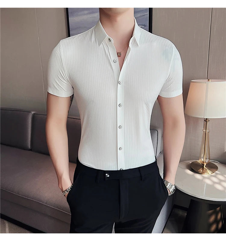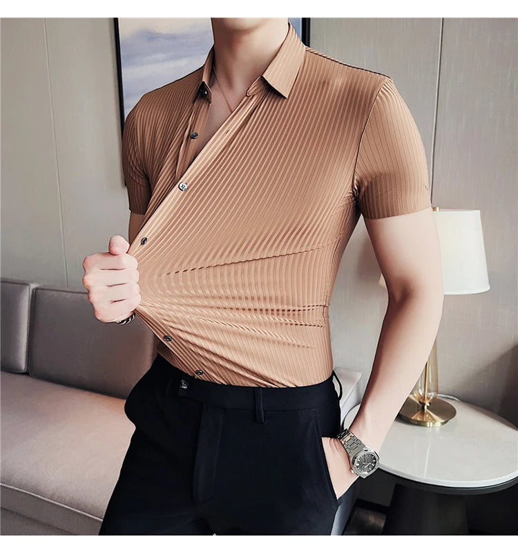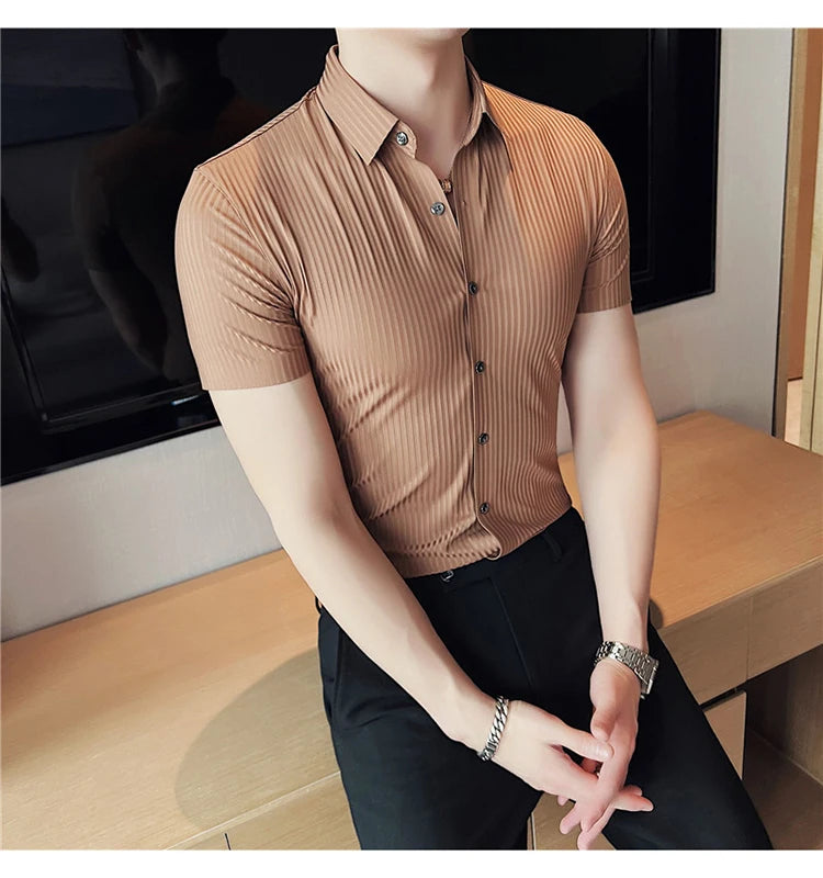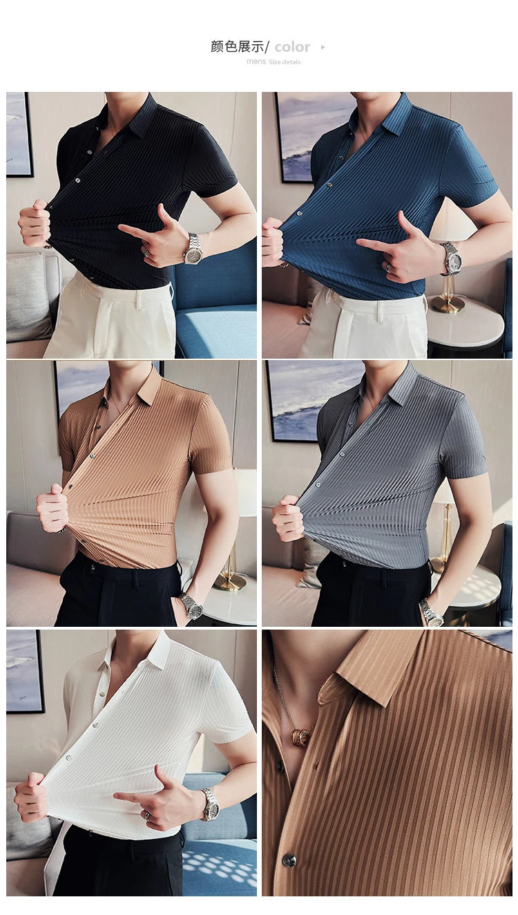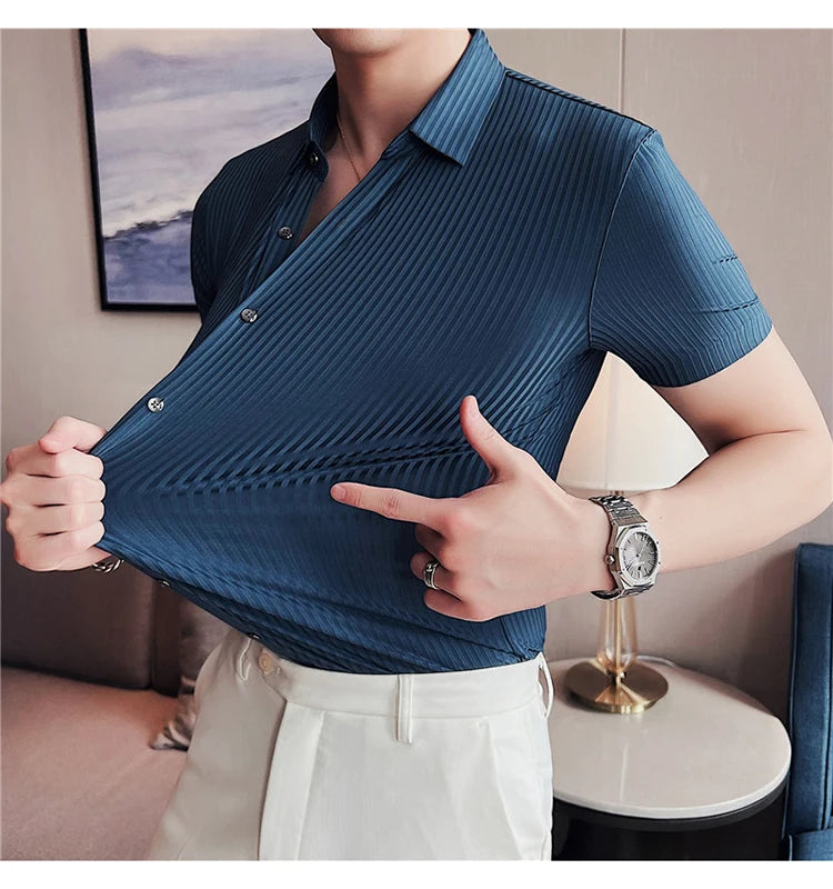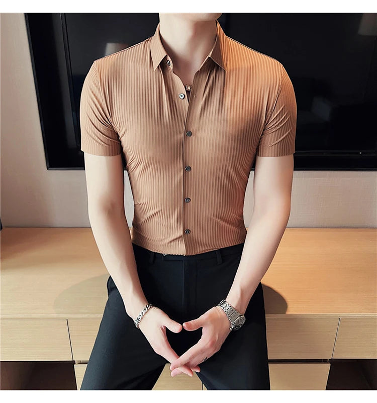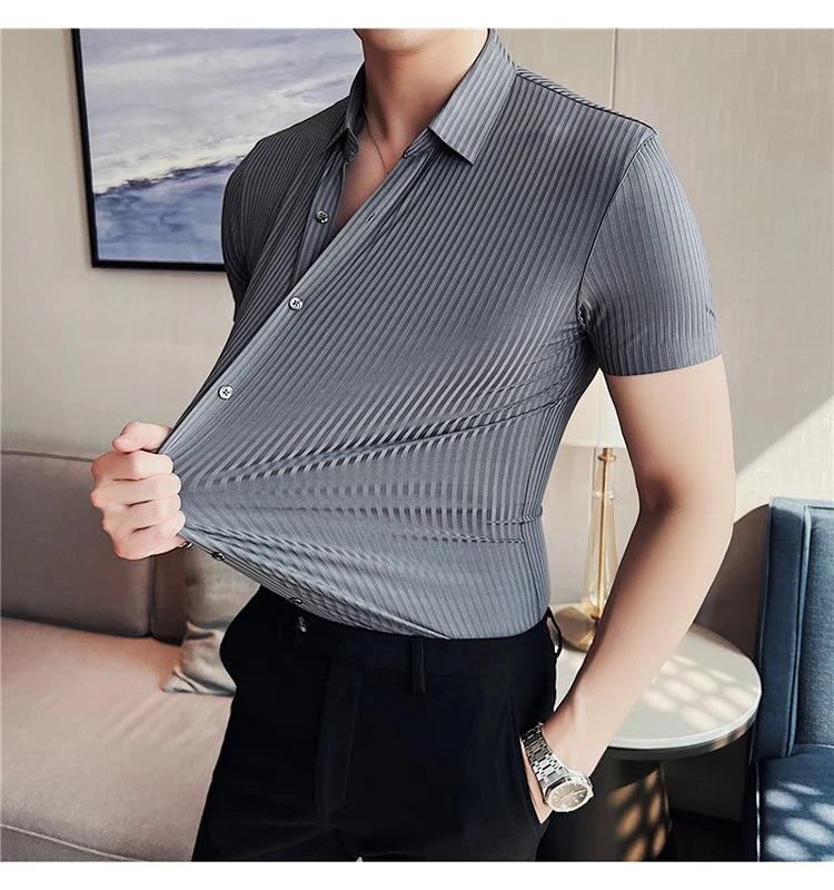 2024 Summer High Elasticity Seamless Short Sleeve Shirts Fashion Stripes Men Business Formal Wear Slim Fit Casual Dress Shirt