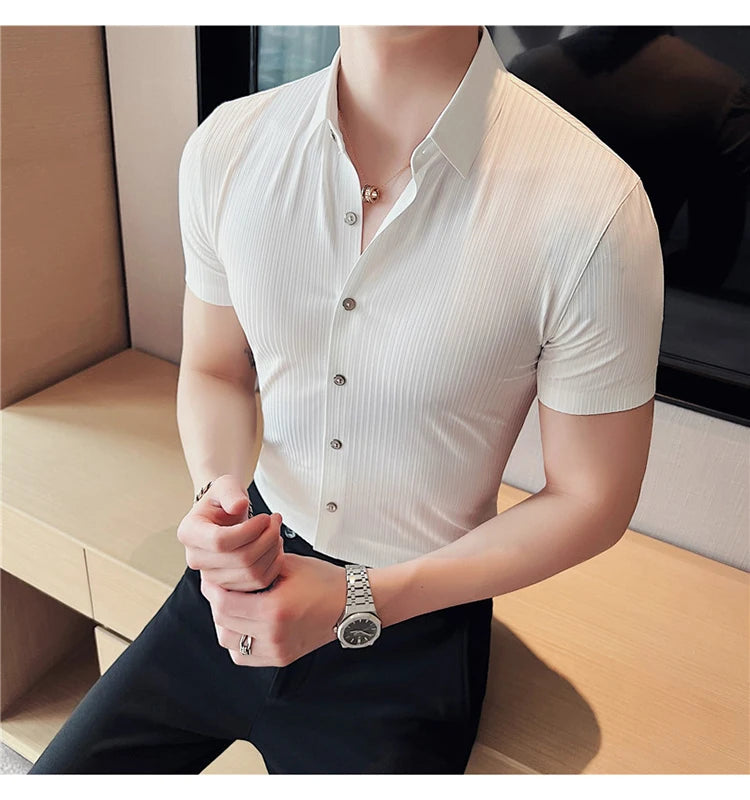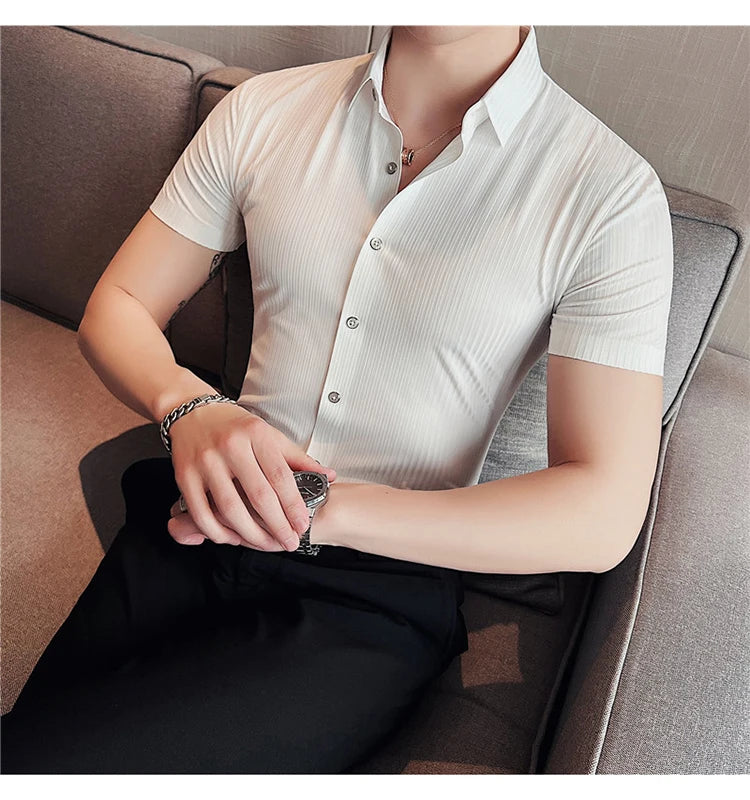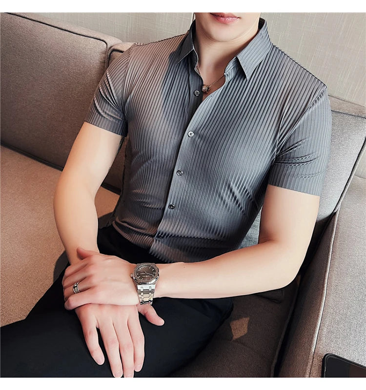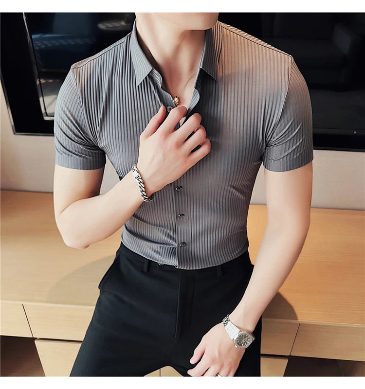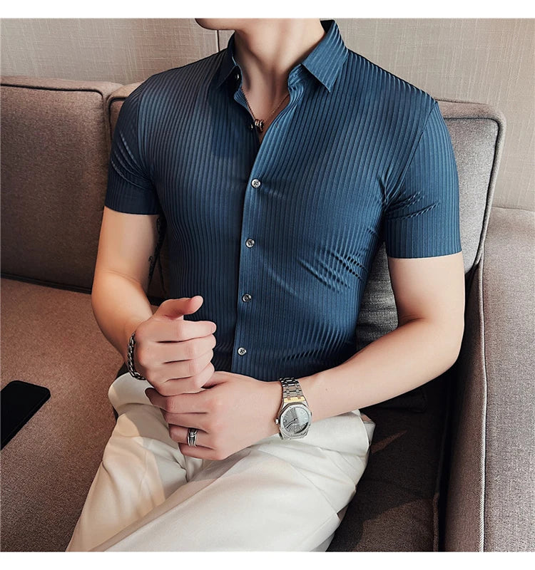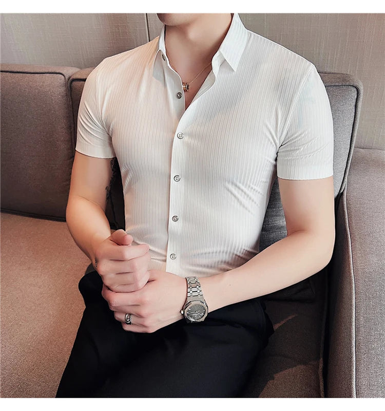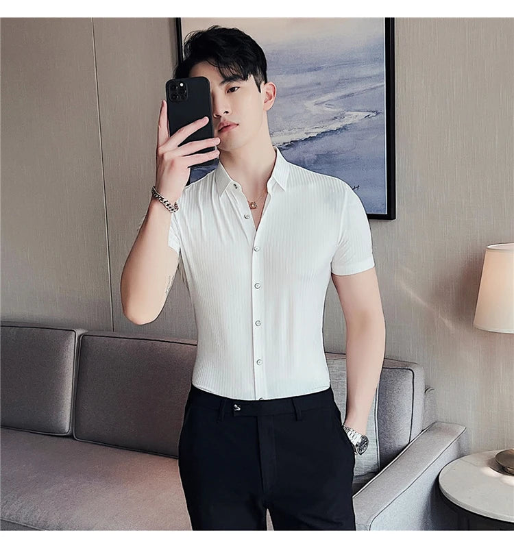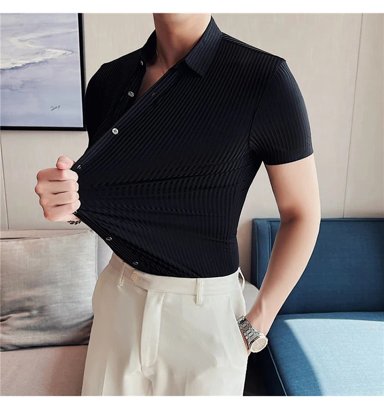2024 Summer High Elasticity Seamless Short Sleeve Shirts Fashion Stripes Men Business Formal Wear Slim Fit Casual Dress Shirt