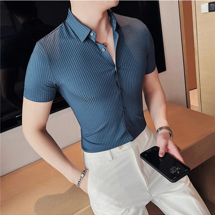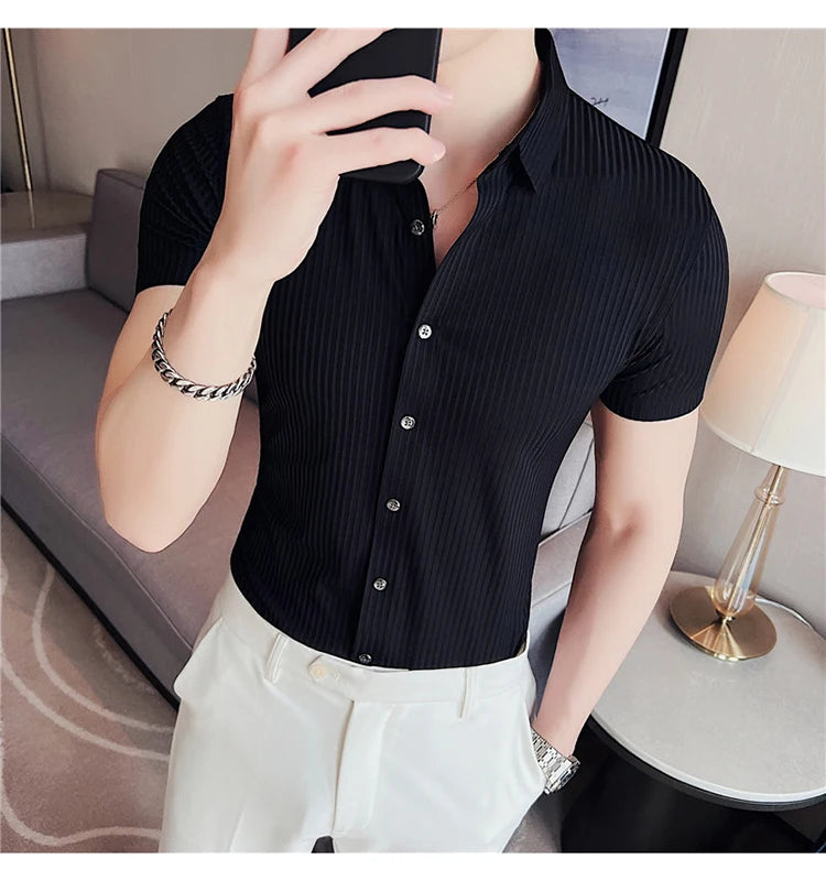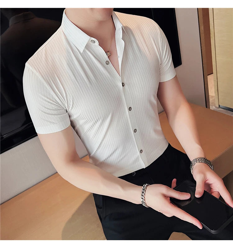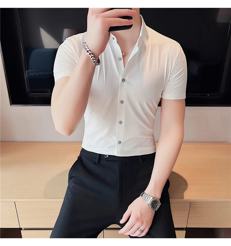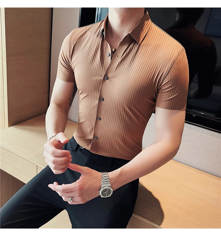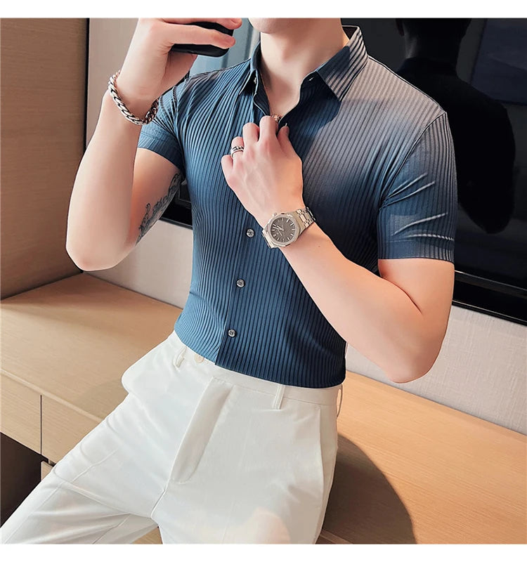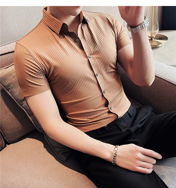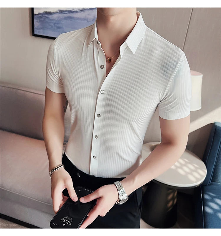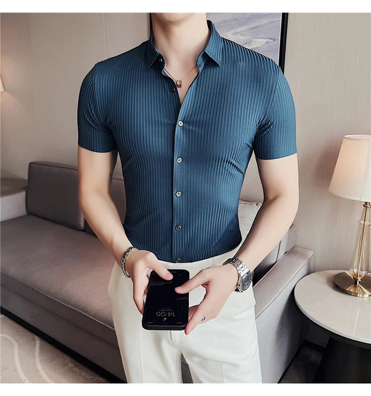 2024 Summer High Elasticity Seamless Short Sleeve Shirts Fashion Stripes Men Business Formal Wear Slim Fit Casual Dress Shirt