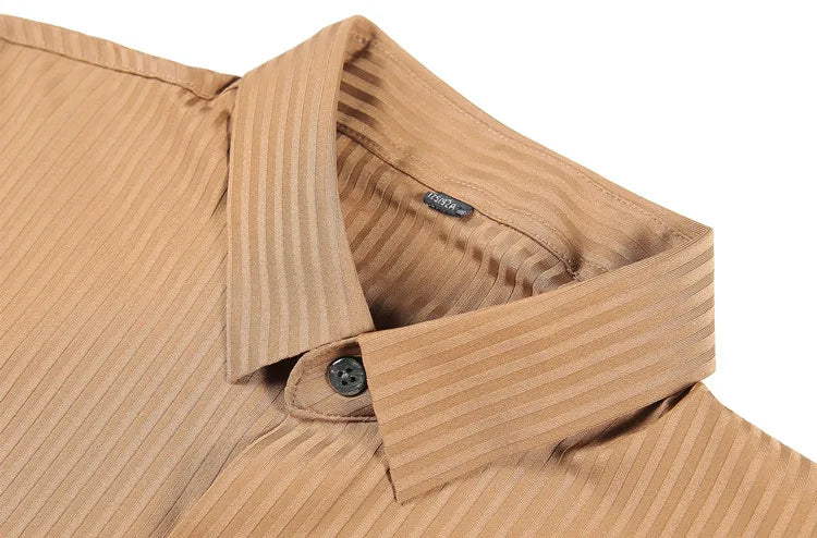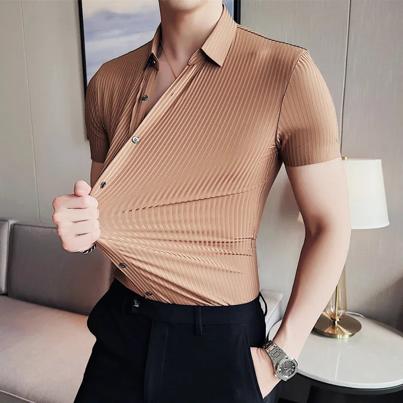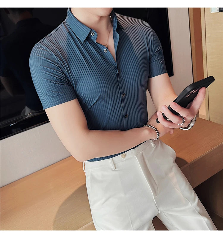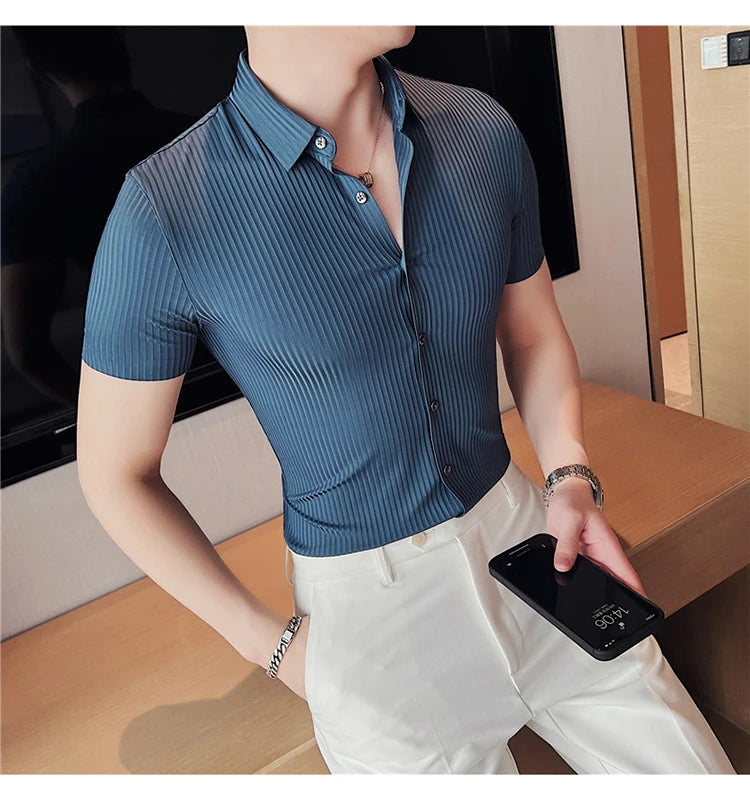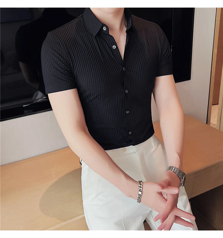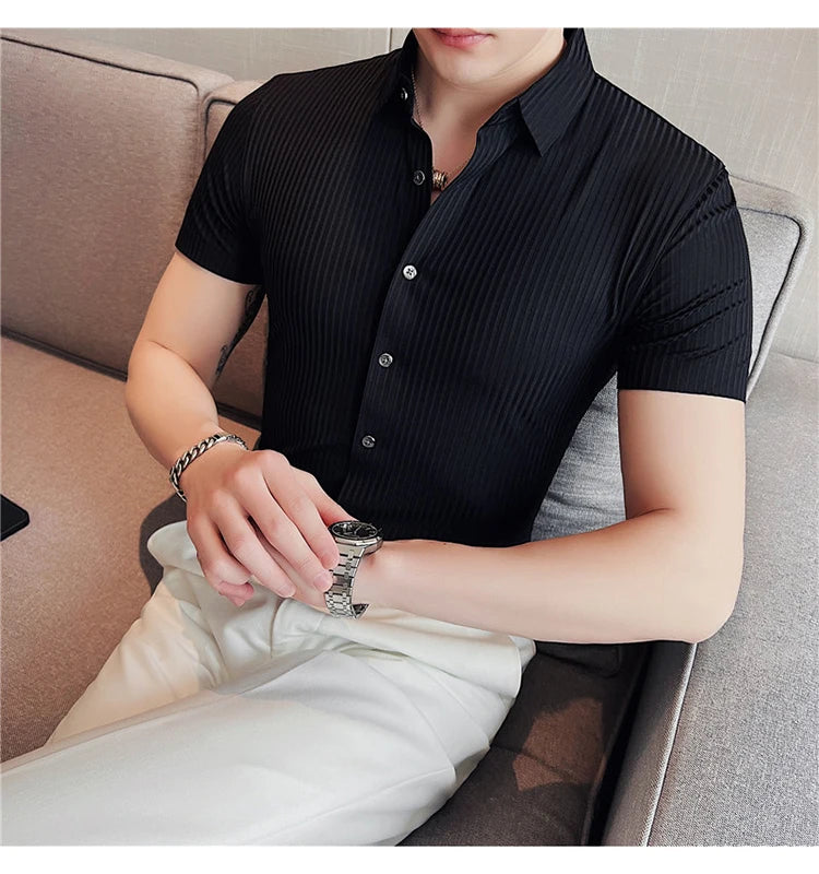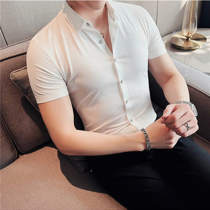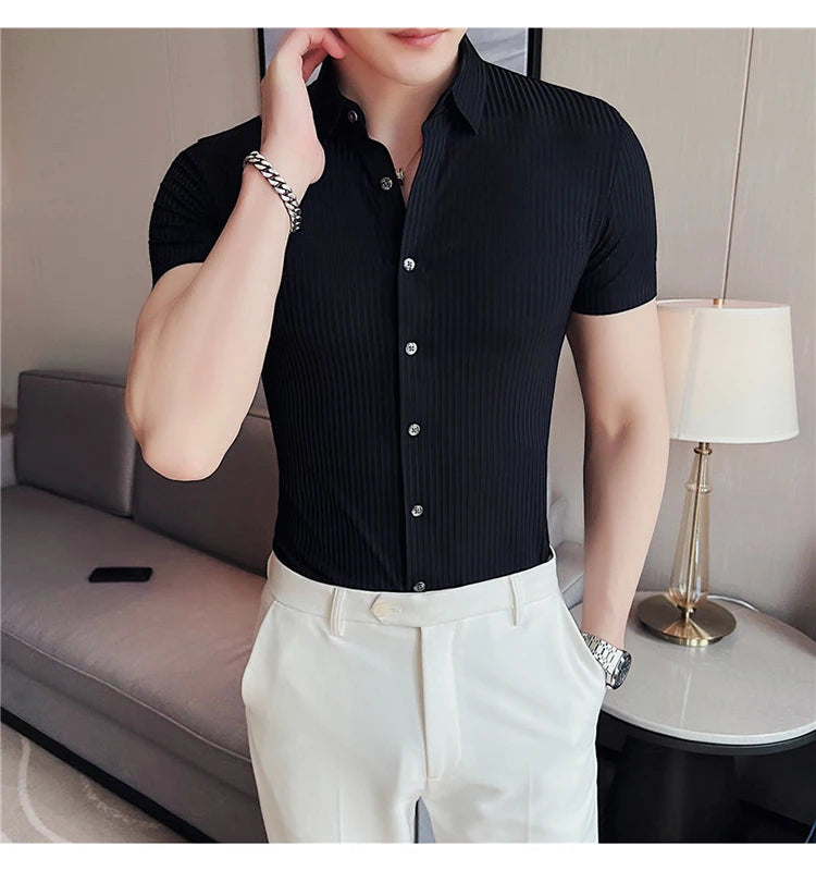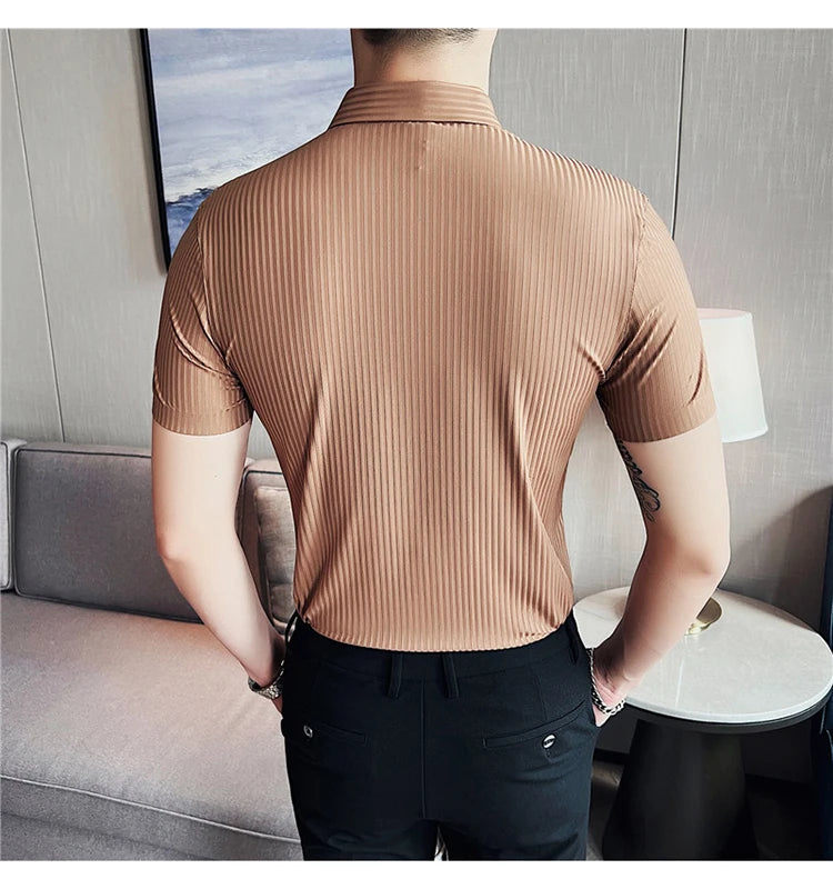 2024 Summer High Elasticity Seamless Short Sleeve Shirts Fashion Stripes Men Business Formal Wear Slim Fit Casual Dress Shirt