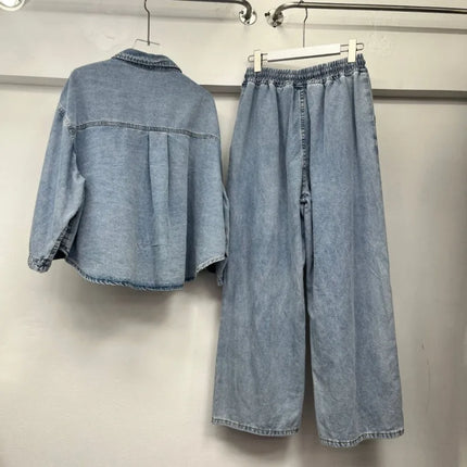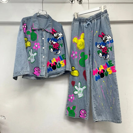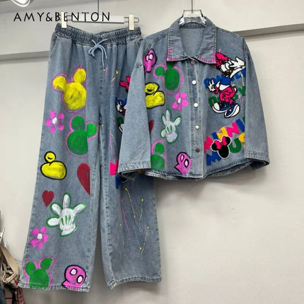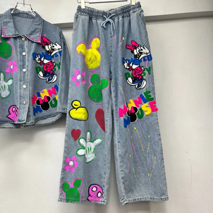 2025 Spring New Women's Beautiful Cartoon Graffiti Coat Heavy Industry Denim Jacket Straight Thin Wide-leg Pants Two-pieces Sets