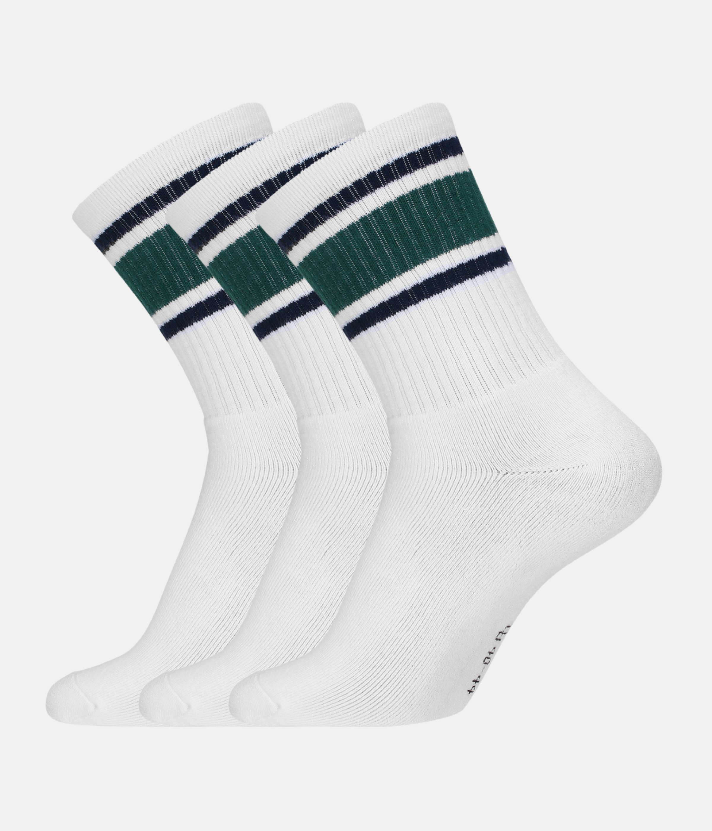 3 par hvide bambus tennissokker med grøn/blå striber og lang rib