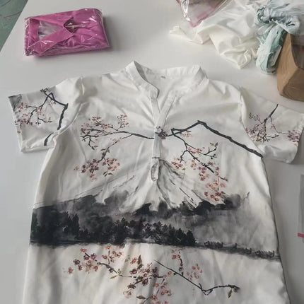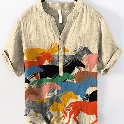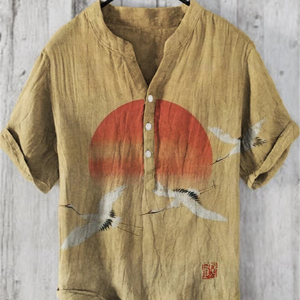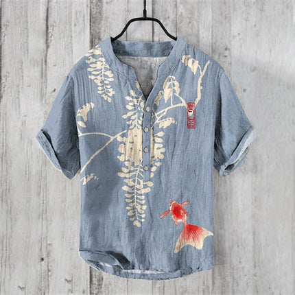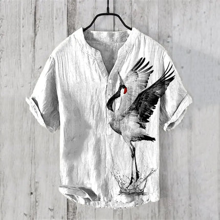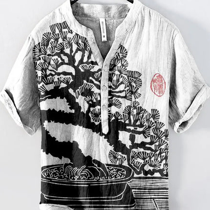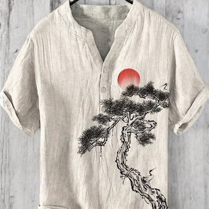 Bamboo Linen Hawaiian Shirt Tropical Style 3D Digital Printing Pine Tree Pattern Men's Short Sleeve Stand Collar Shirt