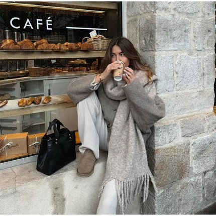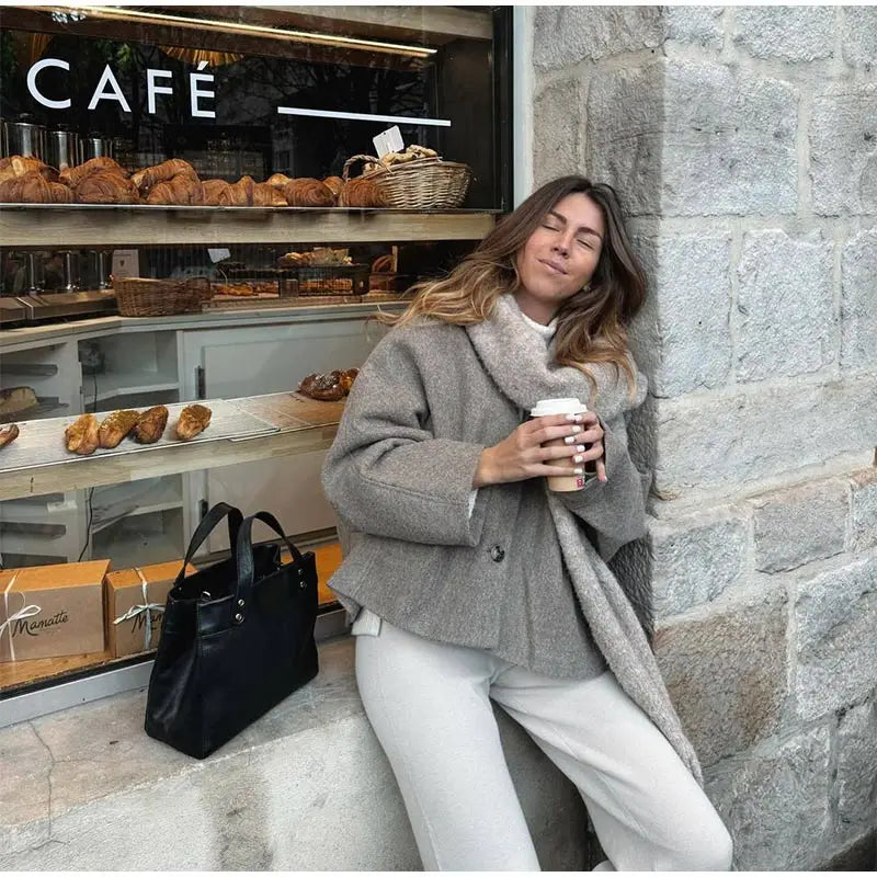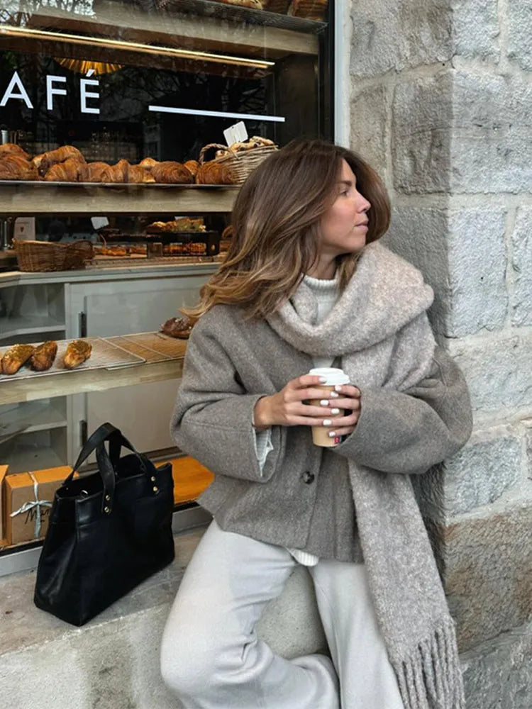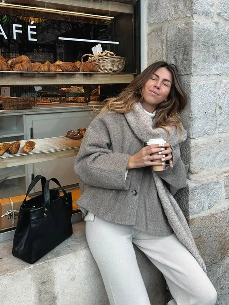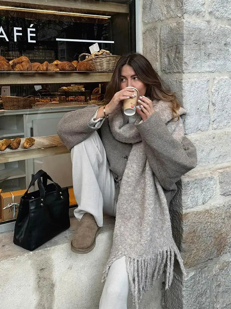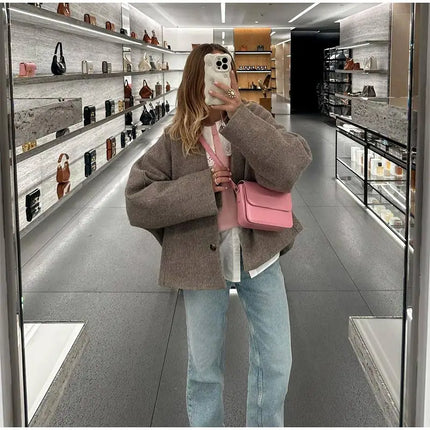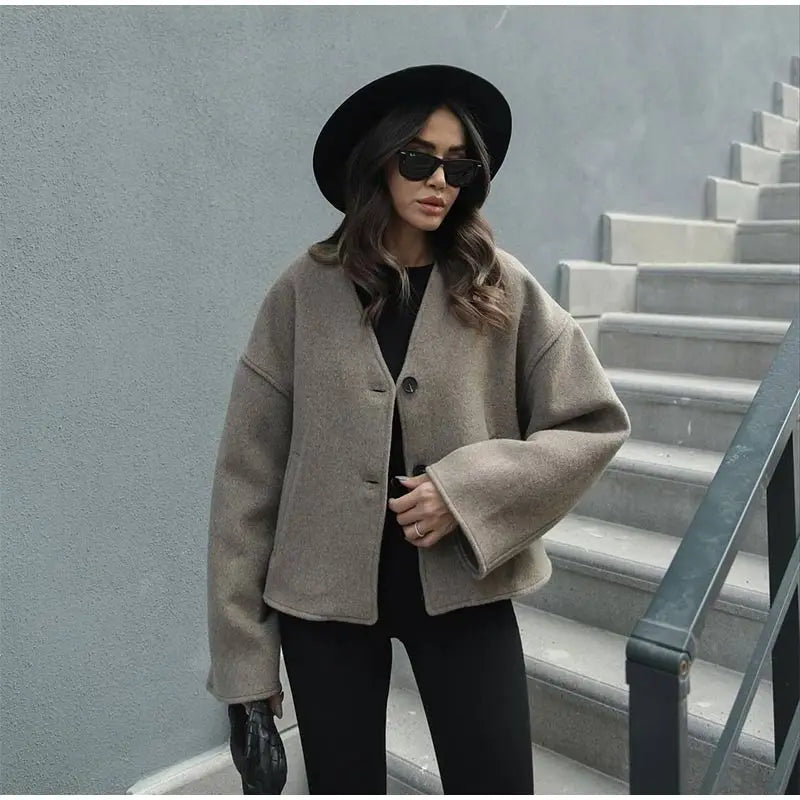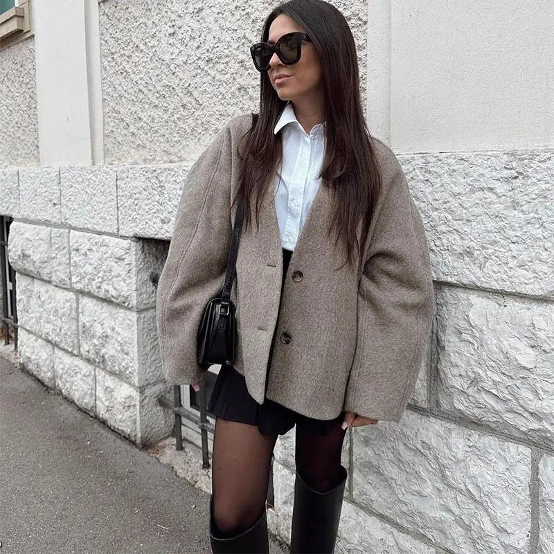 Chic Single Breasted V-neck Oversized Jackets Women's Fashion Solid Long Sleeve Warm Woolen Coats 2024 Lady Casual Streetwear