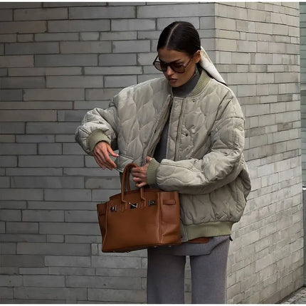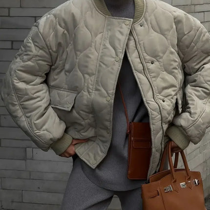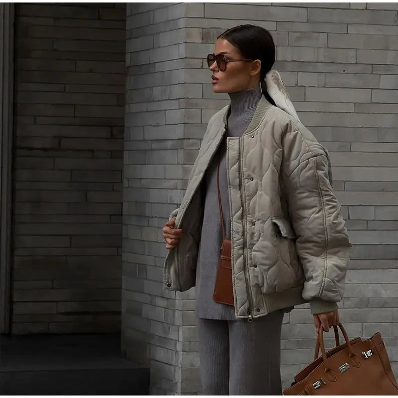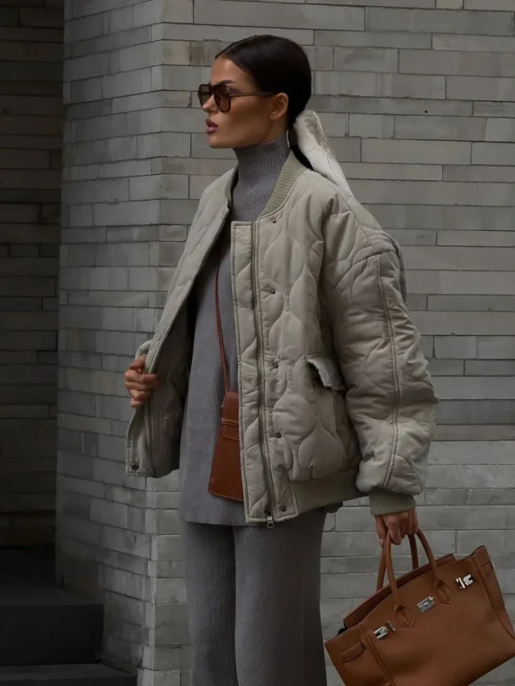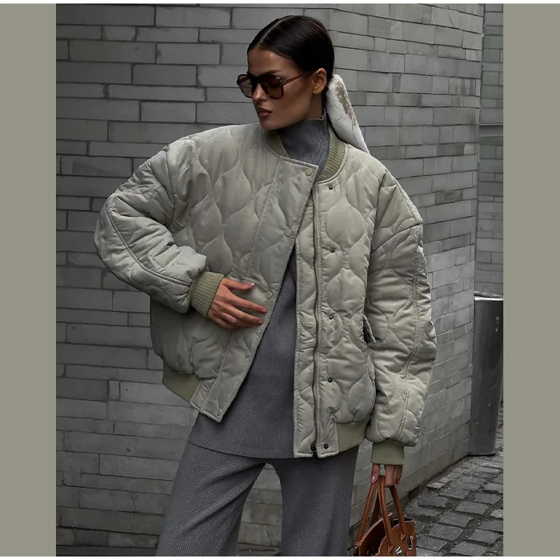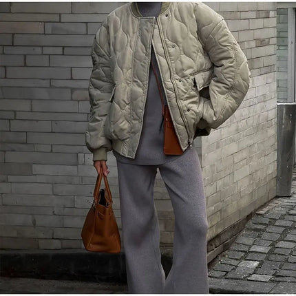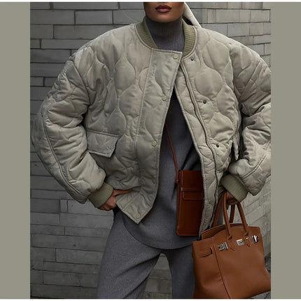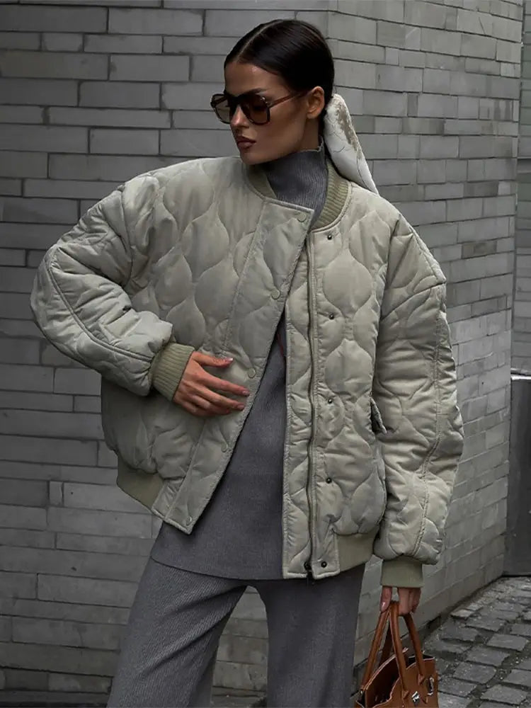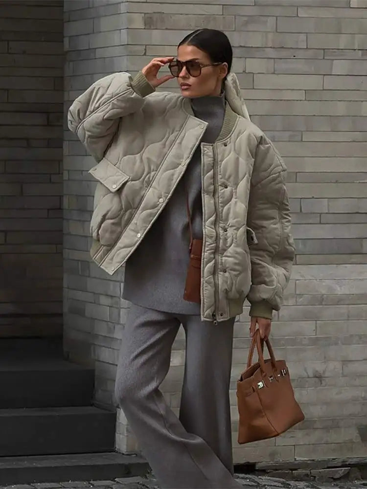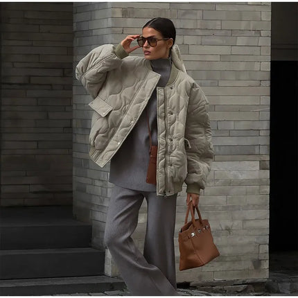 Chic Zipper With Button Quilted Bomber Cotton Jacket Women Casual Single Breasted Long Sleeve Pocket Coat Fall Lady Warm Outwear
