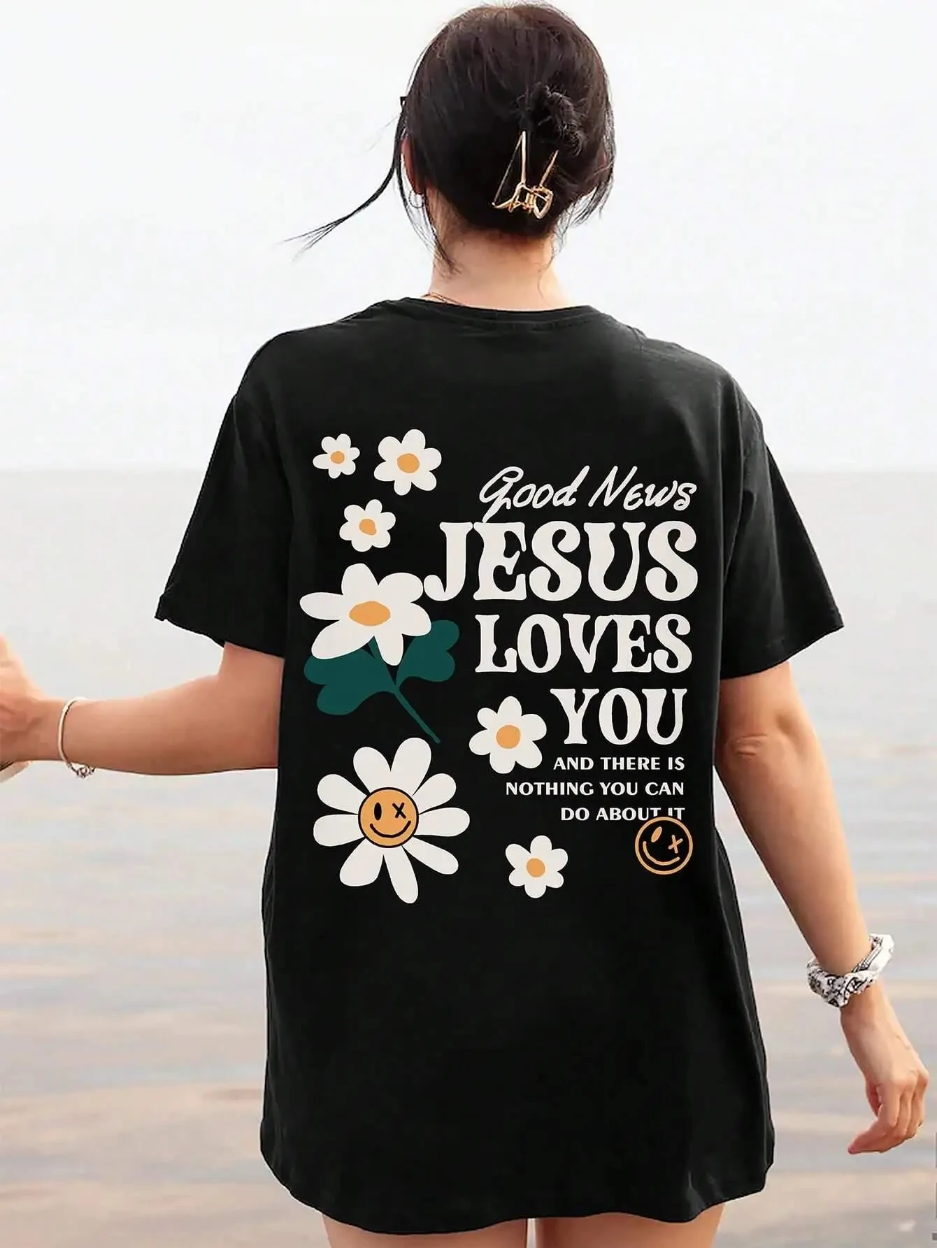 Good News Jesus Loves You Print Summer Women T-Shirt O-Neck T Shirts Basic All-Match Short Sleeve Breathable Comfortable Tops