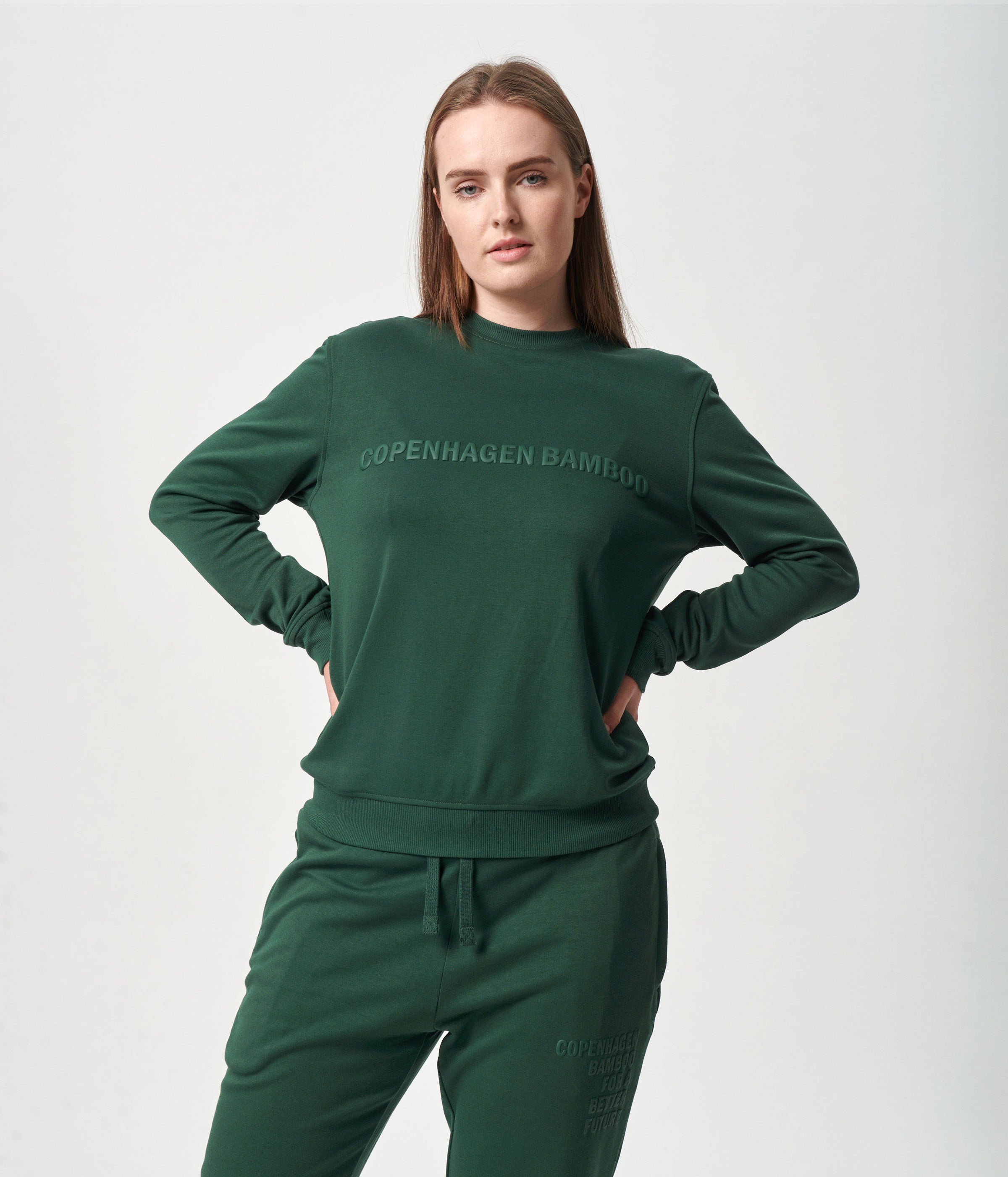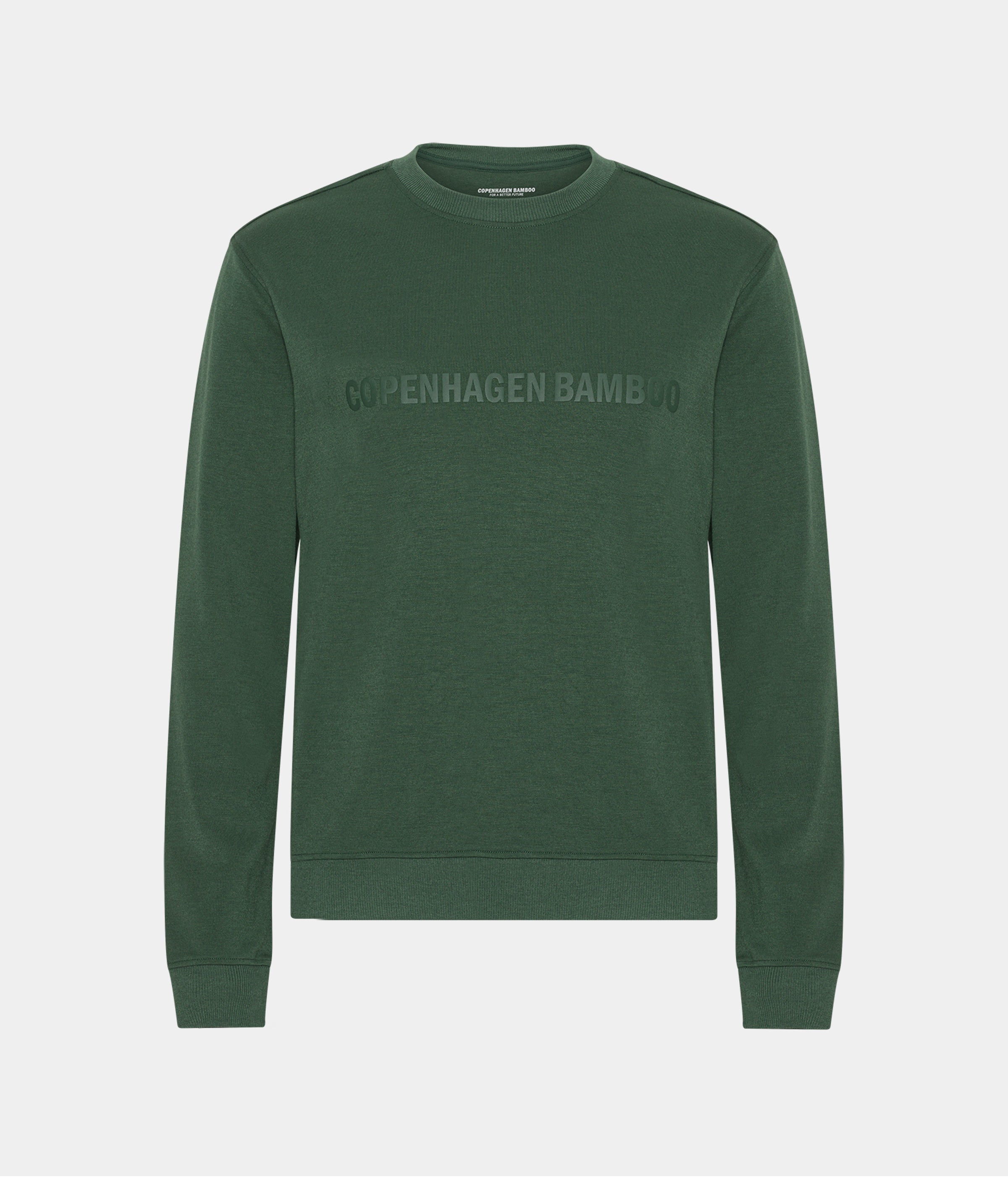 Grøn unisex bambus sweatshirt med logo print hen over brystet. Denne sweatshirt er fremstillet i bambusviskose, økologisk bomuld og polyester.