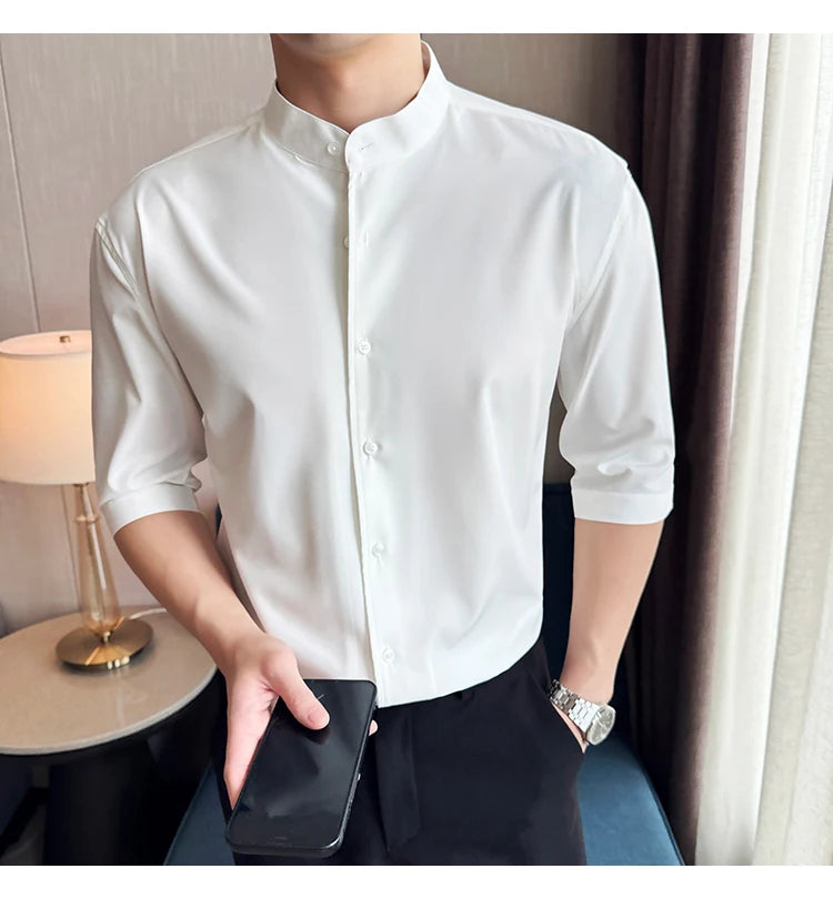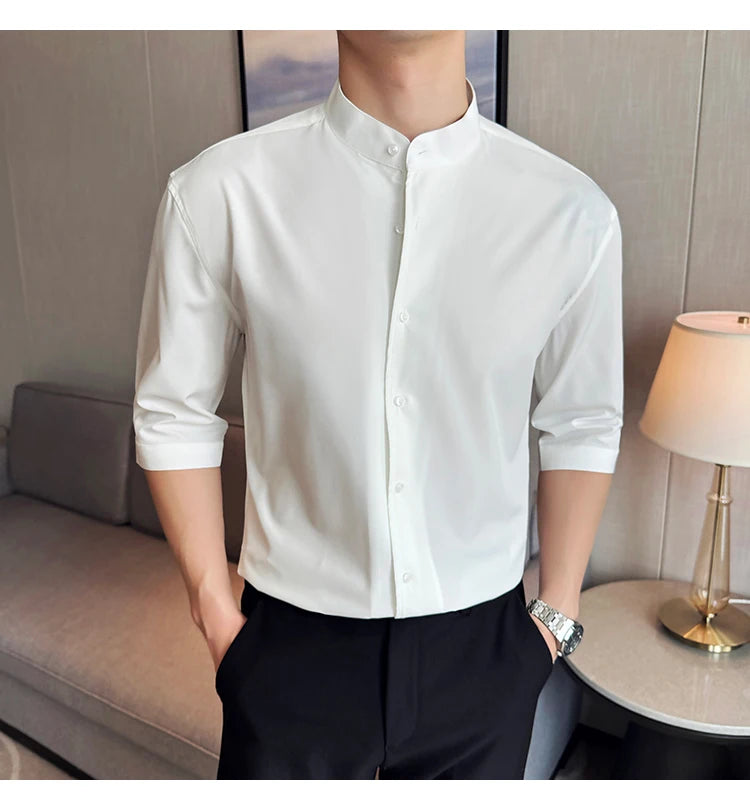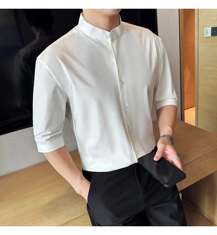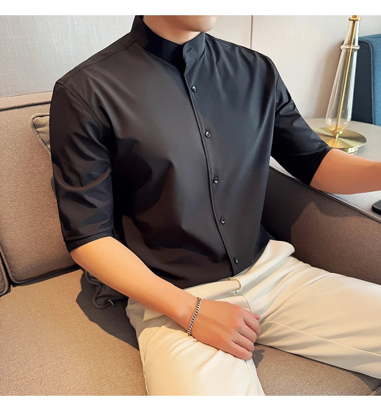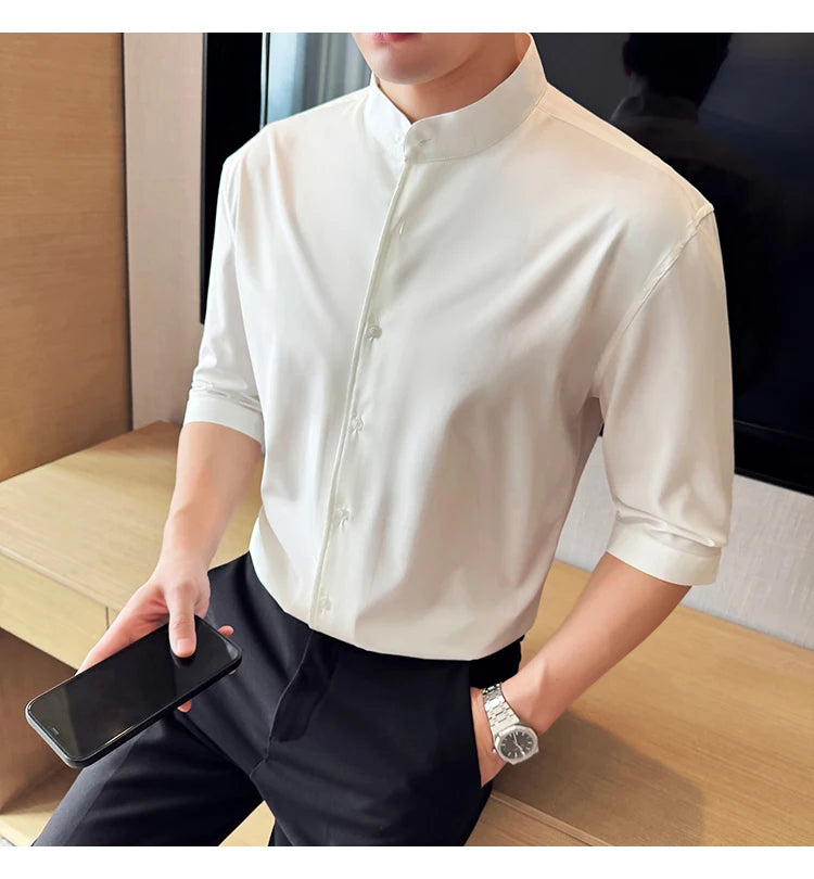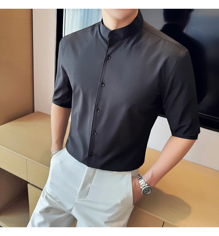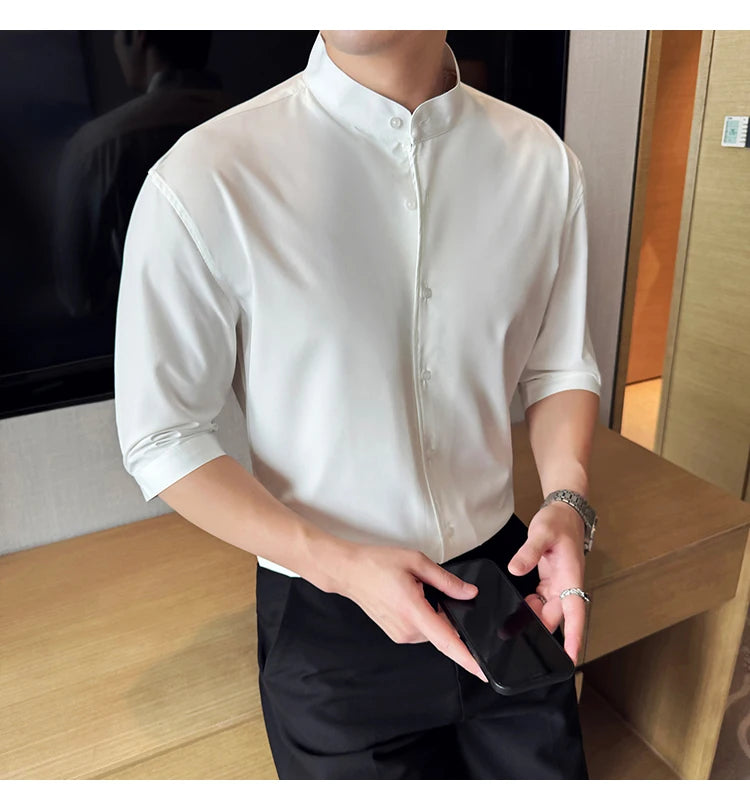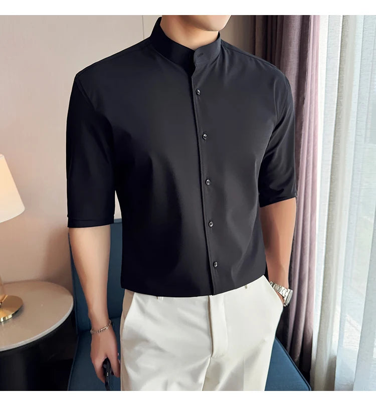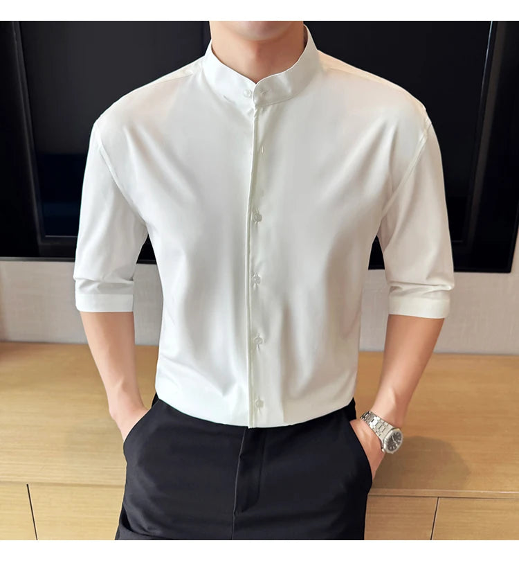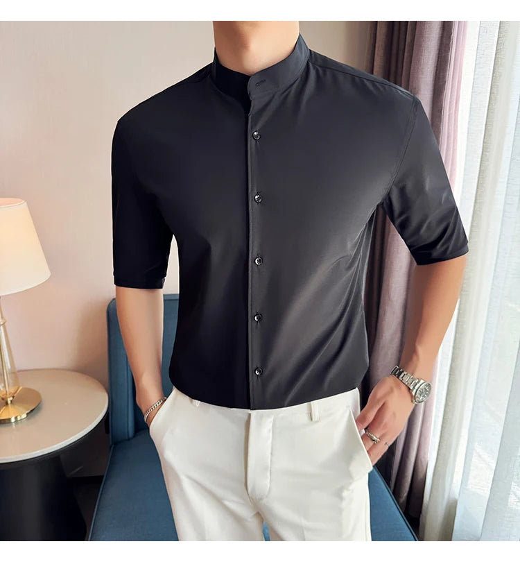 High Quality Chinese Style Stand Up Neck Shirt Men's Summer Mid Sleeved Slim Fit Casual Social Business Blouse Homme 4XL-M