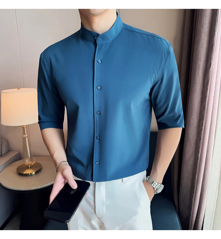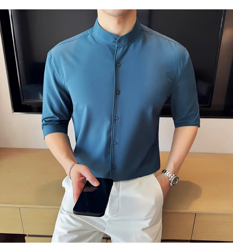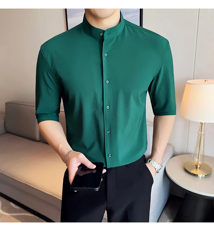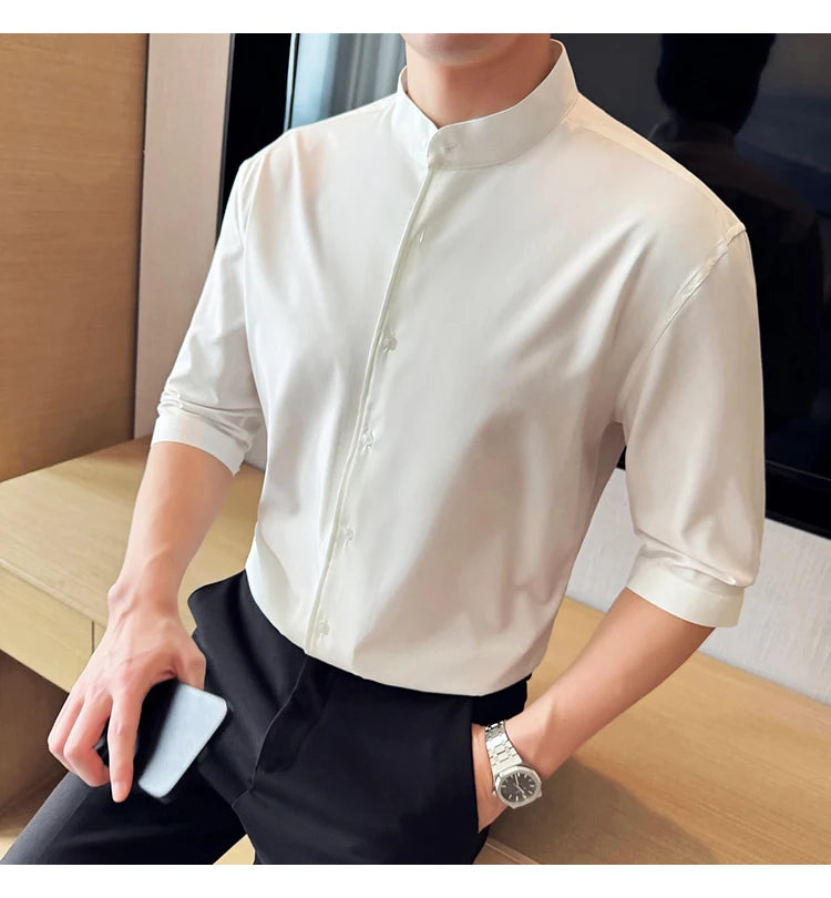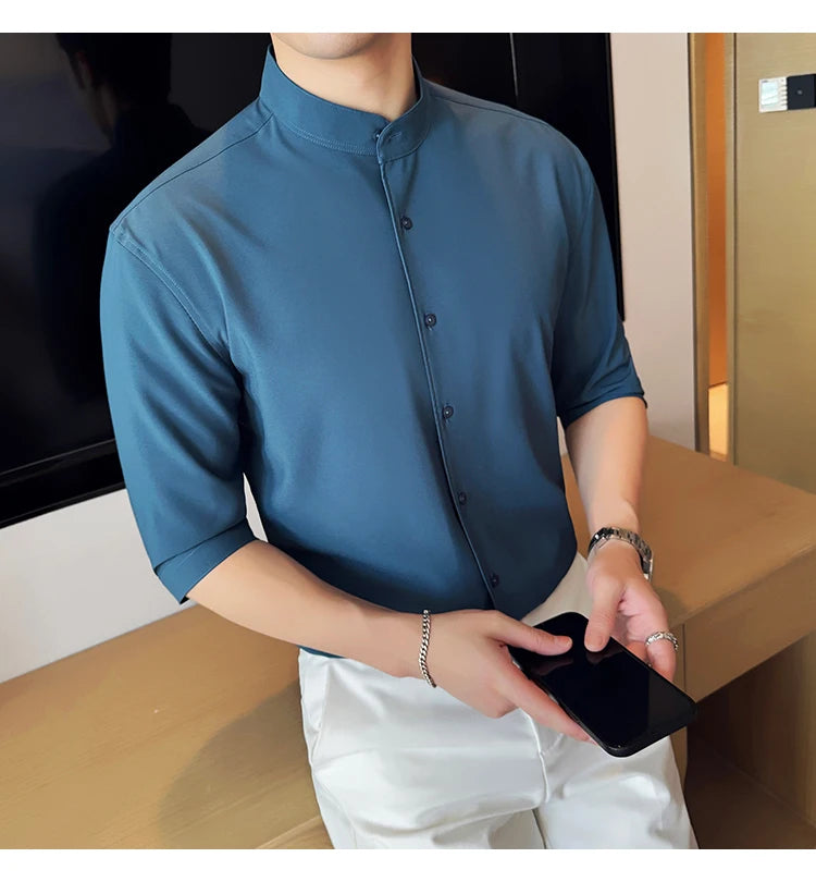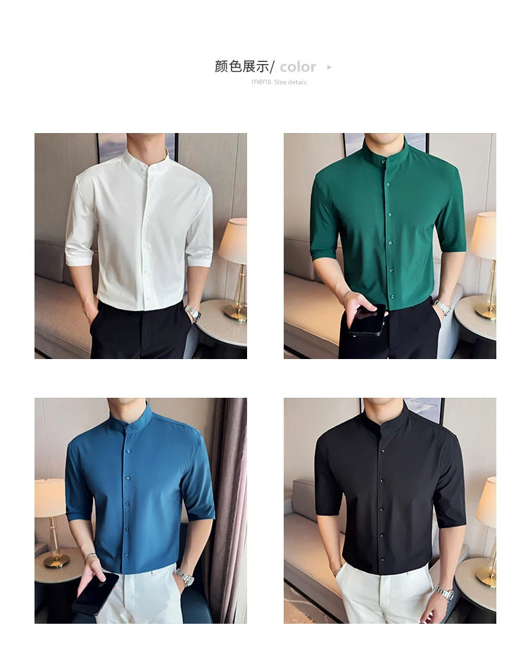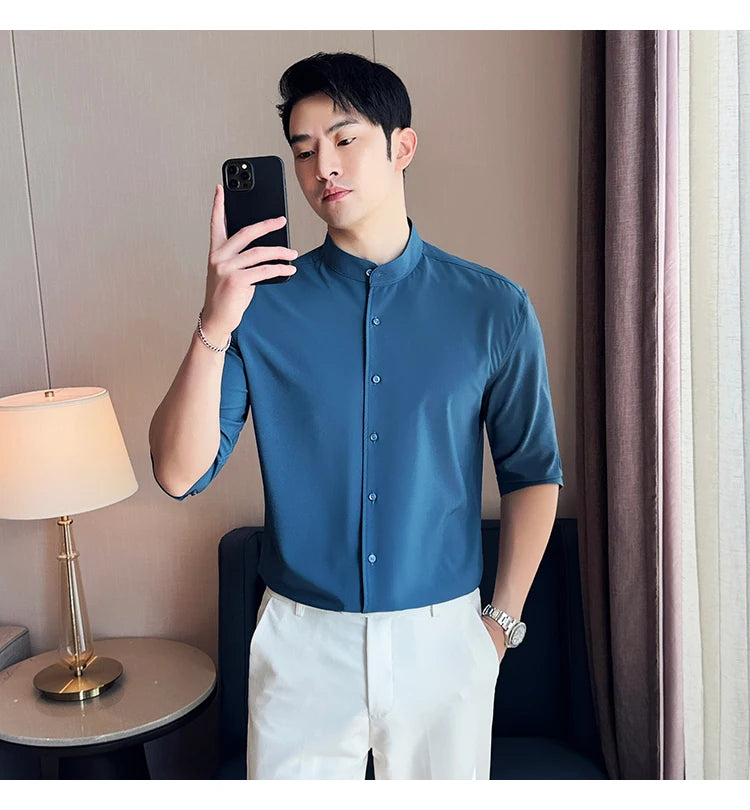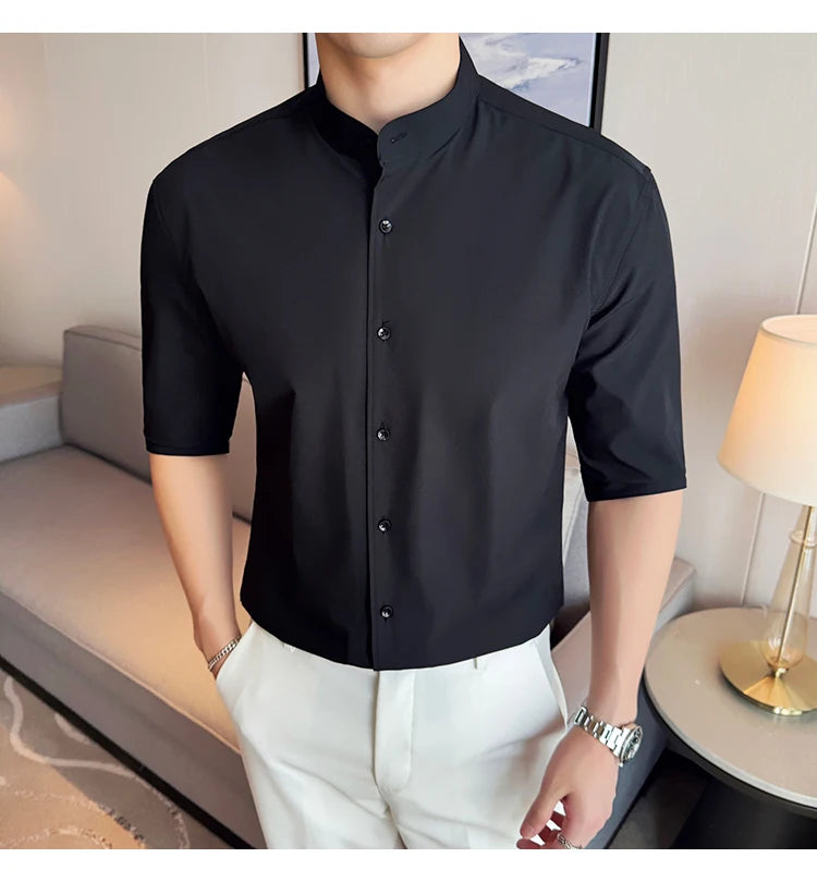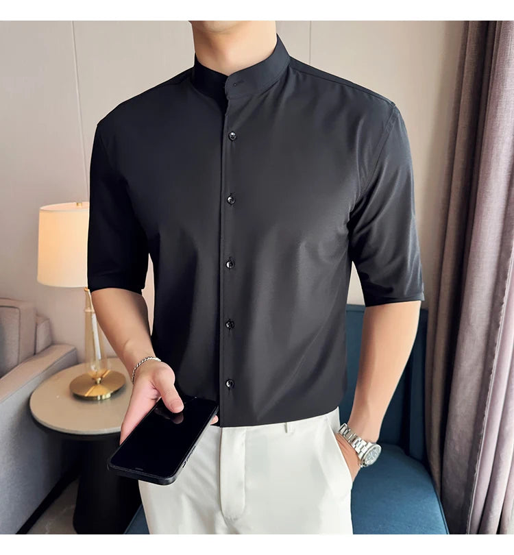 High Quality Chinese Style Stand Up Neck Shirt Men's Summer Mid Sleeved Slim Fit Casual Social Business Blouse Homme 4XL-M