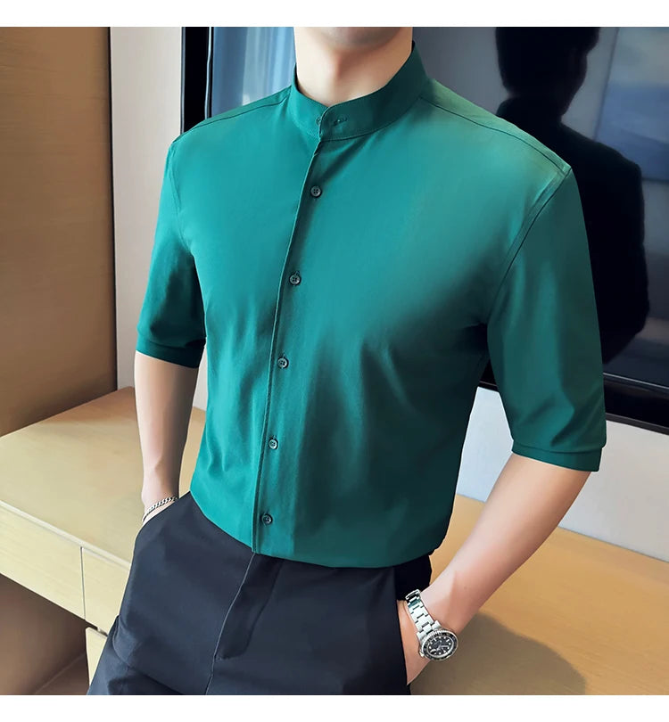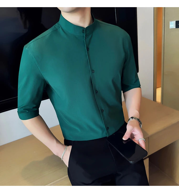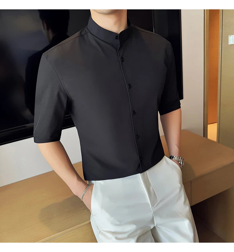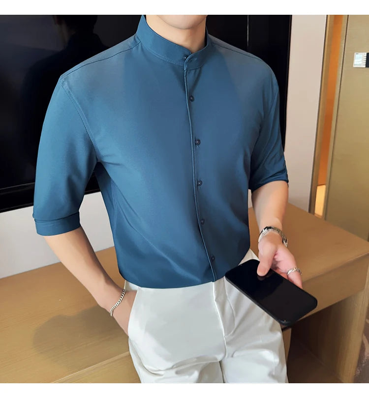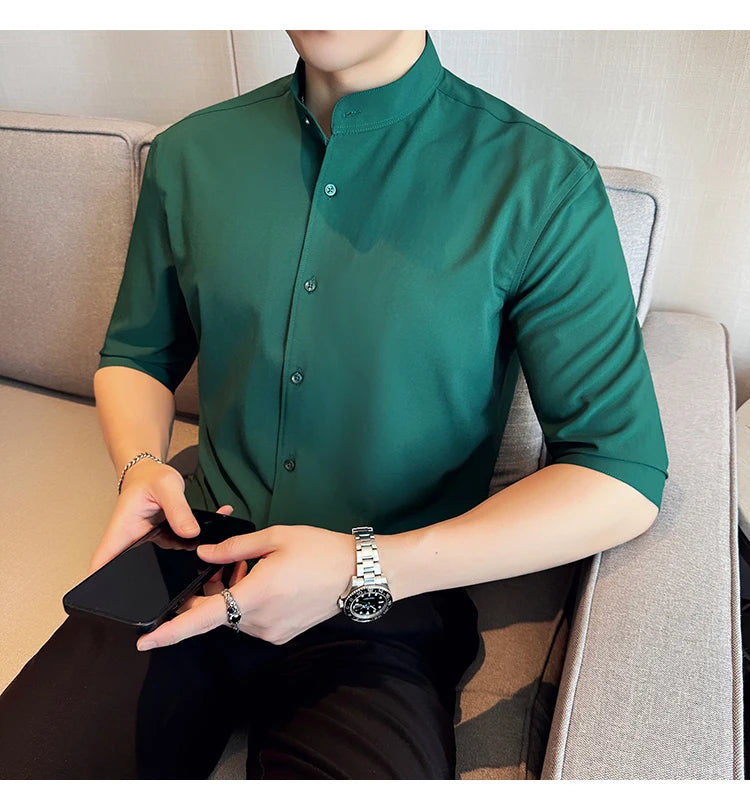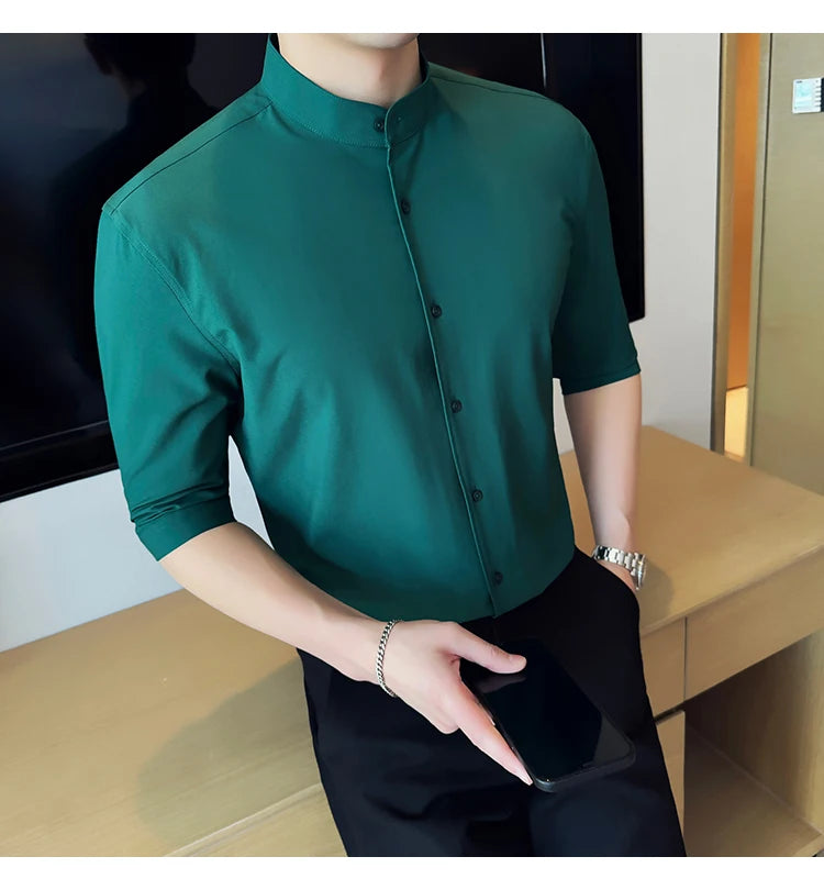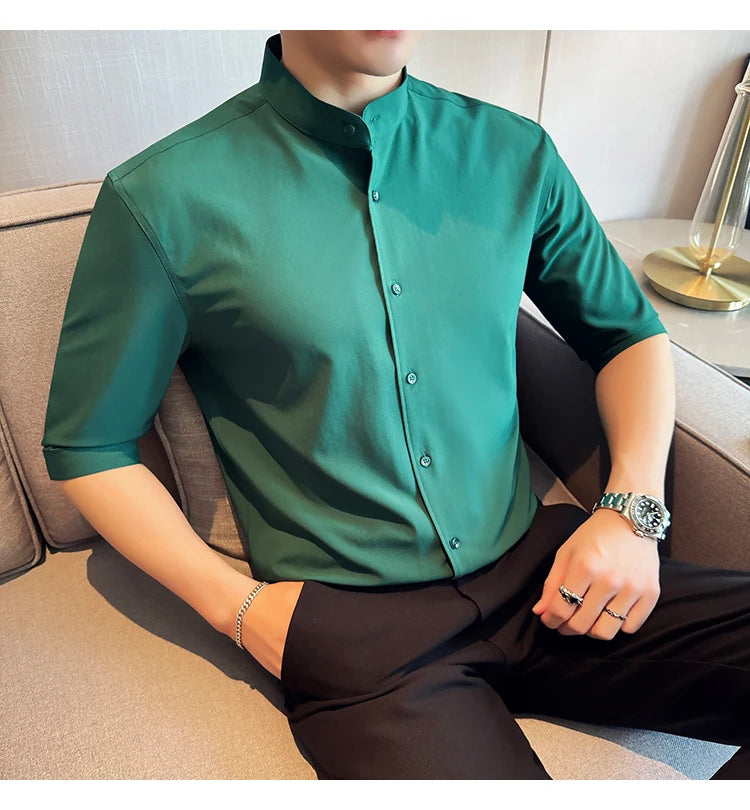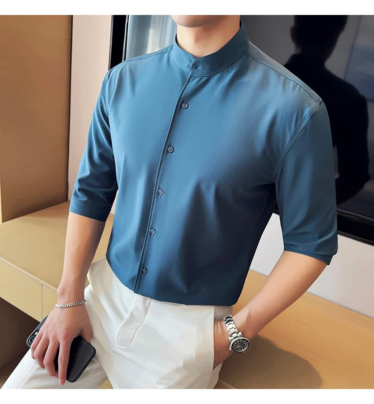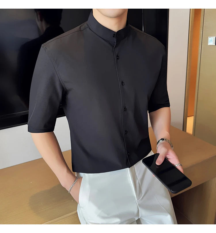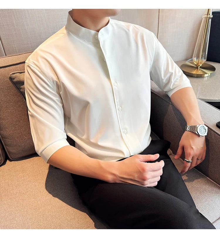 High Quality Chinese Style Stand Up Neck Shirt Men's Summer Mid Sleeved Slim Fit Casual Social Business Blouse Homme 4XL-M