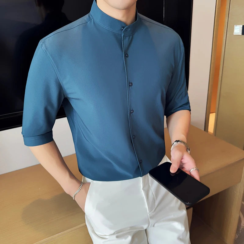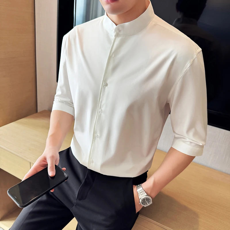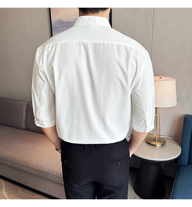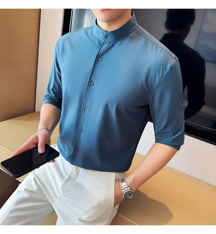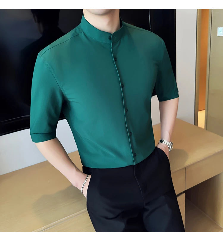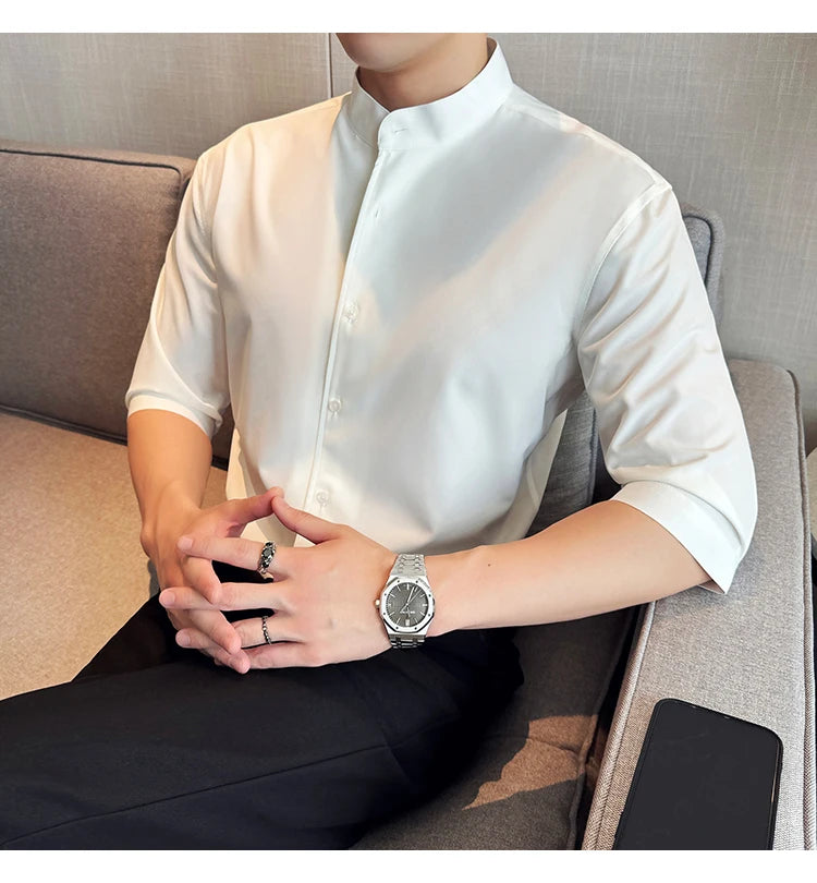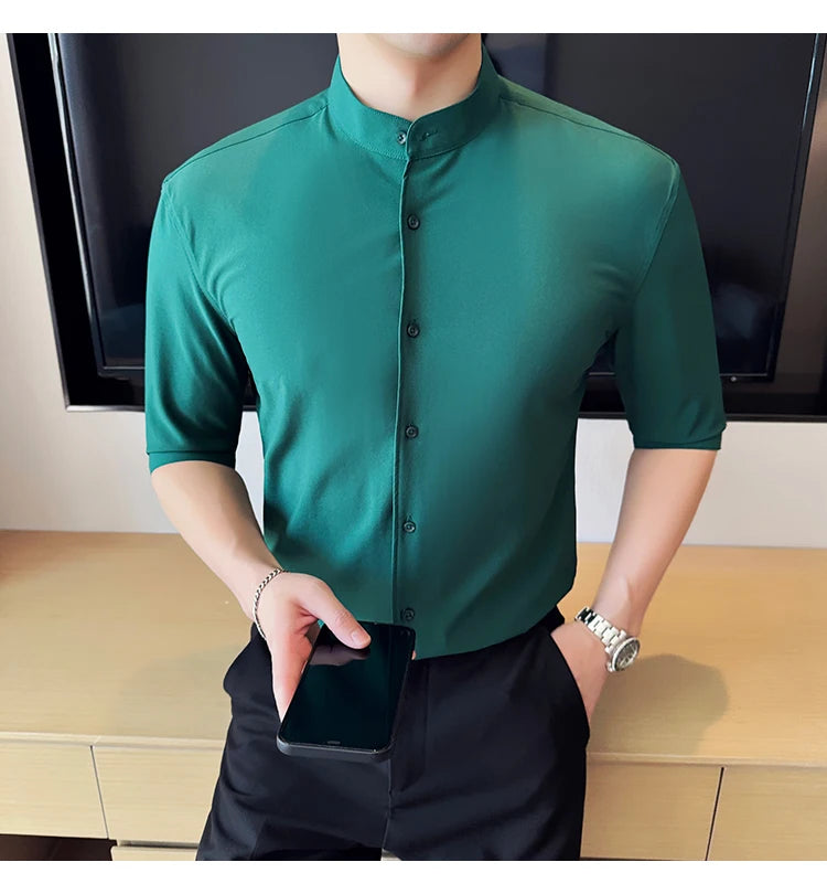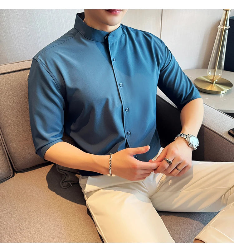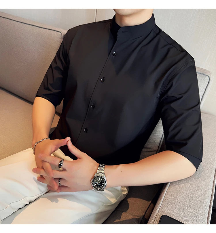 High Quality Chinese Style Stand Up Neck Shirt Men's Summer Mid Sleeved Slim Fit Casual Social Business Blouse Homme 4XL-M