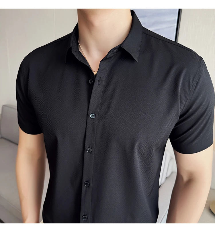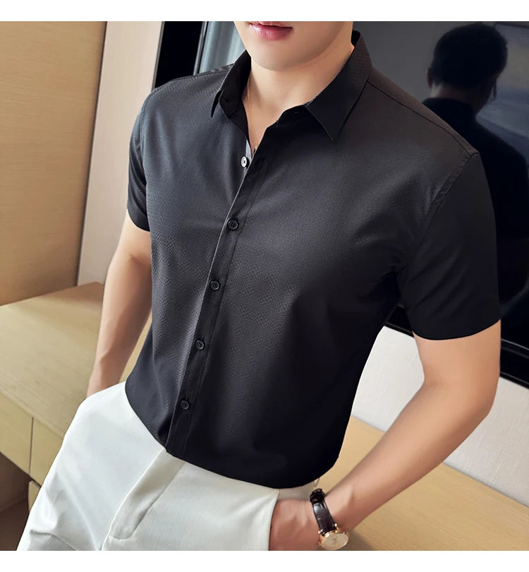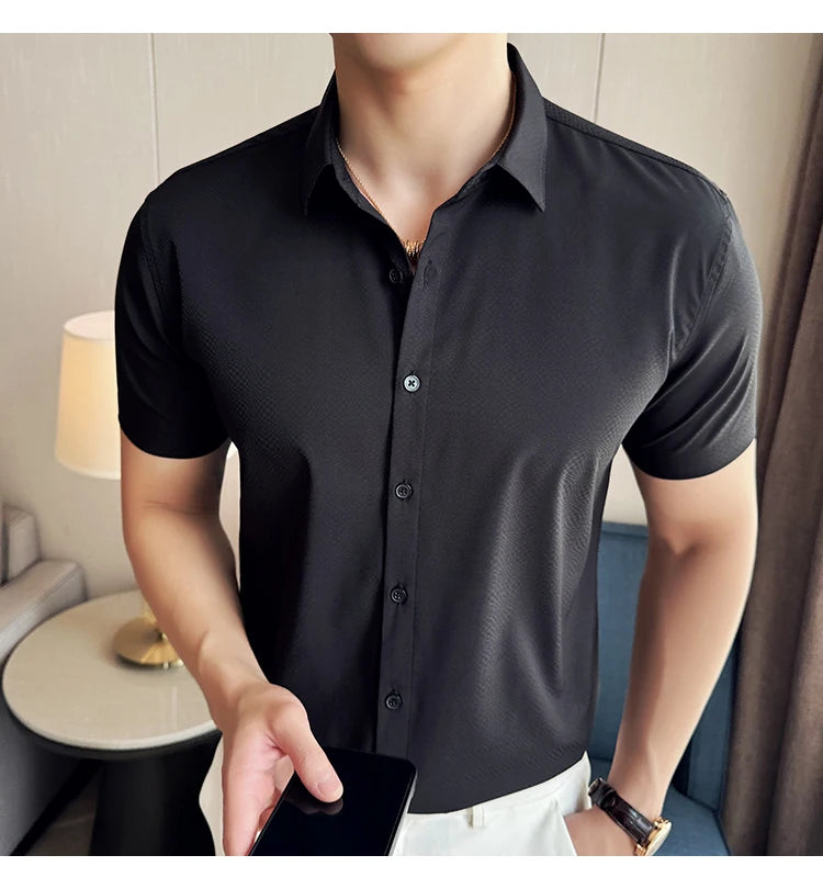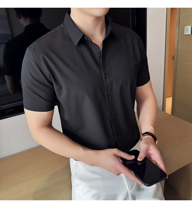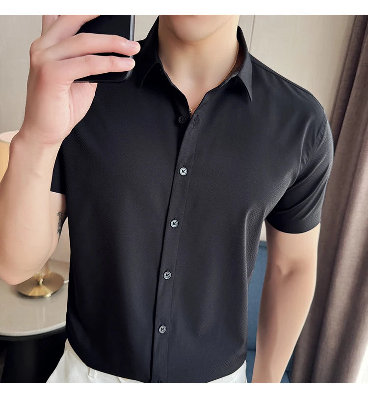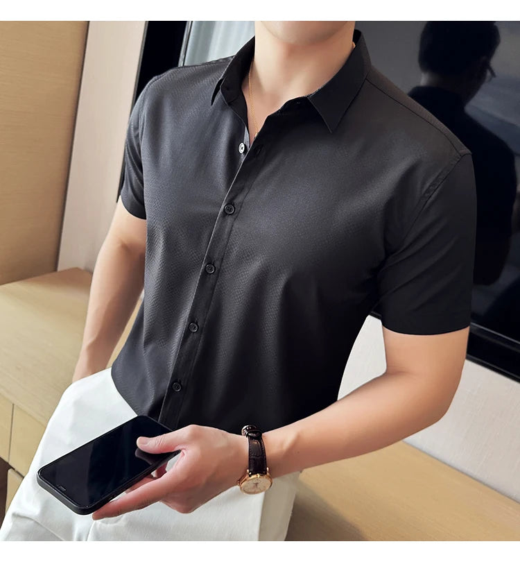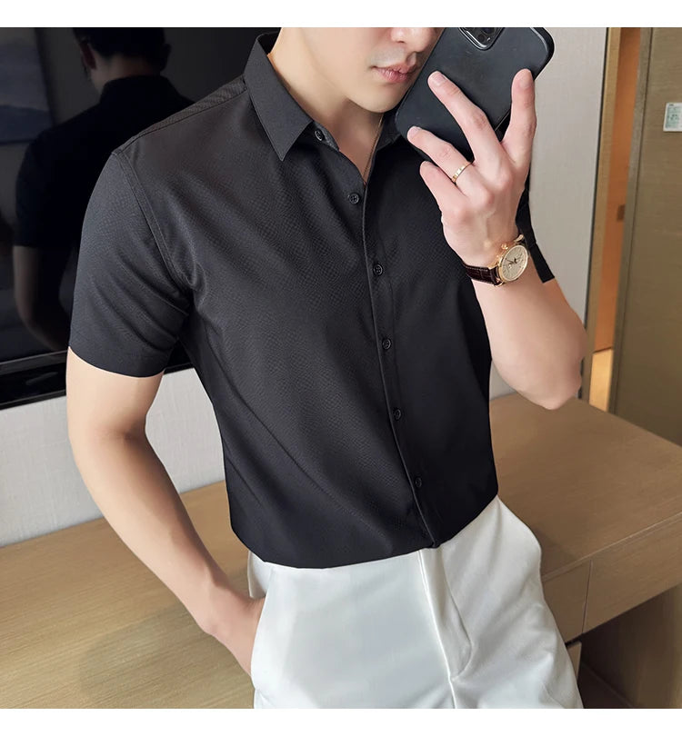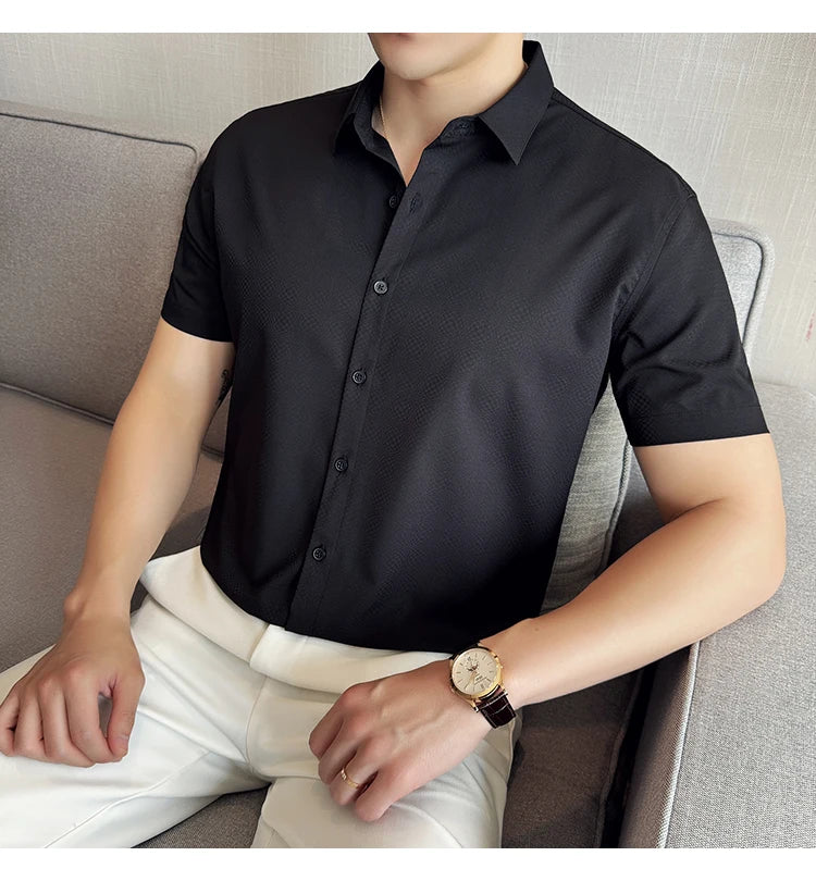 High Quality Ice Silk Elastic Jacquard Shirts 2024 Summer New Men Casual Short Sleeved Slim Fit Business Versatile Shirt 4XL-M