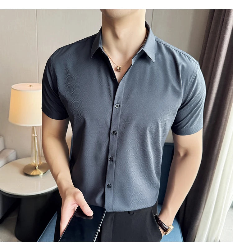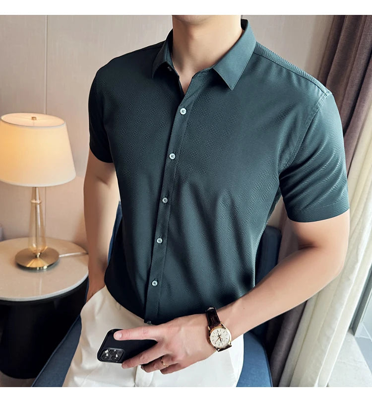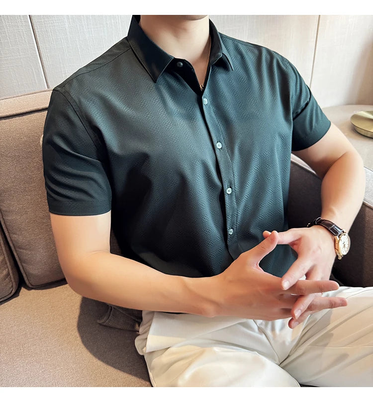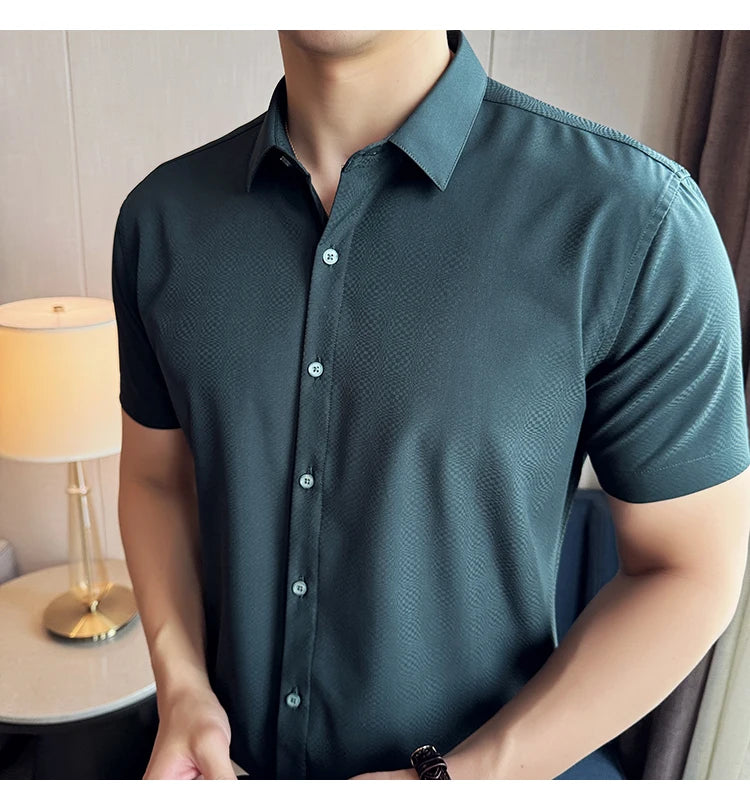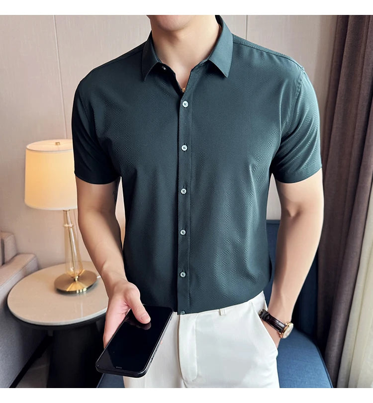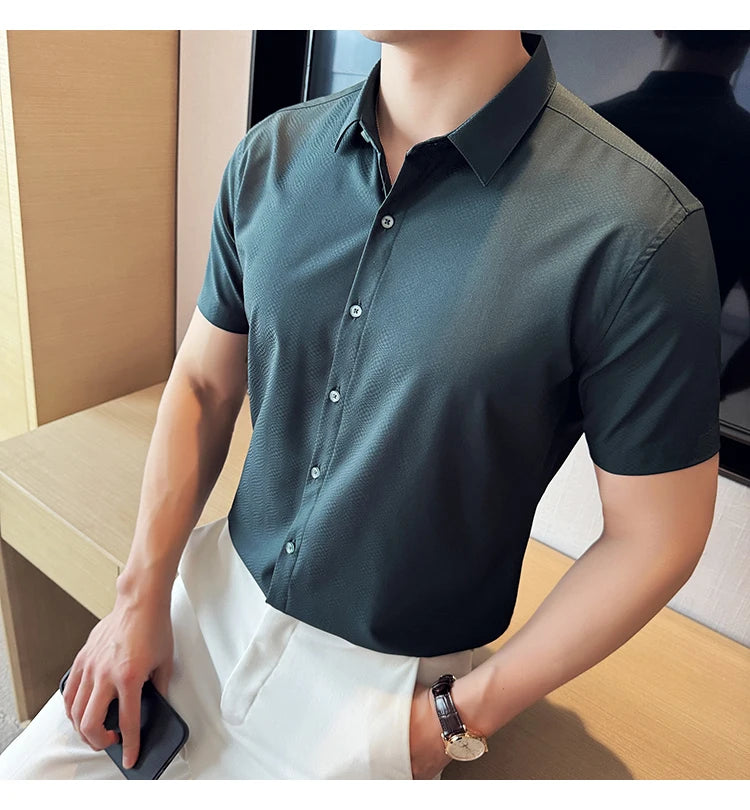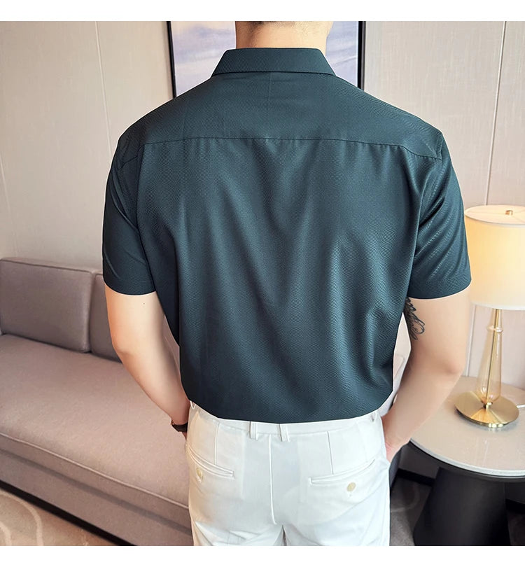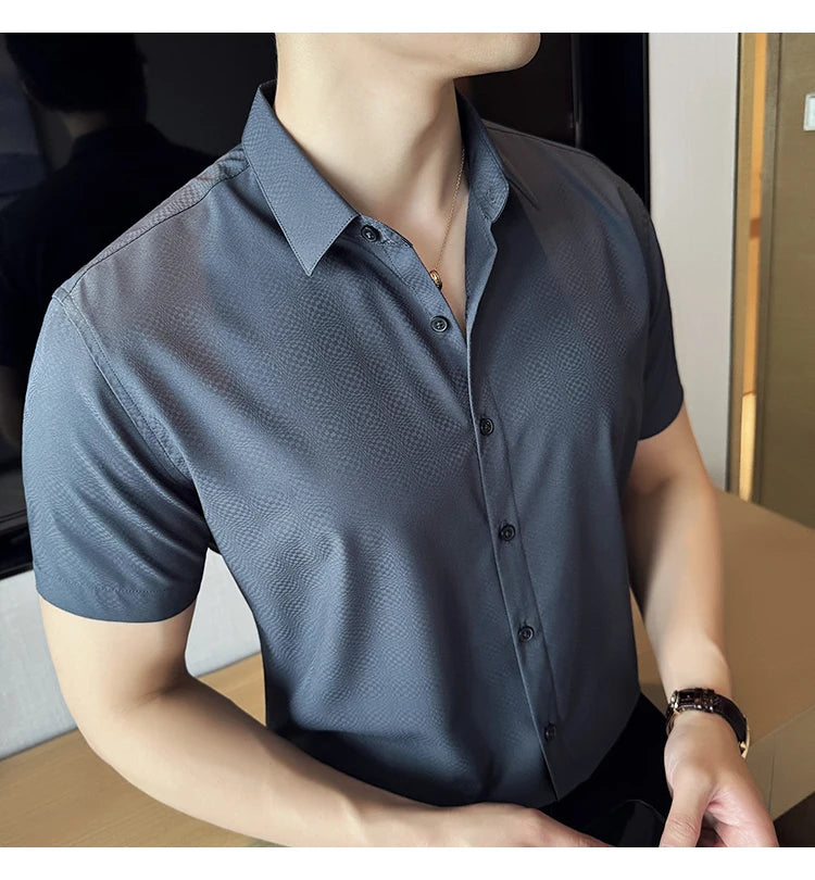 High Quality Ice Silk Elastic Jacquard Shirts 2024 Summer New Men Casual Short Sleeved Slim Fit Business Versatile Shirt 4XL-M