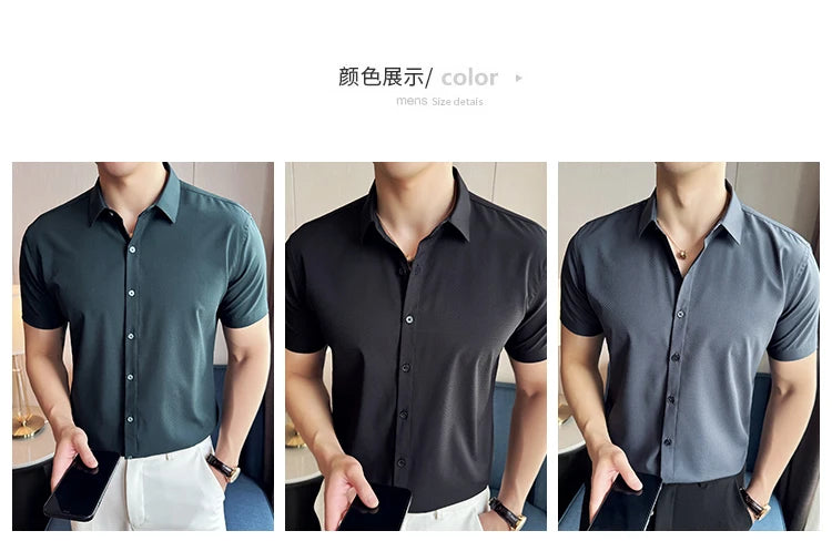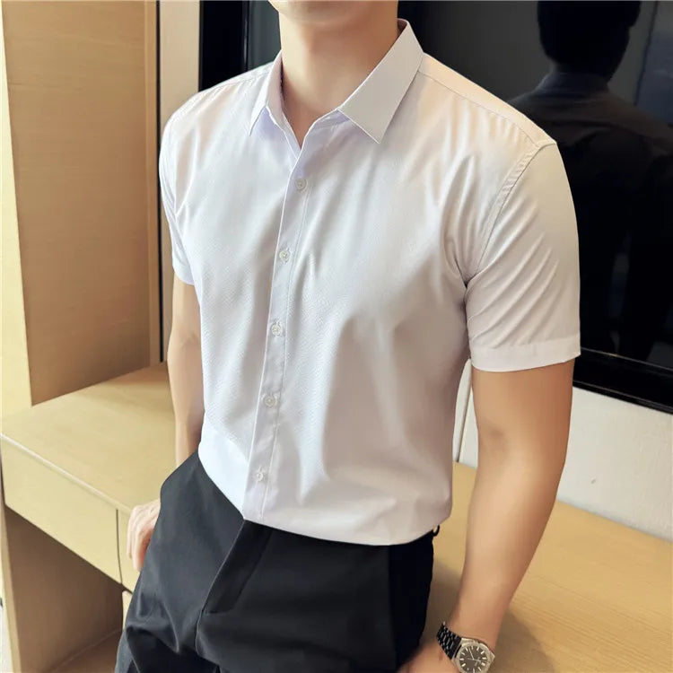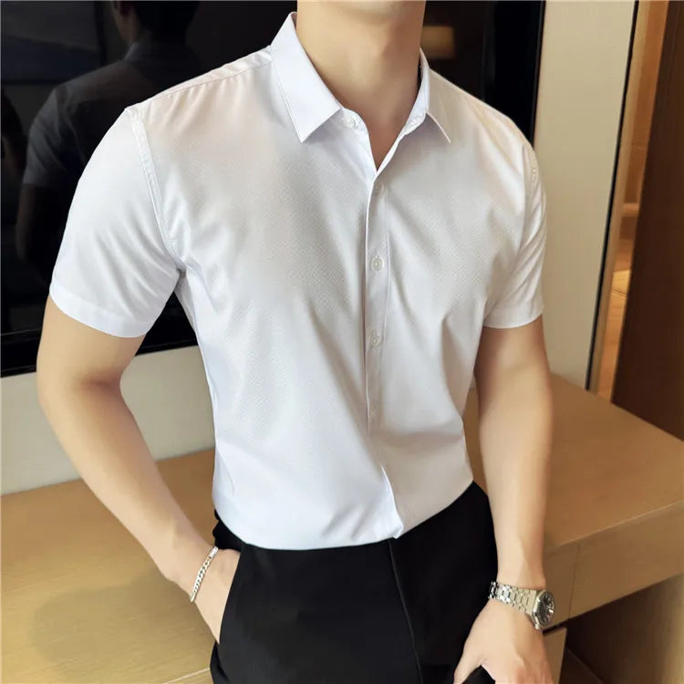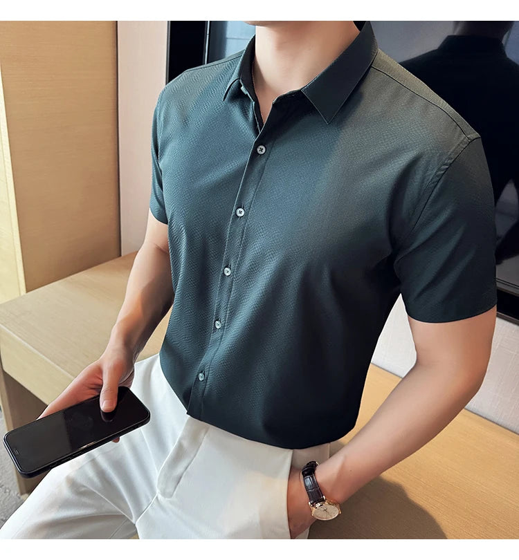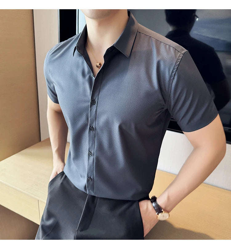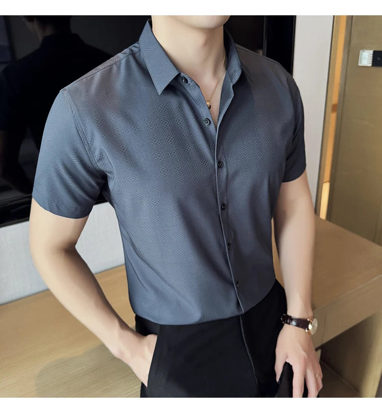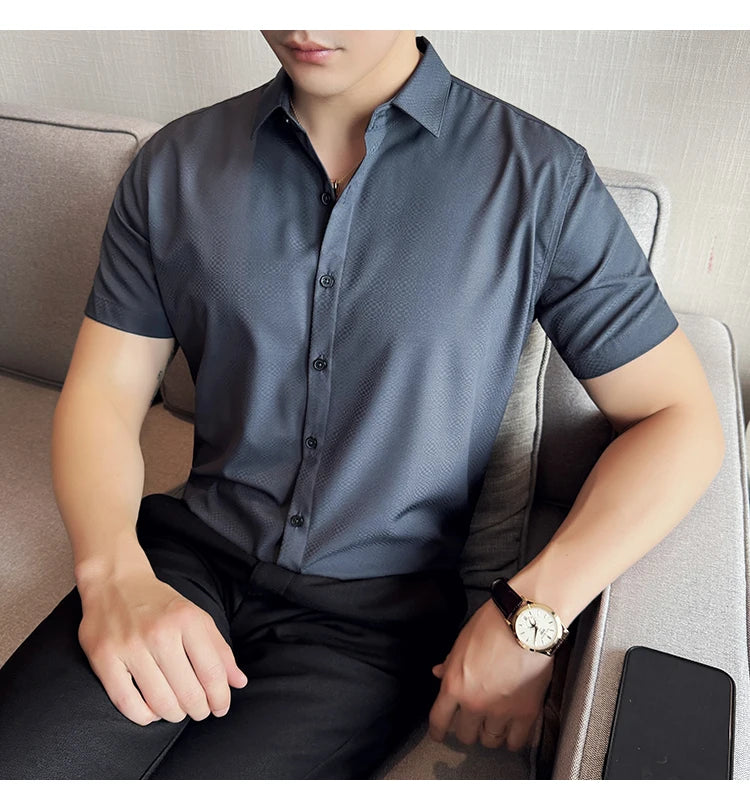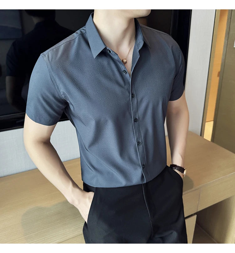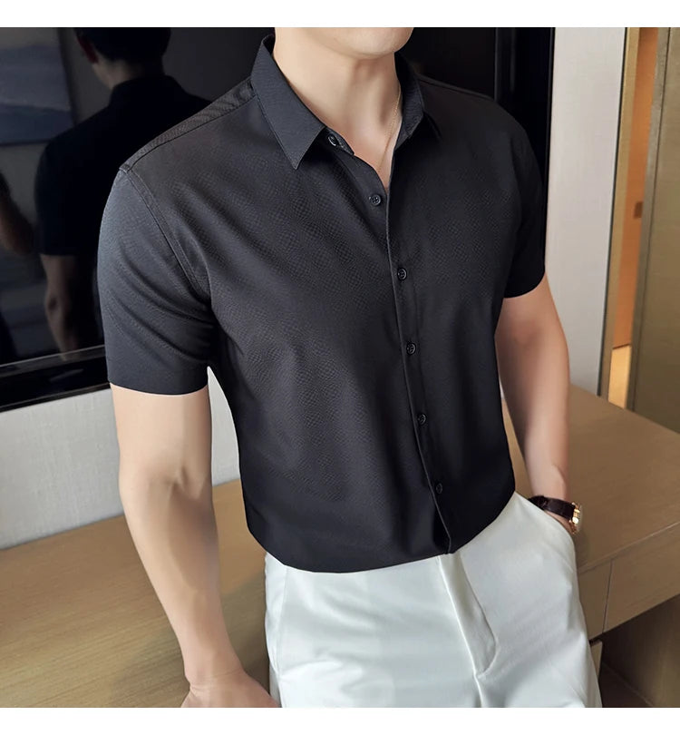 High Quality Ice Silk Elastic Jacquard Shirts 2024 Summer New Men Casual Short Sleeved Slim Fit Business Versatile Shirt 4XL-M