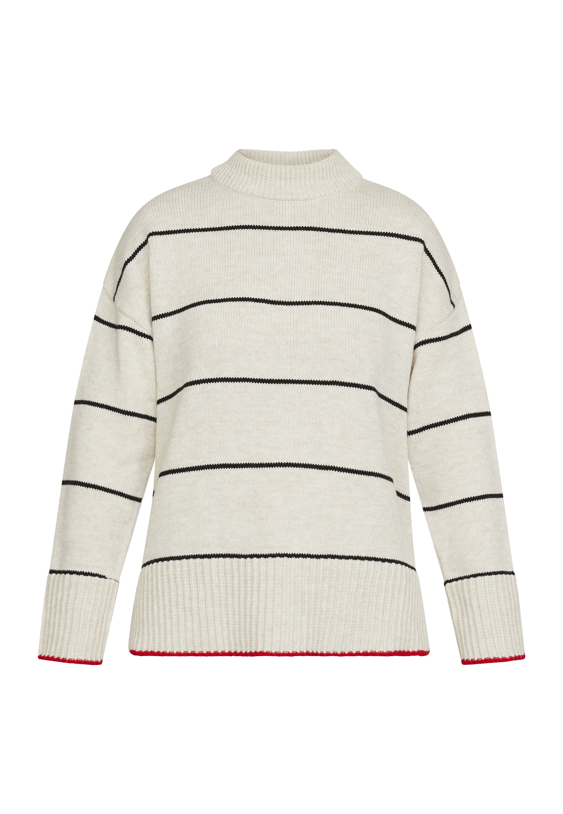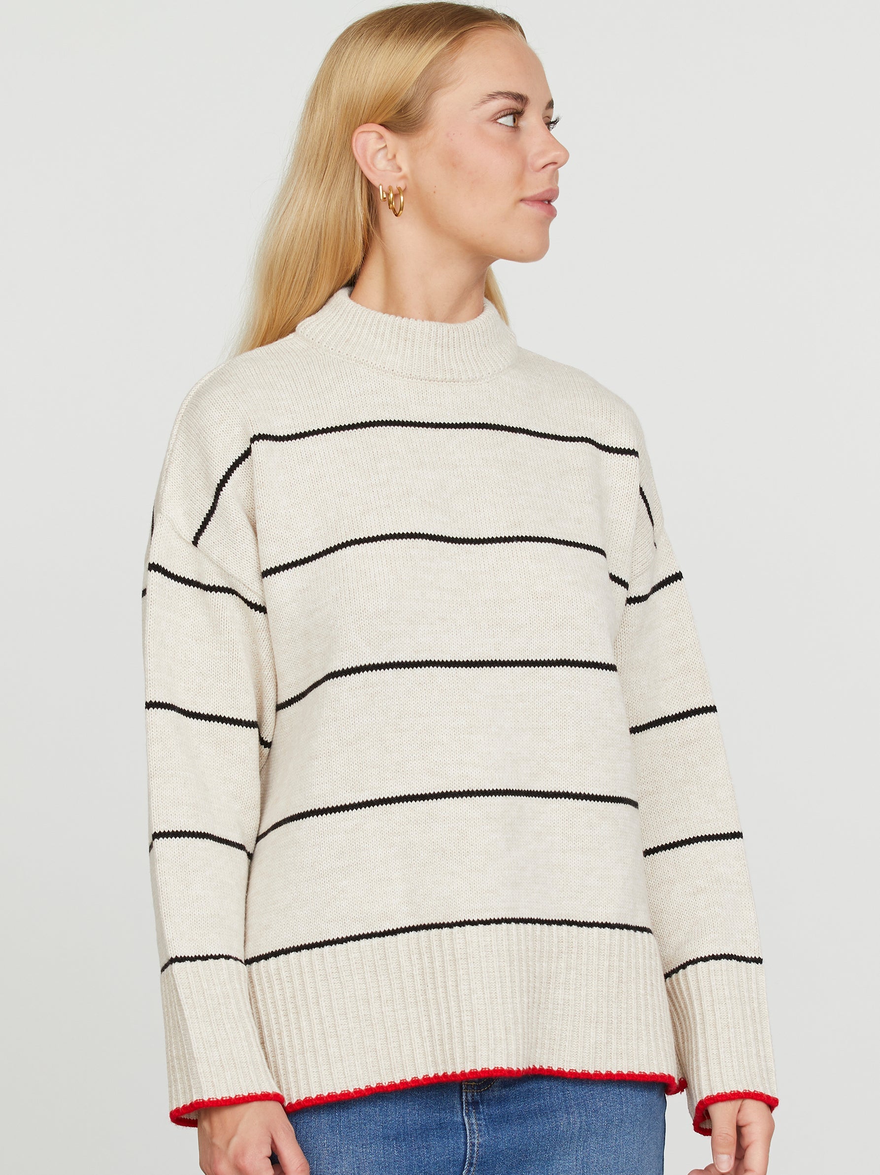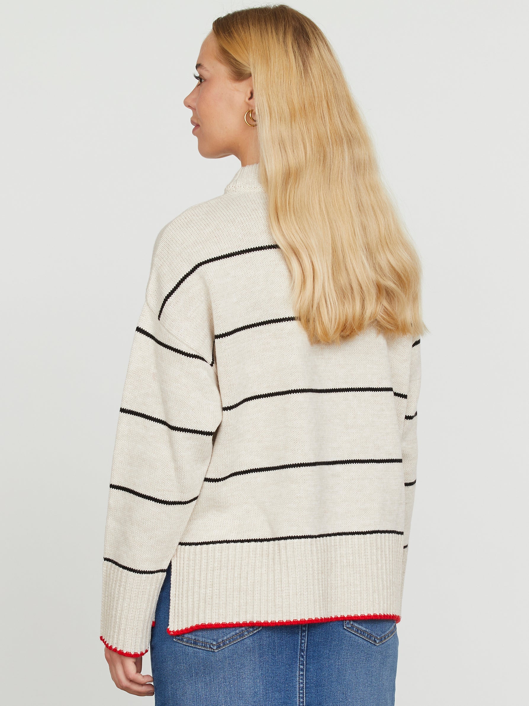 En hyggelig oversize strik med klassiske striber, rund hals og ribbede kanter for et stilfuldt og komfortabelt look.