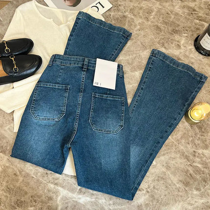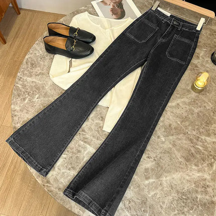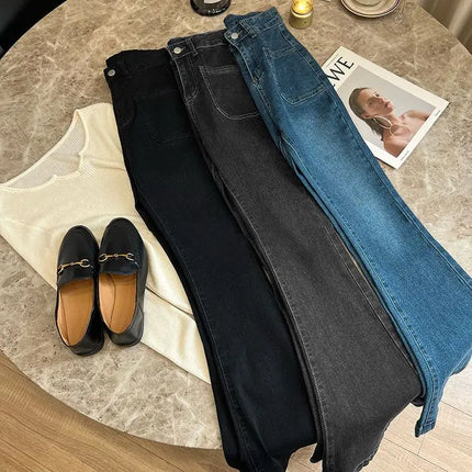 New High Waist Trousers Loose Washed Jeans Pockets Slim Denim Flare Classic Women Vintage Stretch Straight Trousers All-match