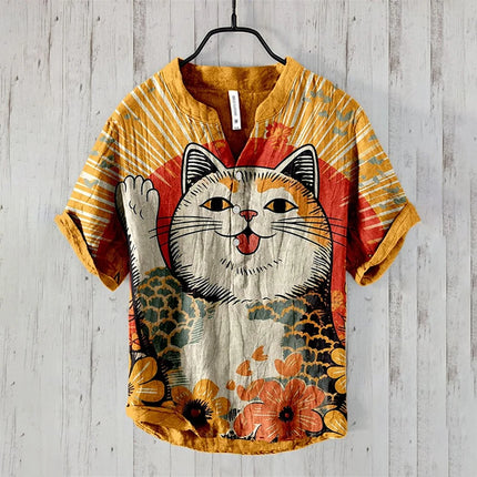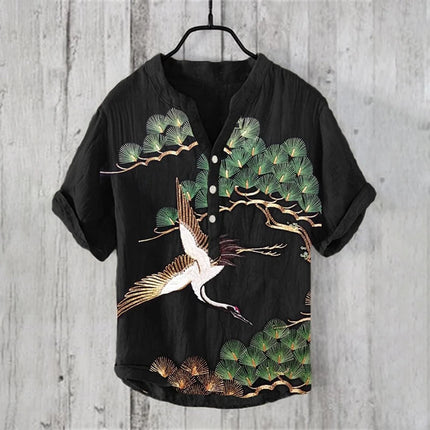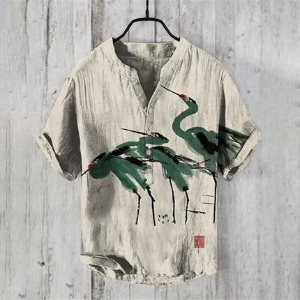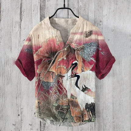 New V-neck red-crowned crane 3D linen printing foreign trade fashion casual loose bamboo linen shirt top
