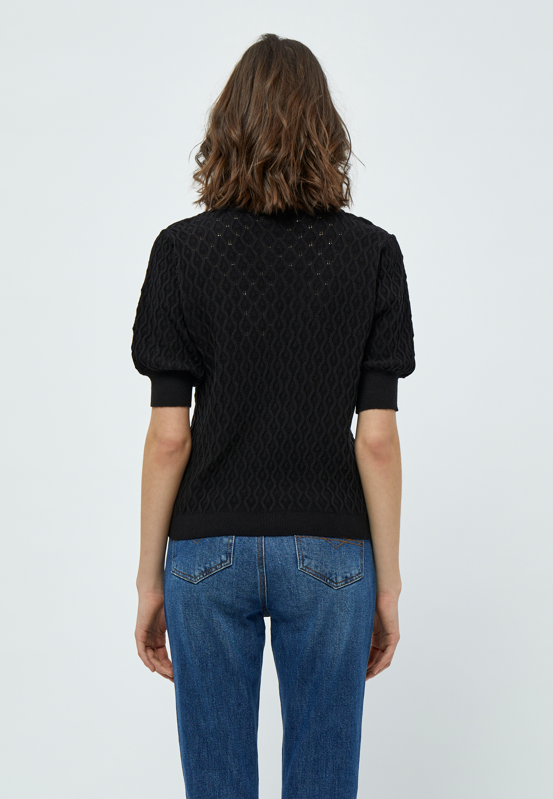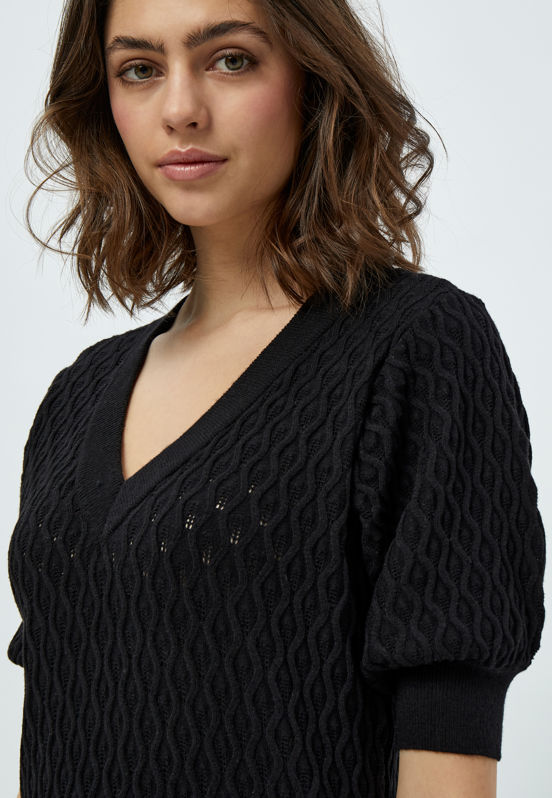 T-shirten har en flatterende v-halsudskæring og halve ærmer med let puff, som giver et feminint og moderne udtryk.