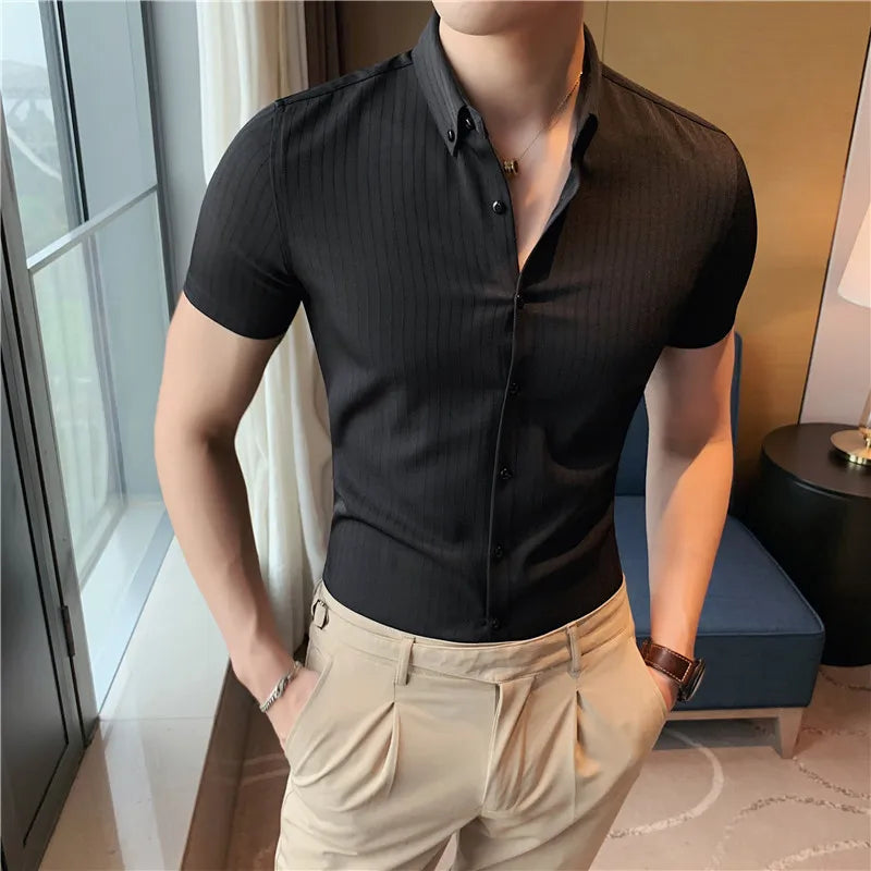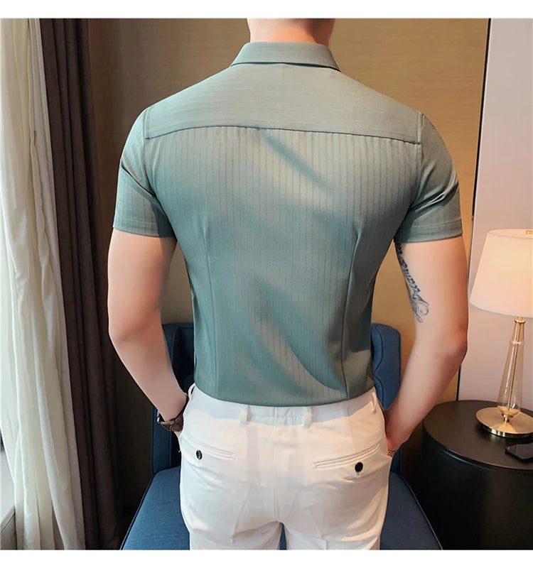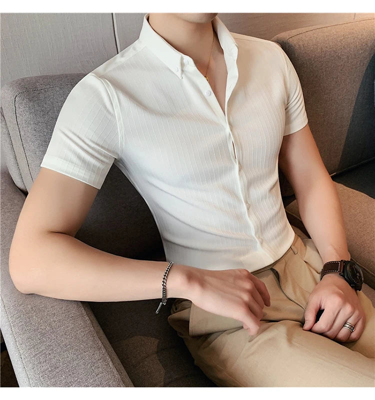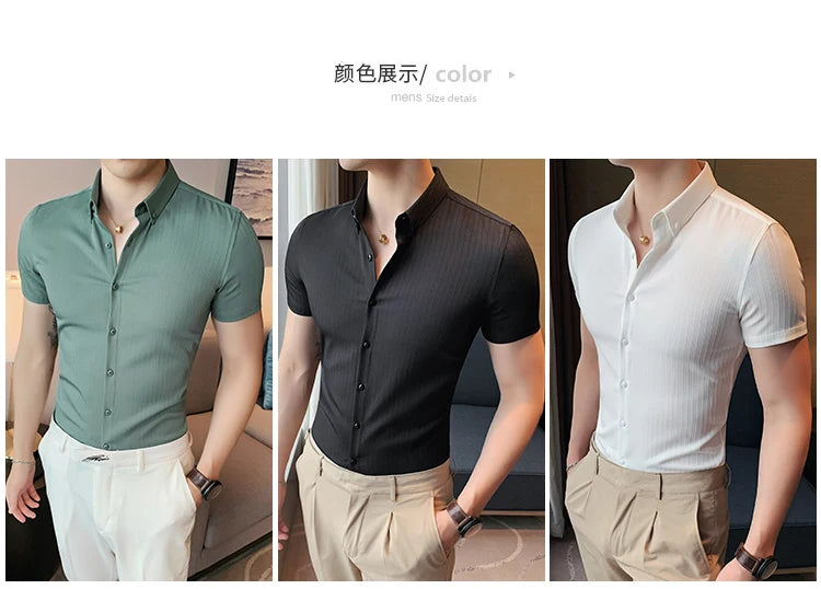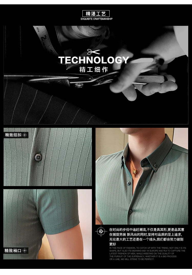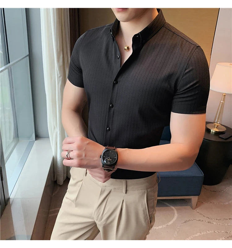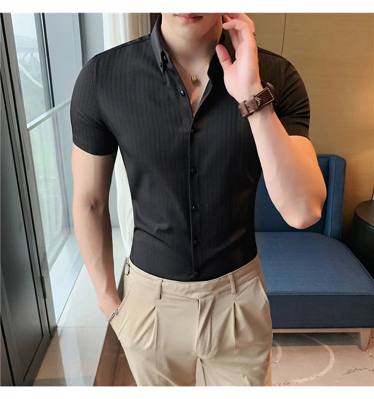 Plus Size 4XL-M Summer Mens Dark Striped Shirts Short Sleeve Fashion 2022 Korean Slim Fit Casual Business Formal Wear Blouse