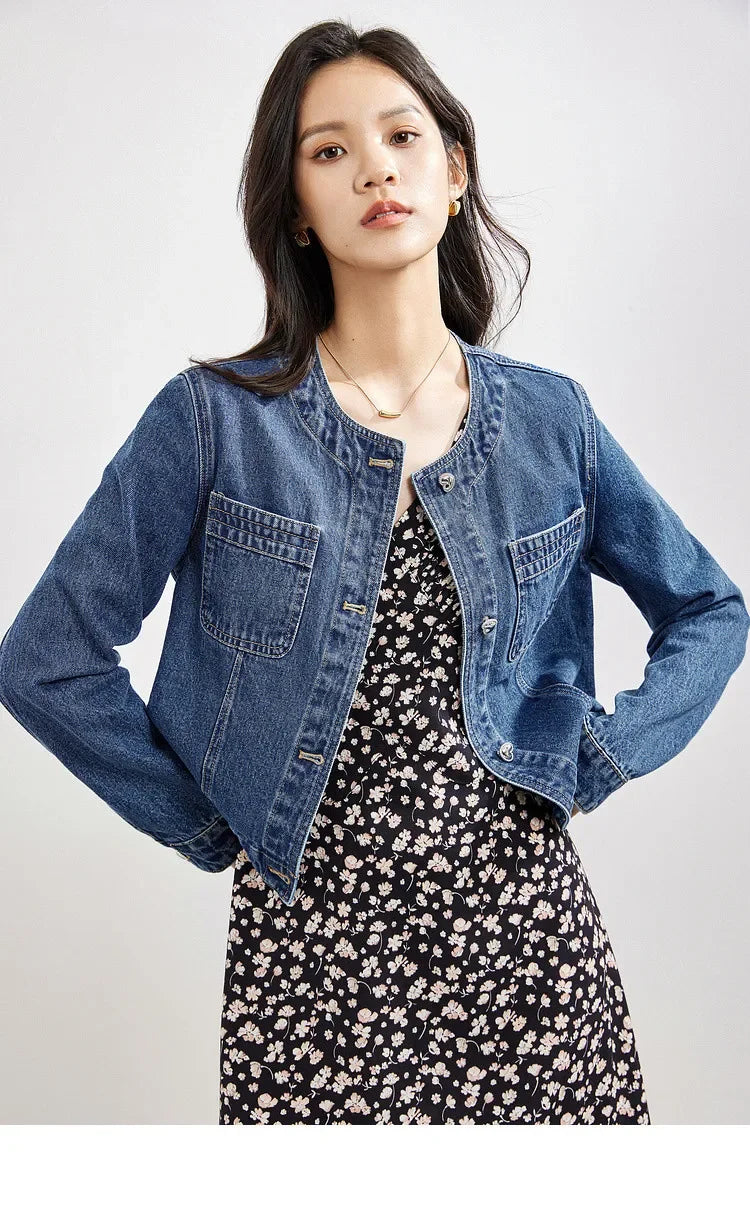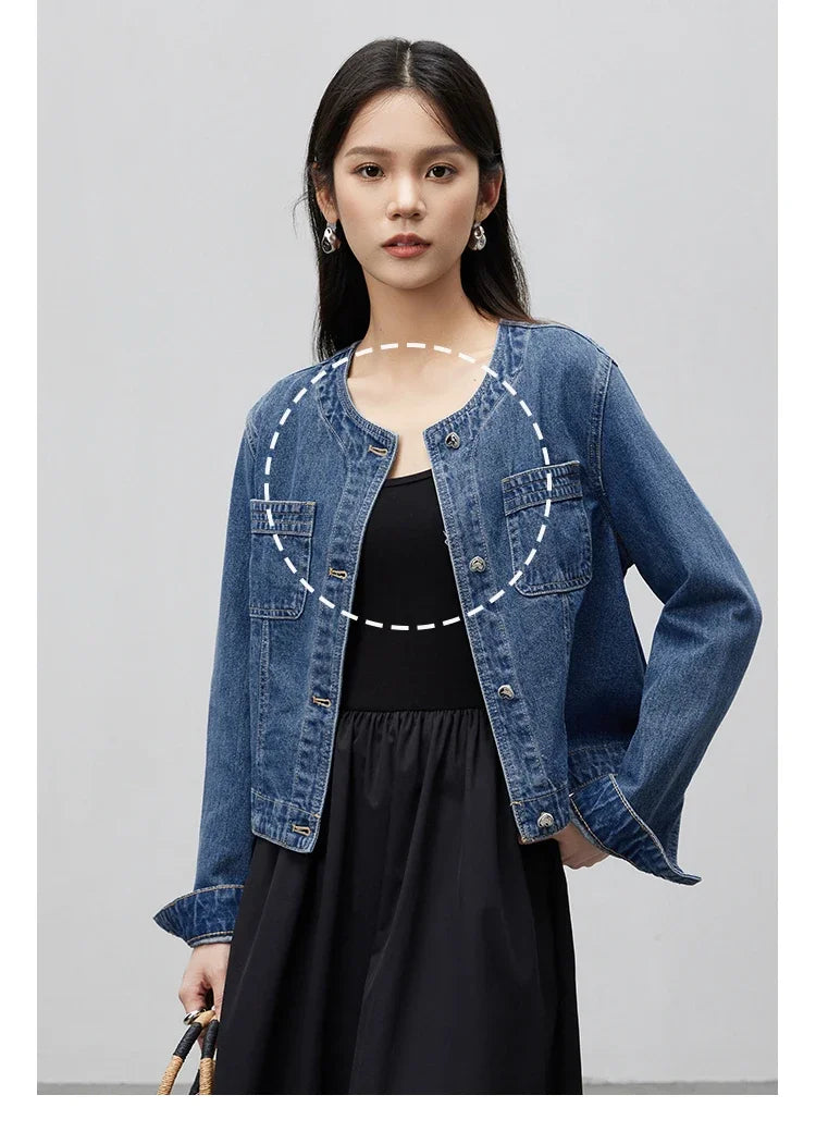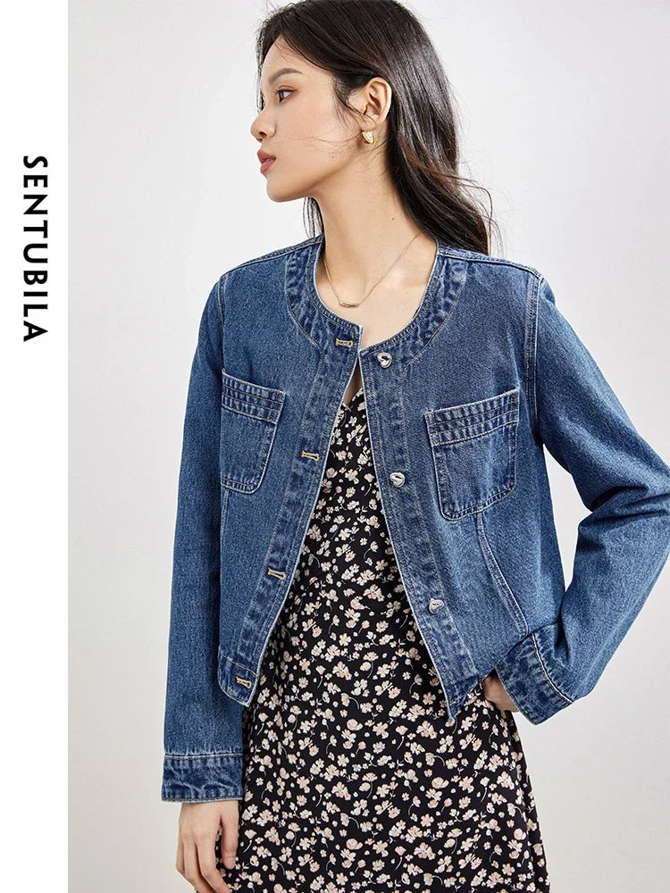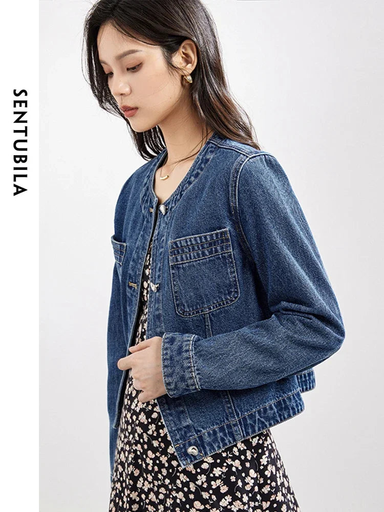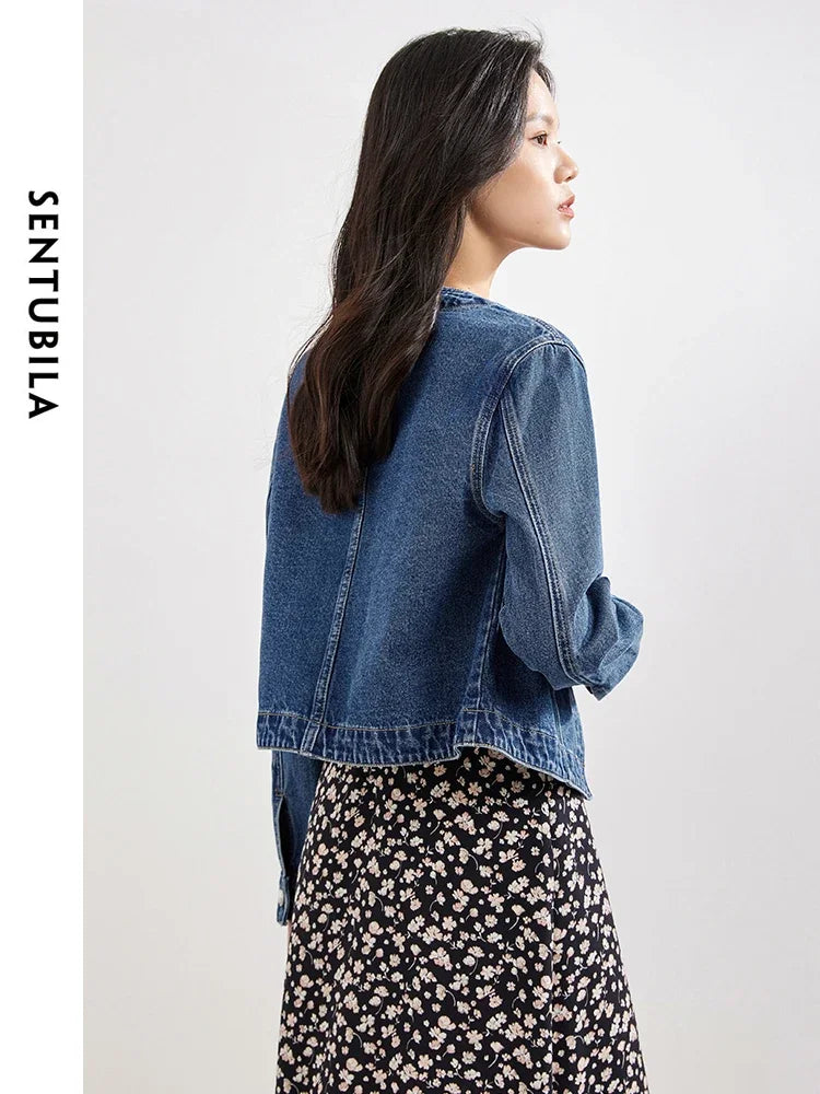 SENTUBILA Pure Cotton Denim Jacket Women 2025 Spring Autumn Outerwear Round Neck Pockets Cropped Jeans Coat Womans W41W53402