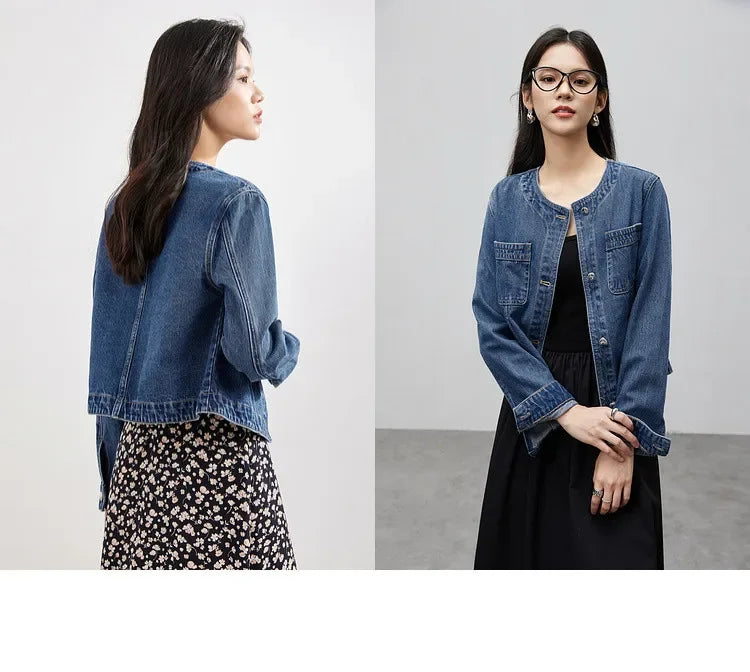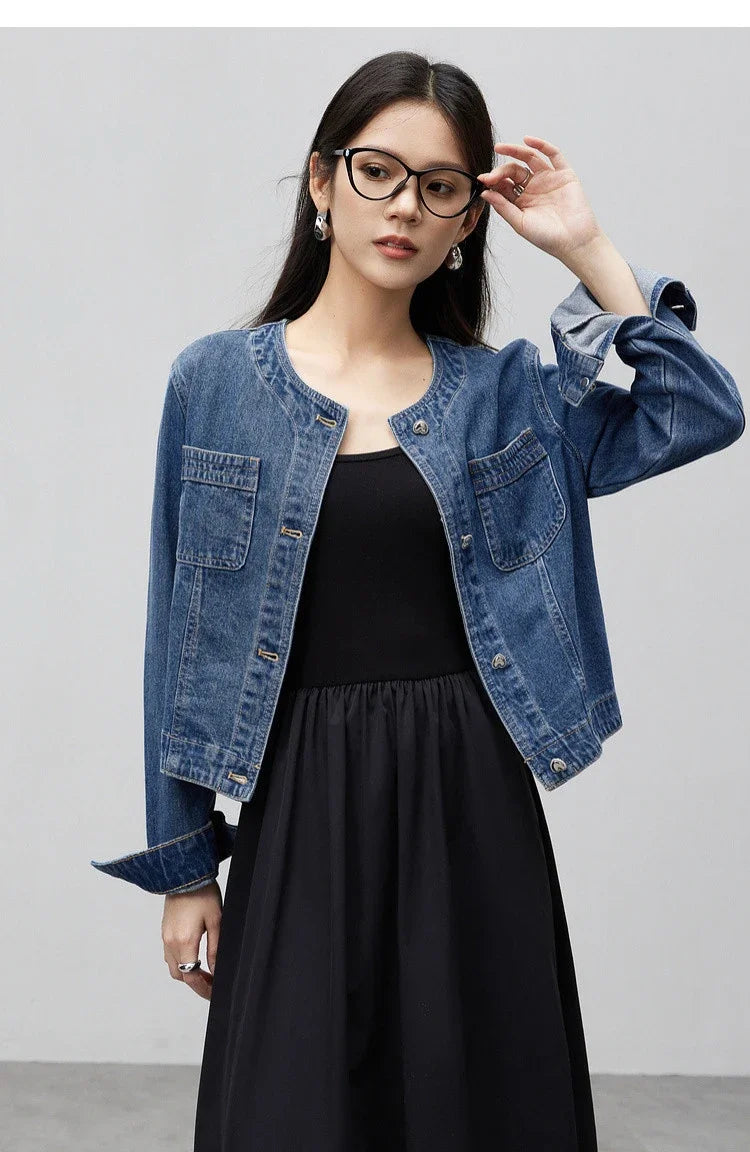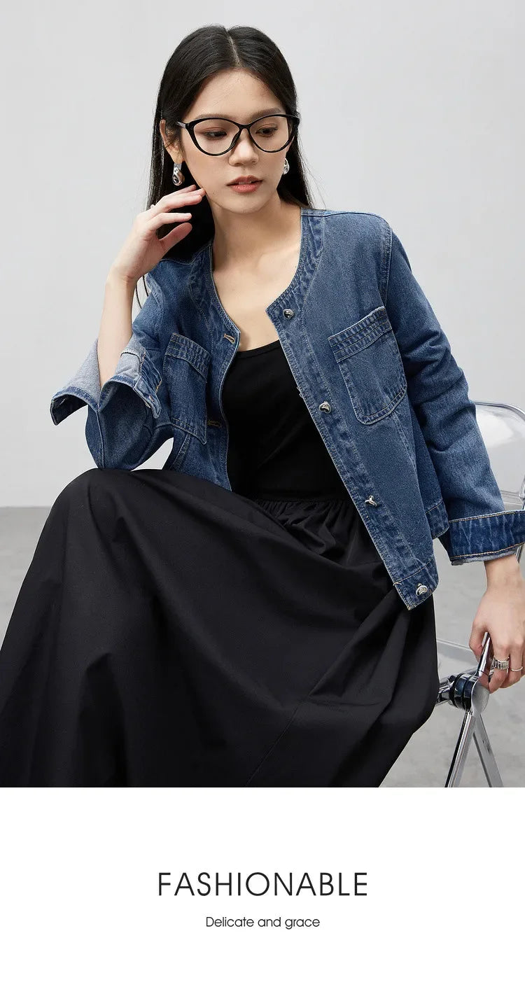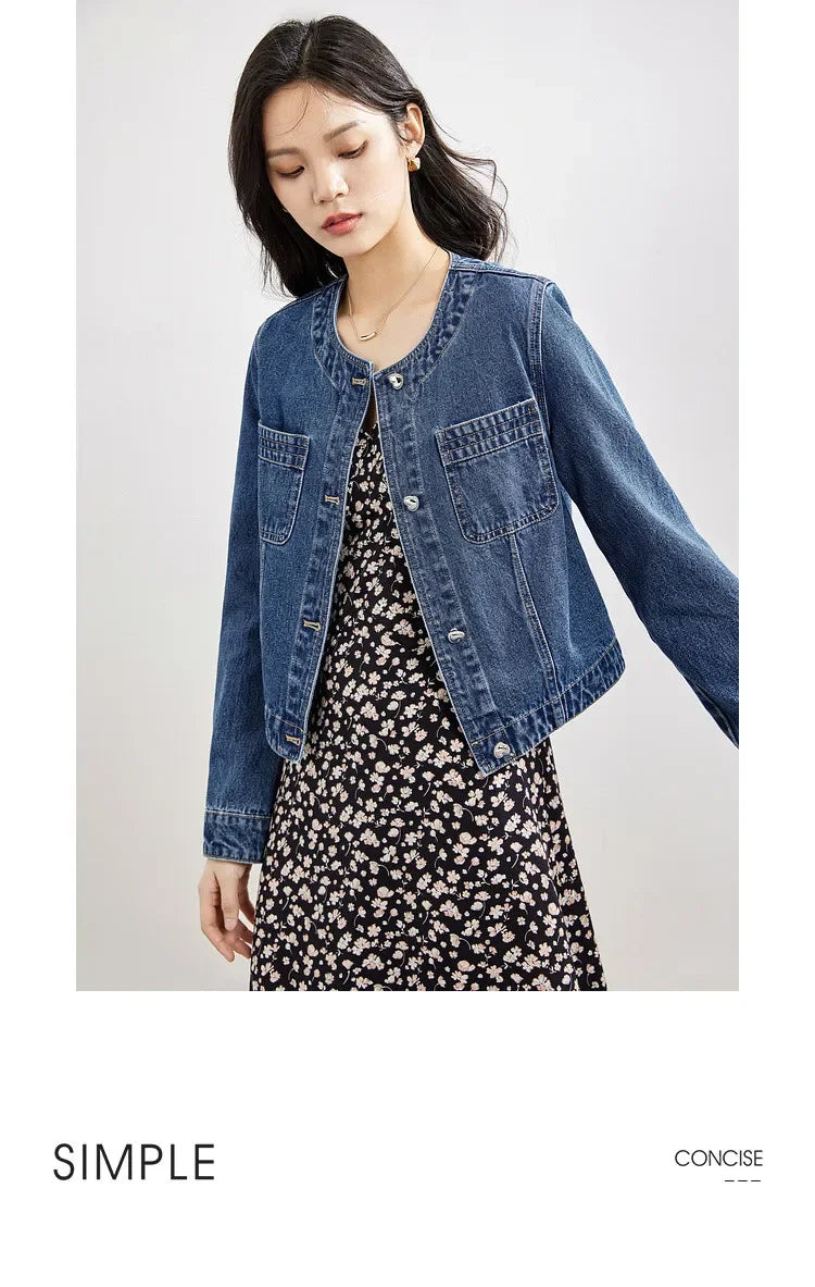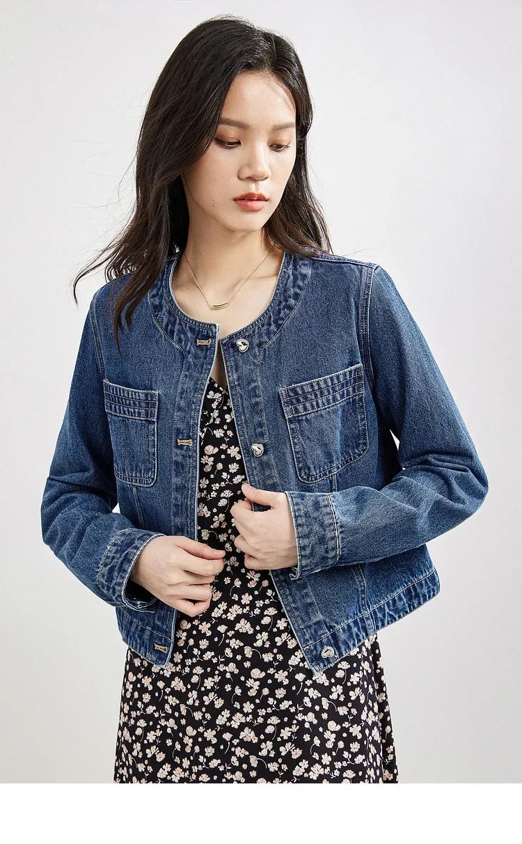 SENTUBILA Pure Cotton Denim Jacket Women 2025 Spring Autumn Outerwear Round Neck Pockets Cropped Jeans Coat Womans W41W53402