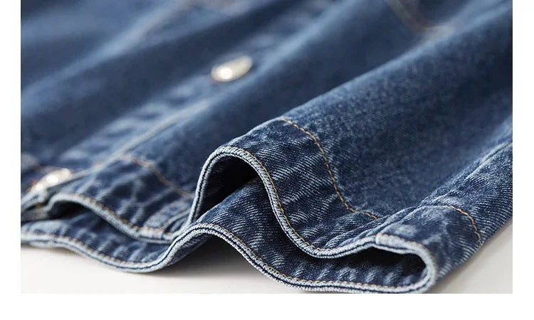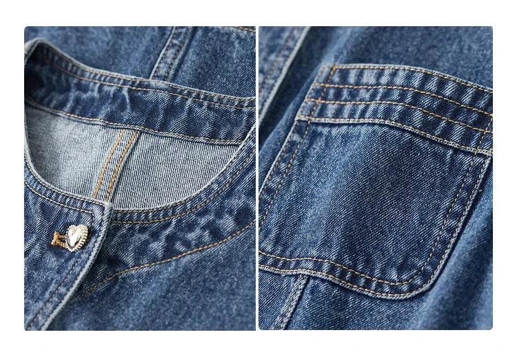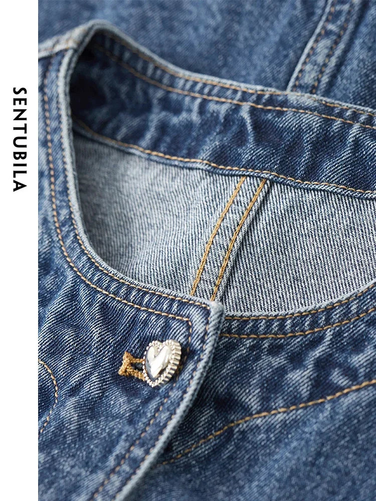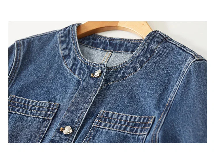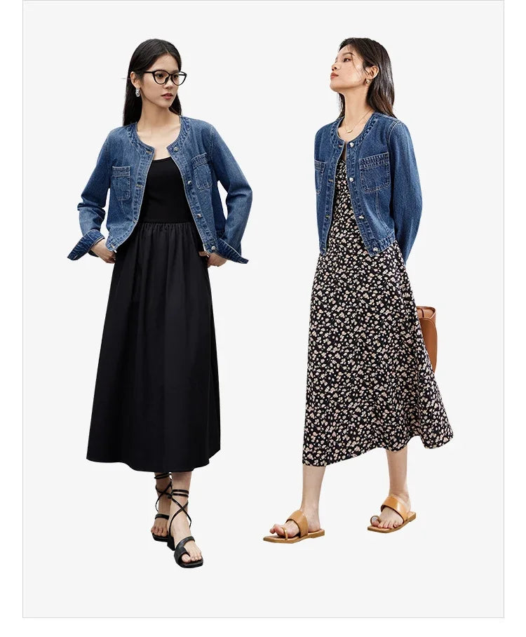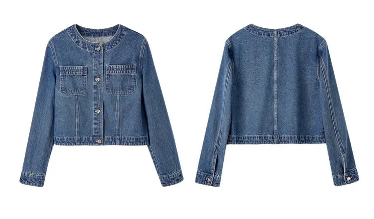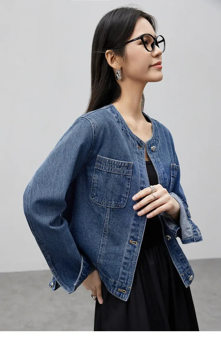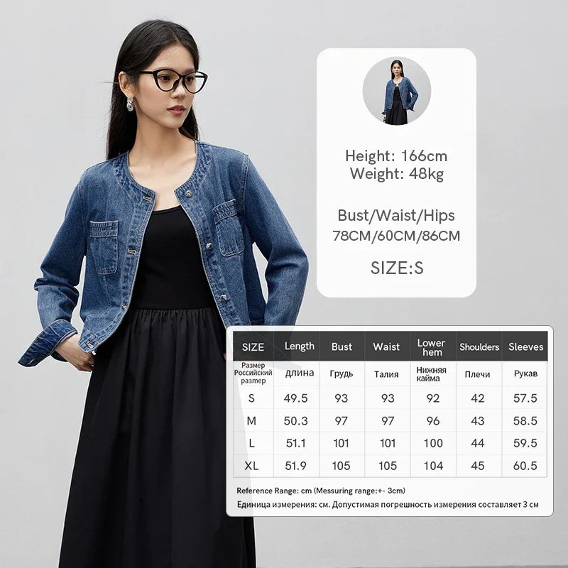 SENTUBILA Pure Cotton Denim Jacket Women 2025 Spring Autumn Outerwear Round Neck Pockets Cropped Jeans Coat Womans W41W53402