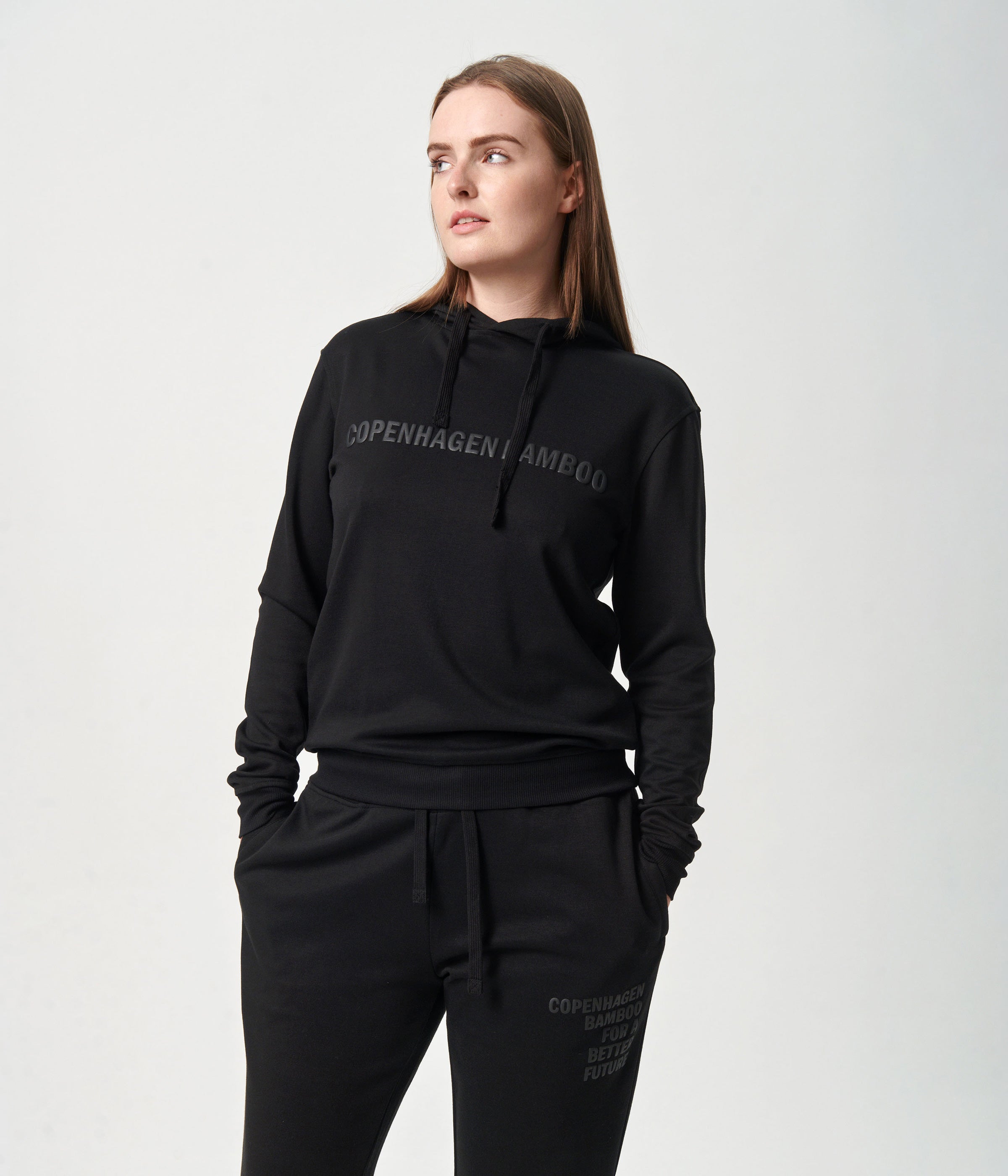 Sort unisex hoodie med logo print hen over brystet. Denne hoodie er fremstillet i bambusviskose, økologisk bomuld og polyester.