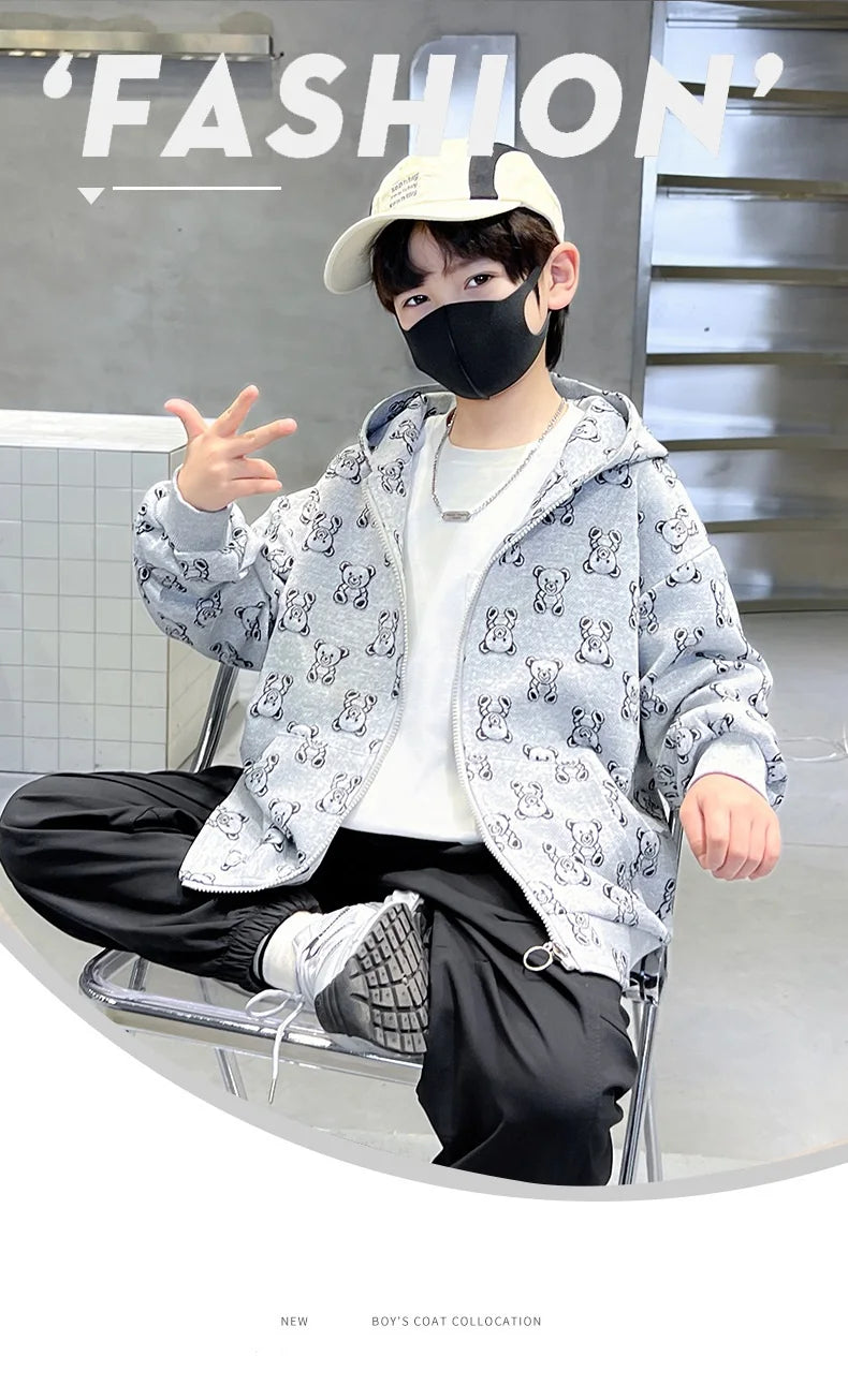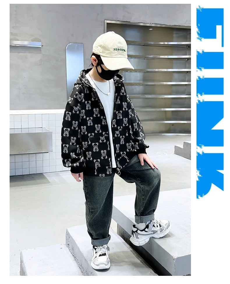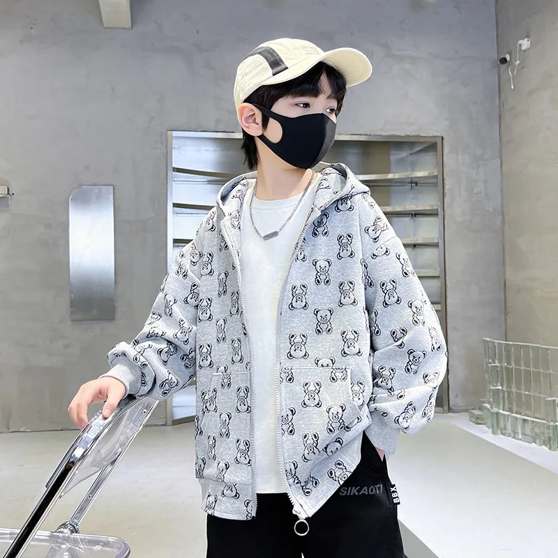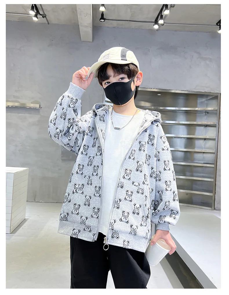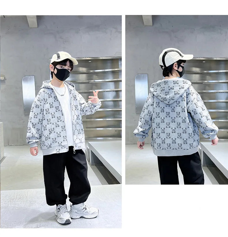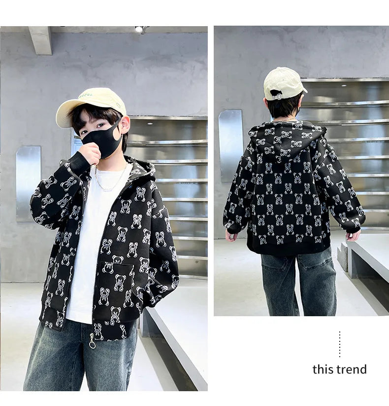 Spring Autumn Boys All-Over Printed Zip Sweatshirt Jackets School Kids Track Hoodie Coat Child Outfit Tops Workout Jumper 3-14Yr