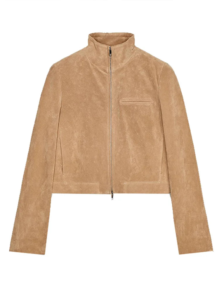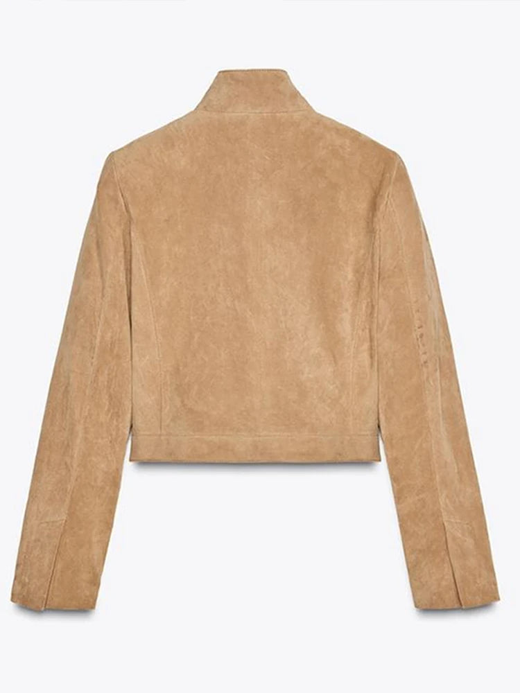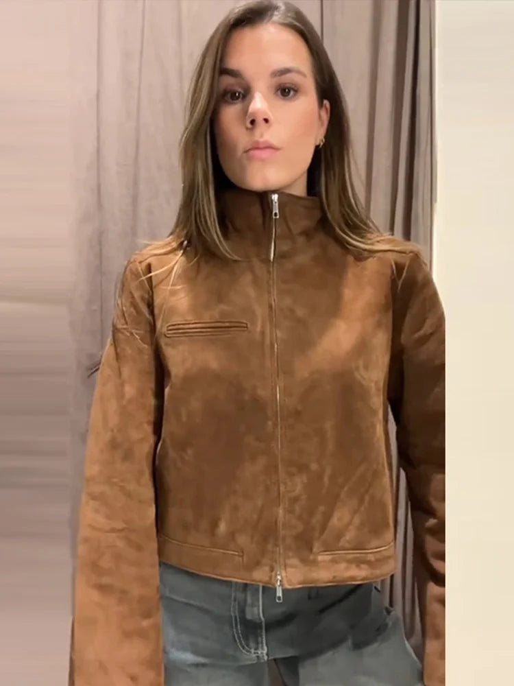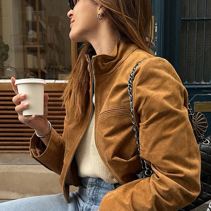 Suede Leather Short Jacket Coat Zipper Stand Collar Vintage Casual Motorcycle Jackets Baggy Front Shoulder Women Outwear Top New
