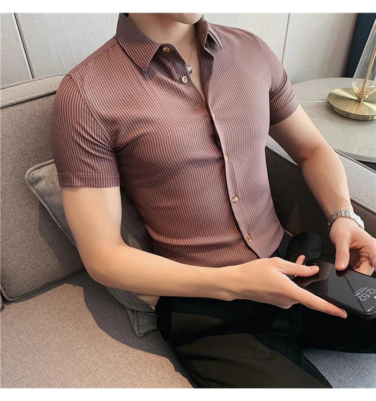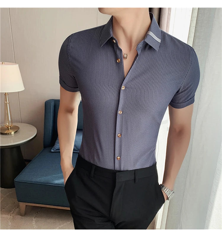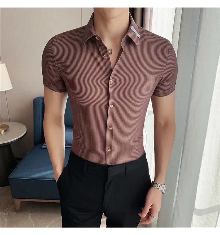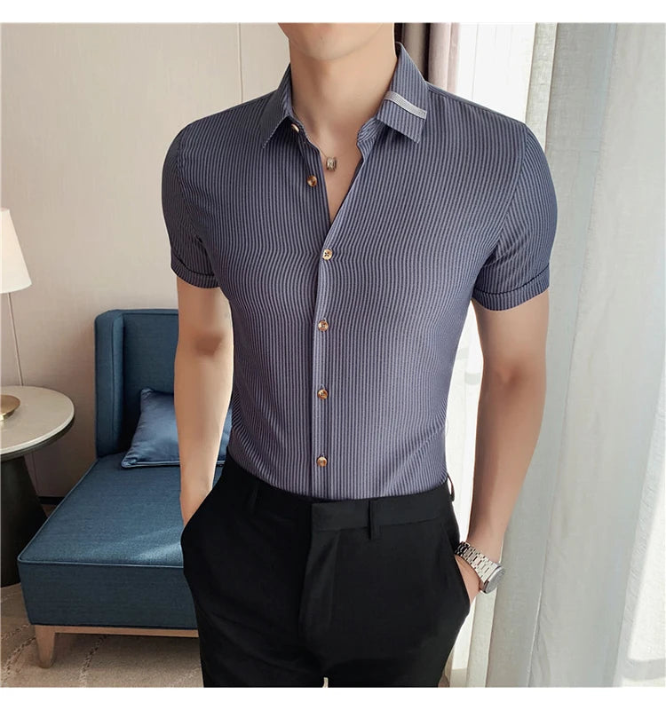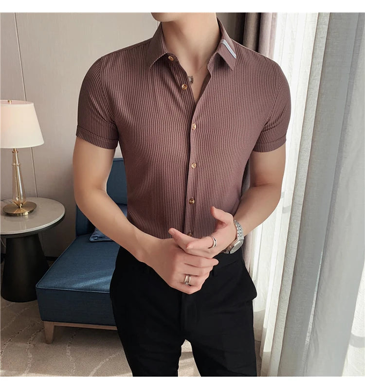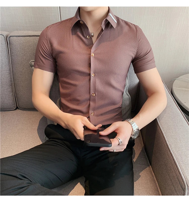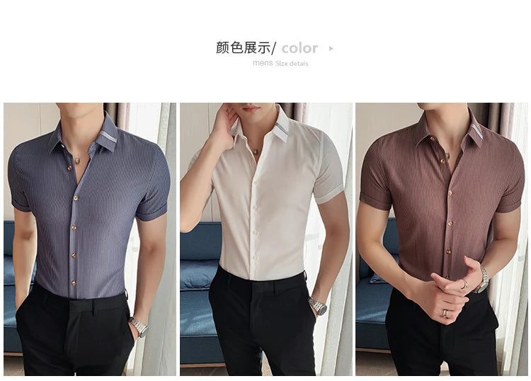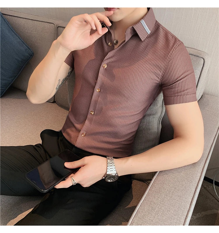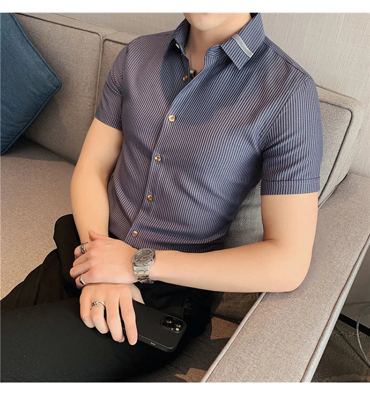 Summer High Quality Striped Ribbon Short Sleeve Shirt Men's Slim Fit Business Formal Wear Blouse Streetwear Plus Size 4XL-M