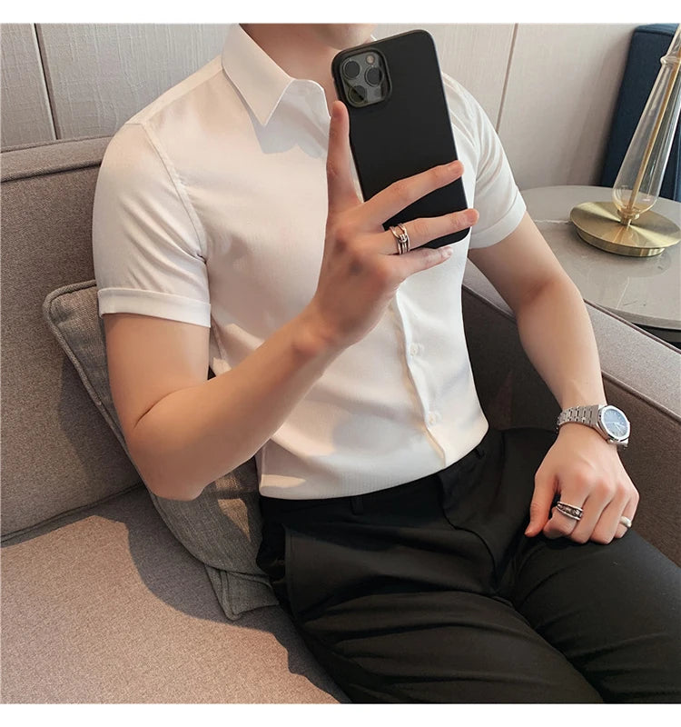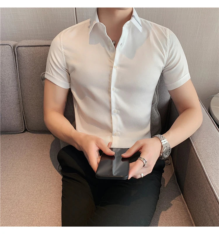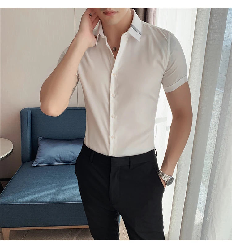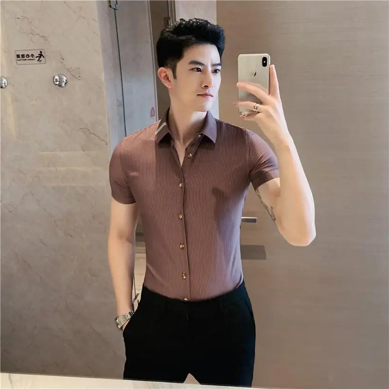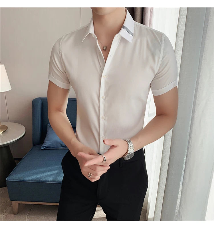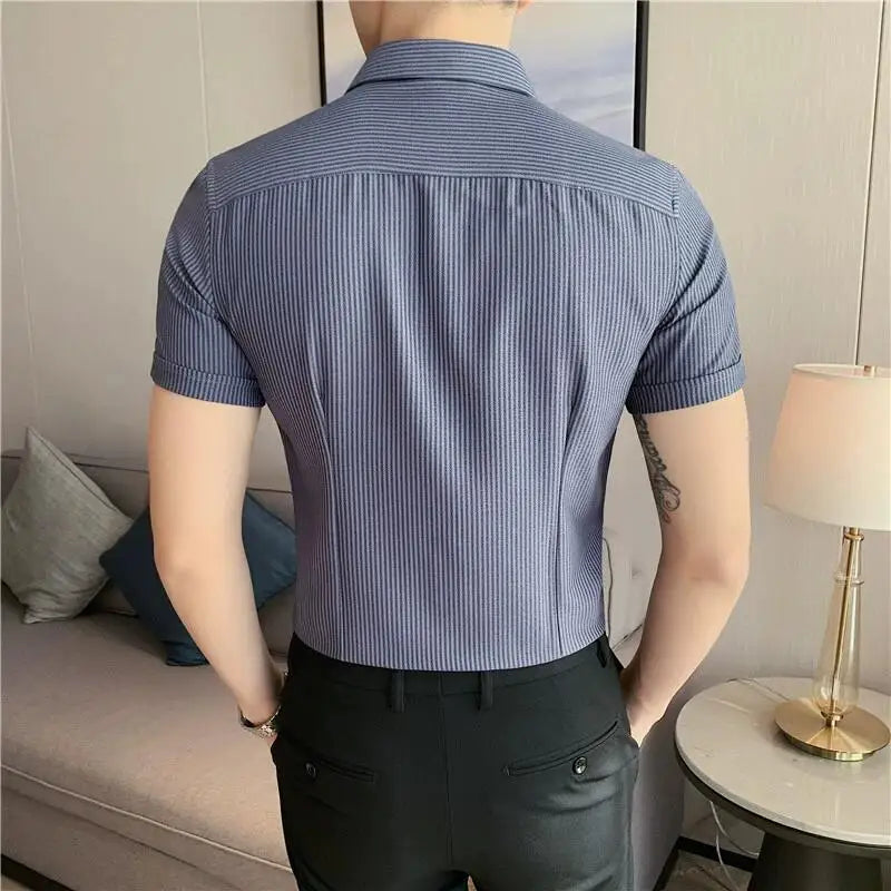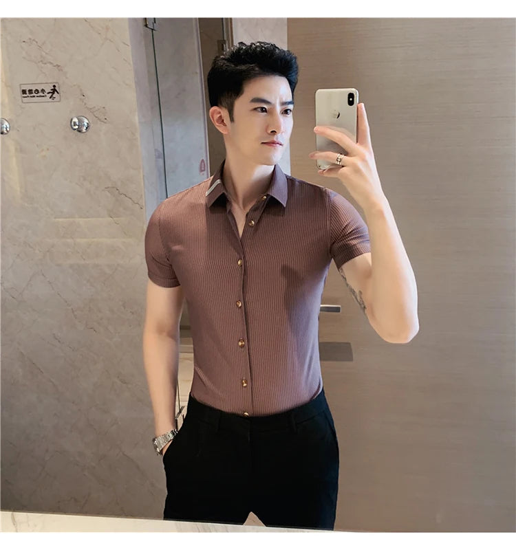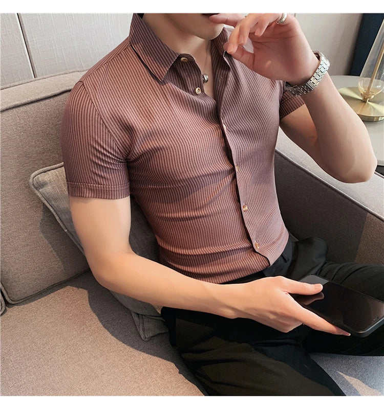 Summer High Quality Striped Ribbon Short Sleeve Shirt Men's Slim Fit Business Formal Wear Blouse Streetwear Plus Size 4XL-M