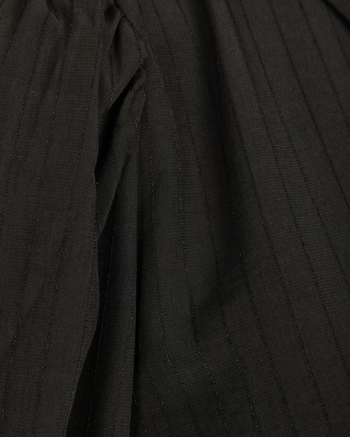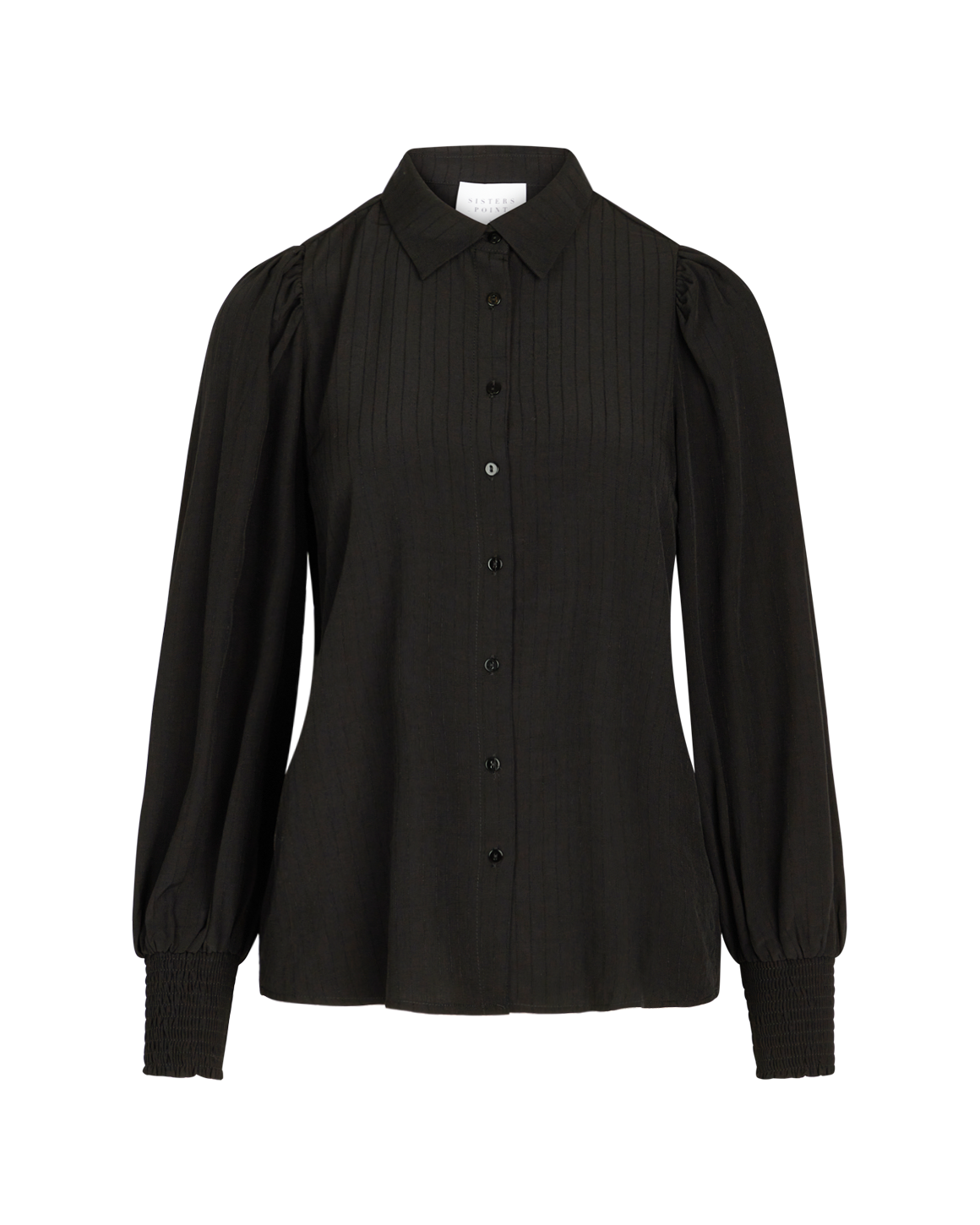 En elegant skjorte i ensfarvet sort med diskrete tone-i-tone striber, der giver et sofistikeret spil i stoffet. Skjorten har en feminin V-hals og lange ærmer afsluttet med smock, som tilfører et let og moderne udtryk. Perfekt både til hverdagsbrug og mere festlige lejligheder.