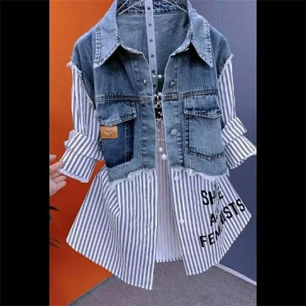 Women Denim Jacket Fake Two Denim Shirts 2025 New Spring Summer Autumn Casual Fashion Joker Stitching Striped Tops Coat Female