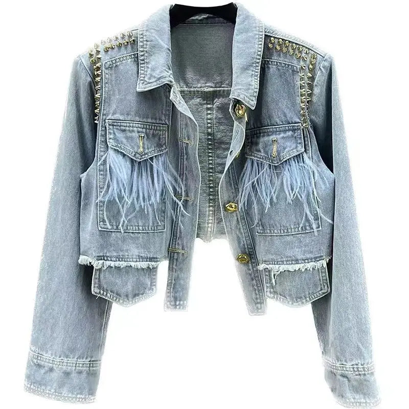 Women's Denim Jacket with Feather Decoration Denim Top, Heavy-duty Willow Nail Irregular Short Denim Coat Top
