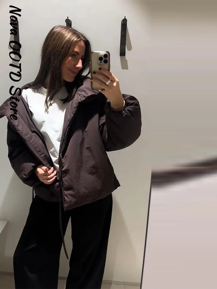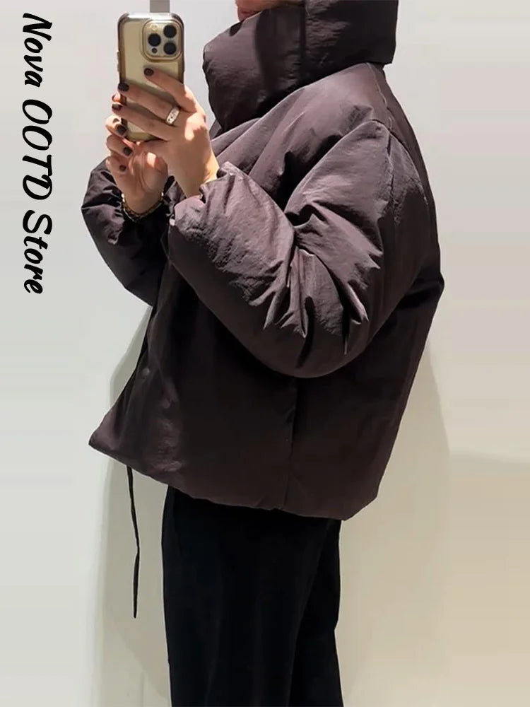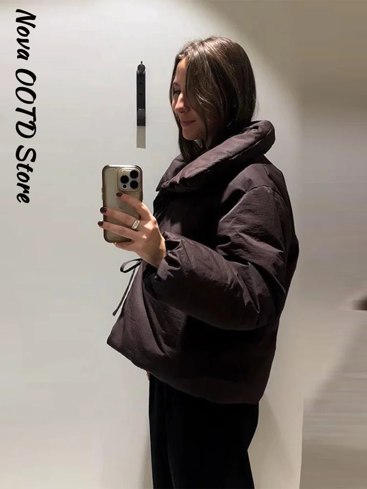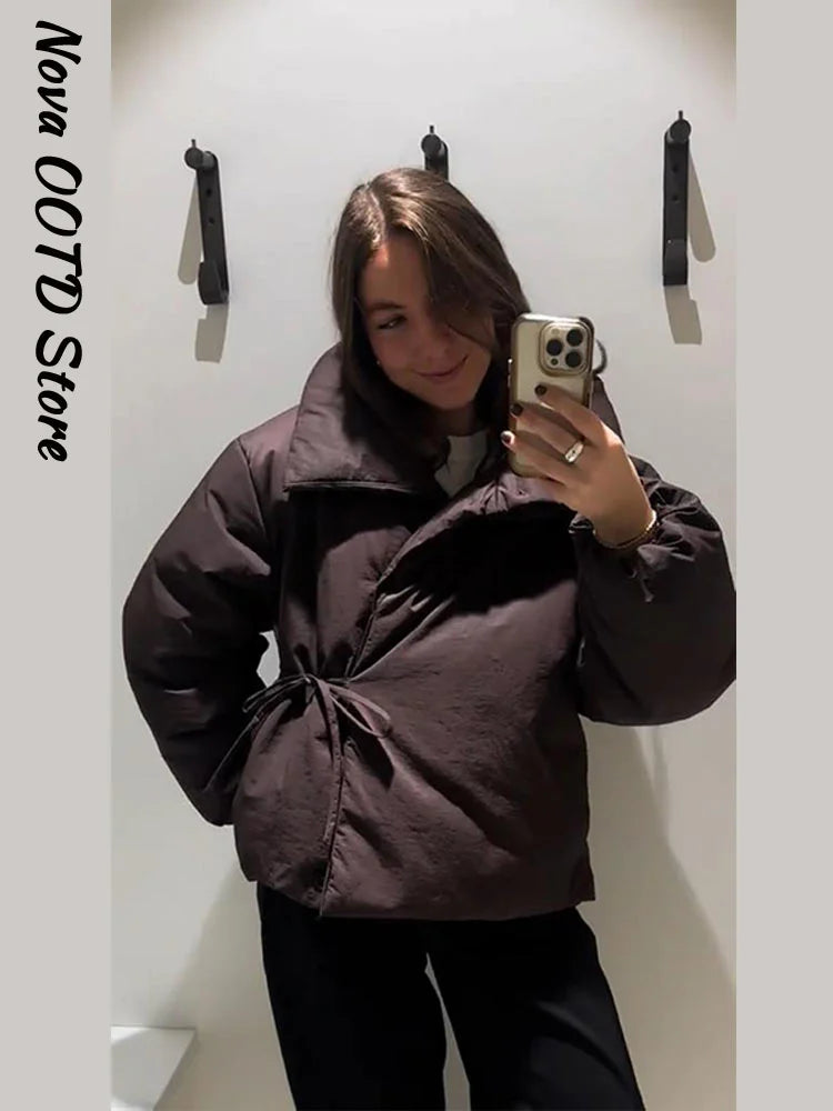 Fashion Lace Up Brown Cotton Jacket Women Loose Stand Collar Full Sleeve Thick Coat 2025 Autumn Winter Lady Warm Street Outwear