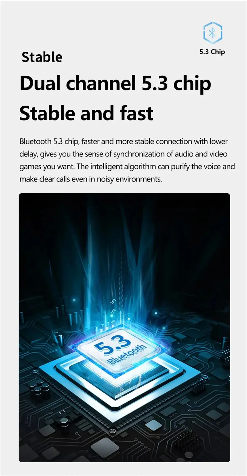 Bluetooth 5.3 chip, faster and more stable connection with lower delay, gives you the sense of synchronization of audio and video games you want. The intelligent algorithm can purify the voice and make clear calls even in noisy environments.
